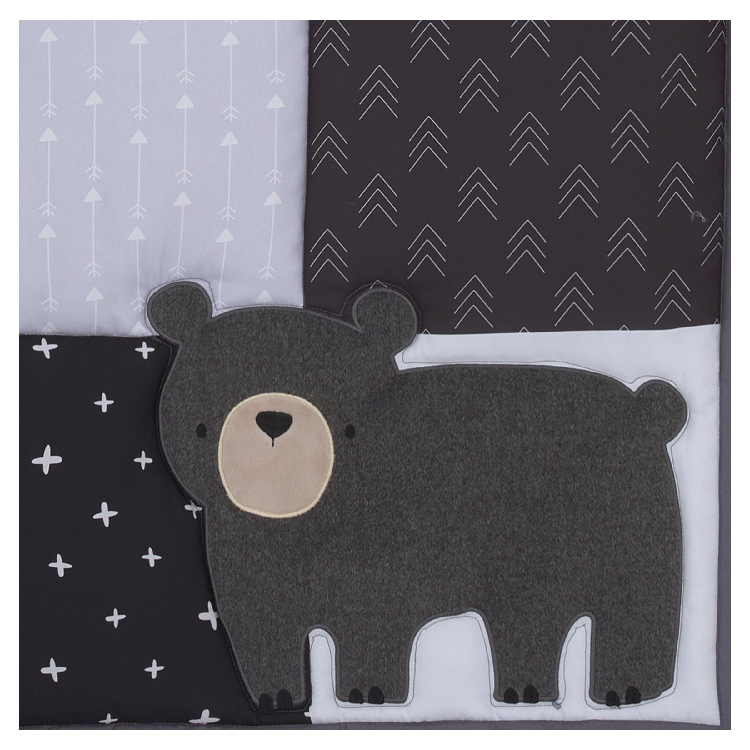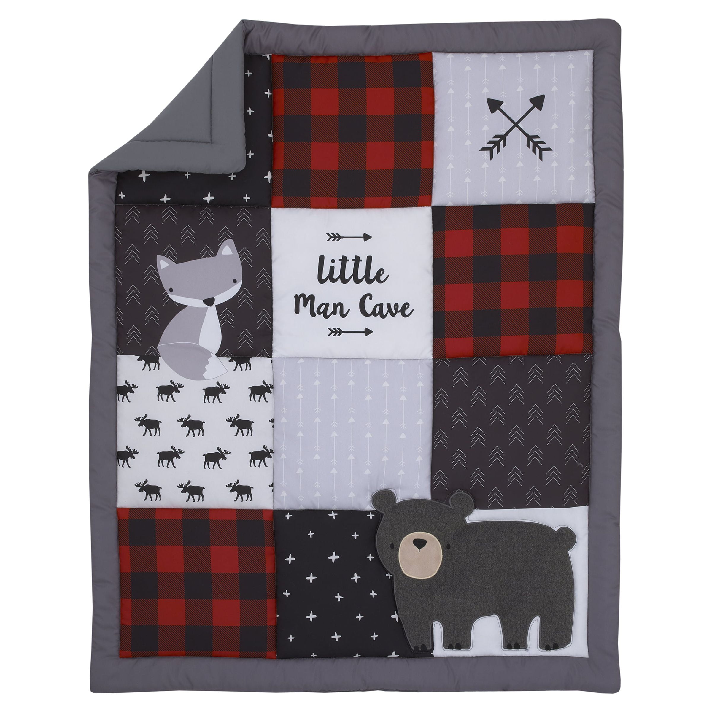 Patchwork design features fox and bear with moose, stars, buffalo check and arrows The 3 piece crib set Includes a comforter, fitted crib sheet and crib skirt Designed in shades of grey, red, black and ivory