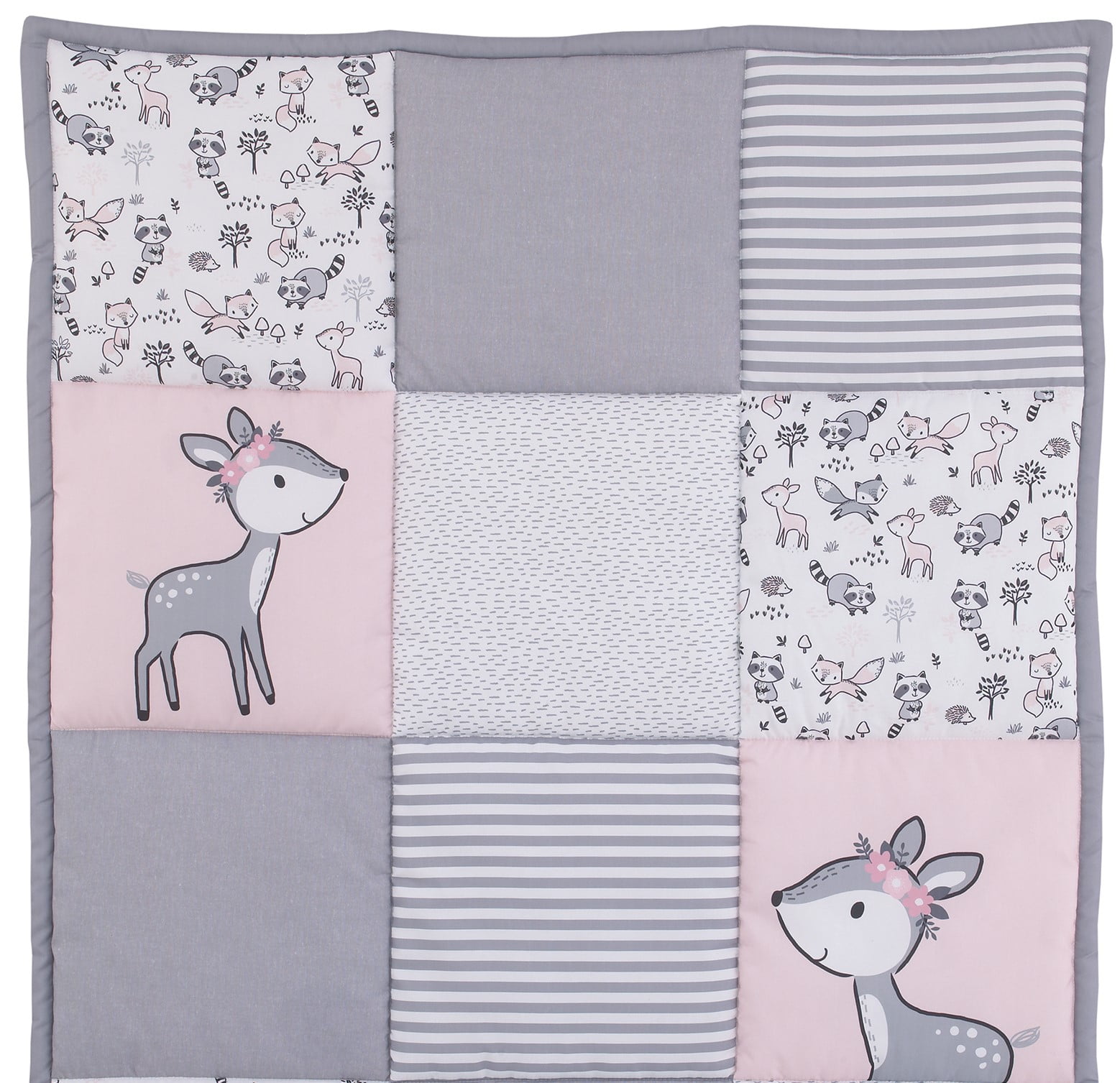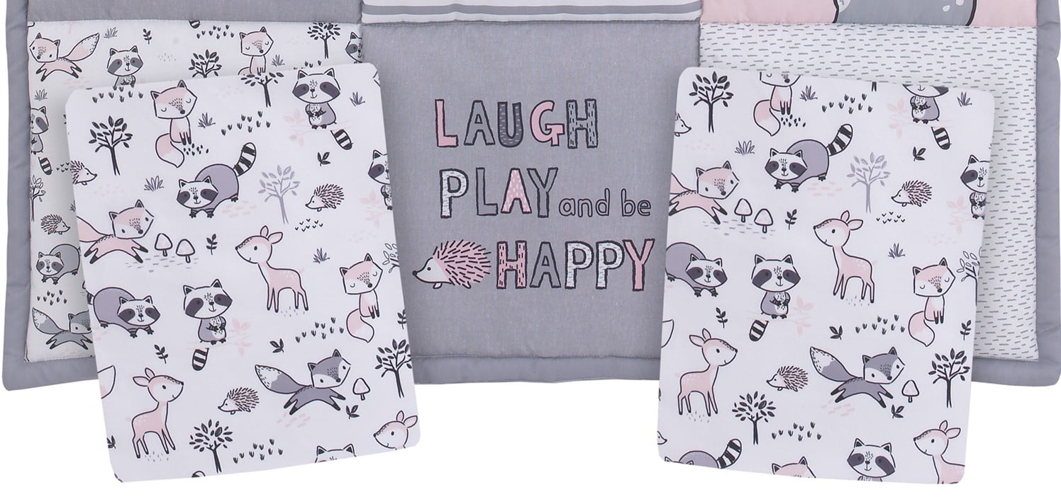 Little Love by NoJo Sweet Deer 3-Piece Mini Portacrib Set includes a comforter and two fitted crib sheets. Patchwork design features woodland critters in pink, gray and black colors. Fits a Mini Porta Crib using a 24 x 38″ mattress. Machine washable for easy care
