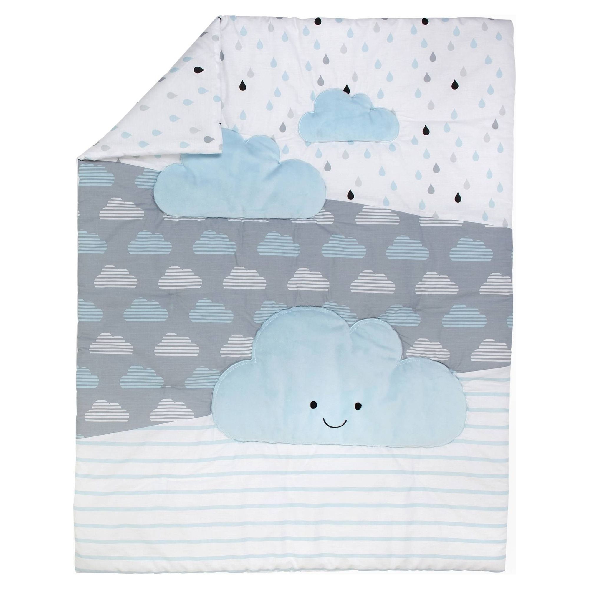 Let the love sprinkle down with the Little Love by NoJo Happy Clouds 5pc crib bedding set! The convenient set includes an appliqued comforter, 2 crib sheets, dust ruffle and wire wall decor. he comforter features a pieced background of blue and white stripes, grey and blue raindrops and blue and white clouds, all accented with an appliqued blue plush cloud. The two fitted crib sheets are two different patterns – one is a light blue and grey raindrop pattern, the other is a striped cloud print on a grey ground. Finish the room with the matching shaped wire wall decor, in the shape of two clouds. All bedding fabric components are 55 percent cotton/45 percent polyester, for a soft feel and easy care. The pefect choice for your little boy’s nursery!