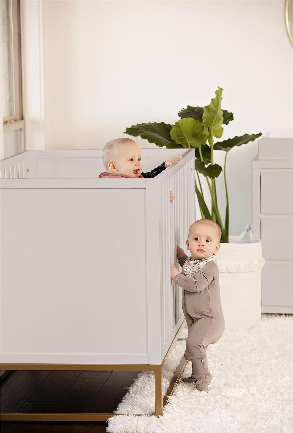 At last you’ve found it! The perfect convertible crib that will not only grow along with your child for years to come but will also exquisitely complement the modern nursery design that you’ve been dreaming of. With its chic gold metal base and clean lines, the Little Seeds Monarch Hill Haven 3-in-1 Convertible Crib will be a sleek addition to your child’s room for years to come. The Haven Convertible Crib begins as a standard baby crib, offering four adjustable mattress heights to prevent little climbers from any escape attempts as they grow. Once your little one is ready for their first big kid bed, simply add the toddler rail (sold separately) to easily convert the crib to a toddler bed. The convertible crib transforms one final time into a day bed with the mattress height in the lowest position and the toddler rail removed. The Monarch Hill Haven 3-in-1 Convertible Crib fits a standard size crib mattress (sold separately), and for further peace of mind, it is JPMA certified and meets ASTM testing standards to ensure your child’s safety. Little Seeds not only creates this and many more on trend baby and kids’ furniture pieces, we also partner with various environmental protection programs to protect pollinator and other wildlife habitats for future generations.