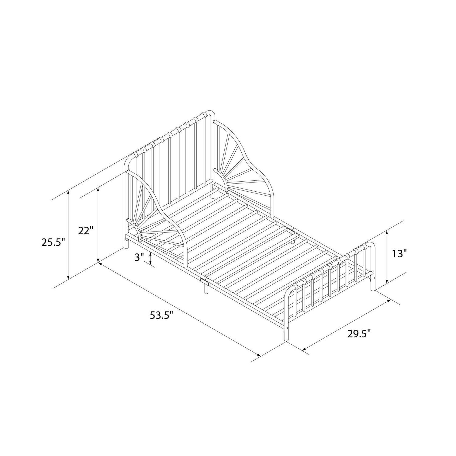 Every dream is bound to be sweeter than the last while sleeping on the Little Seeds Quinn Whimsical Metal Toddler Bed that gives any little boy or girl transitioning out of the nursery crib phase the ideal low-profile height for climbing in and out of bed without assistance. Adorned by ornate rings on the outer rim of the tubular vertical slats lining the rounded corner headboard and footboard, this fanciful toddler bed features sloped dual-sided safety rails with cheerful sunrise detailing that will put a smile on your kid’s face while preventing worrisome bedtime falls. The robust metal platform frame with center legs and metal slatted base with side rails will provide consistent support to keep your child’s mattress secure (standard size crib and toddler bed mattress not included). A thoroughly safe bed for toddlers, the Quinn comes in attractive non-toxic finishes and has been JPMA certified and met all relevant ASTM and CPSC safety specifications. Give your children a fanciful and dreamy space to rest where their imagination flourishes.