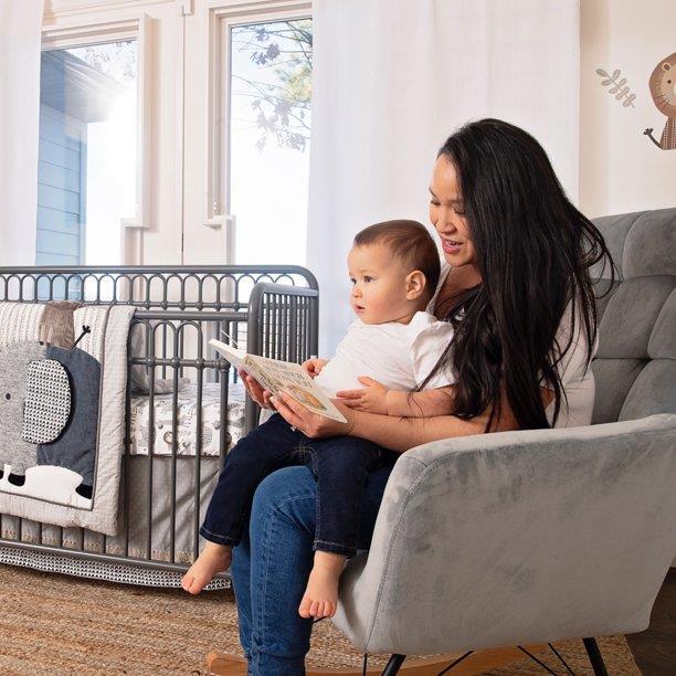 Baby Crib Check. Changing Table Check. Nursery Rocking Chair Wait, is a Nursery Rocking Chair really a necessary piece of nursery furniture We at Little Seeds certainly think that a nursery rocking chair is an integral part of any nursery as the to and from motion of rocking while feeding comforts and relaxes both you and your little one. Let the Little Seeds Raven Upholstered Nursery Rocking Chair soothe both you and your sweet baby in trendsetting style. Beautifully upholstered in easy to clean, durable faux velvet with square tufted detailing on the back seat, this sturdy rocker also features a large, contouring back with metal legs and a wooden base rocker. The Little Seeds Raven Upholstered Nursery Rocking Chair is certain to be a chic and cherished part of your special time with your precious little one. Little Seeds not only creates this and many more on trend baby and kids’ furniture pieces, we also partner with various environmental protection programs to protect pollinator and other wildlife habitats for future generations.