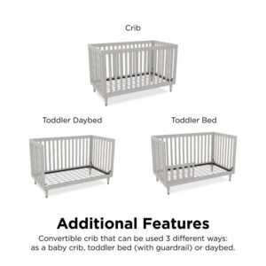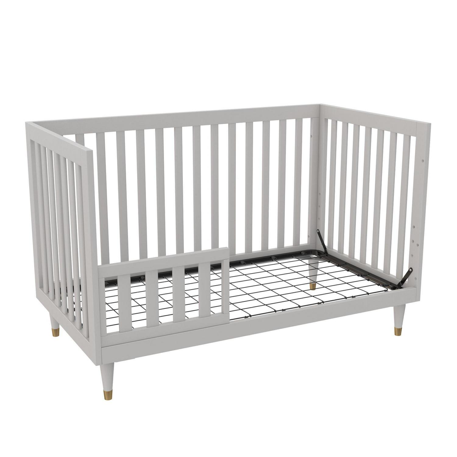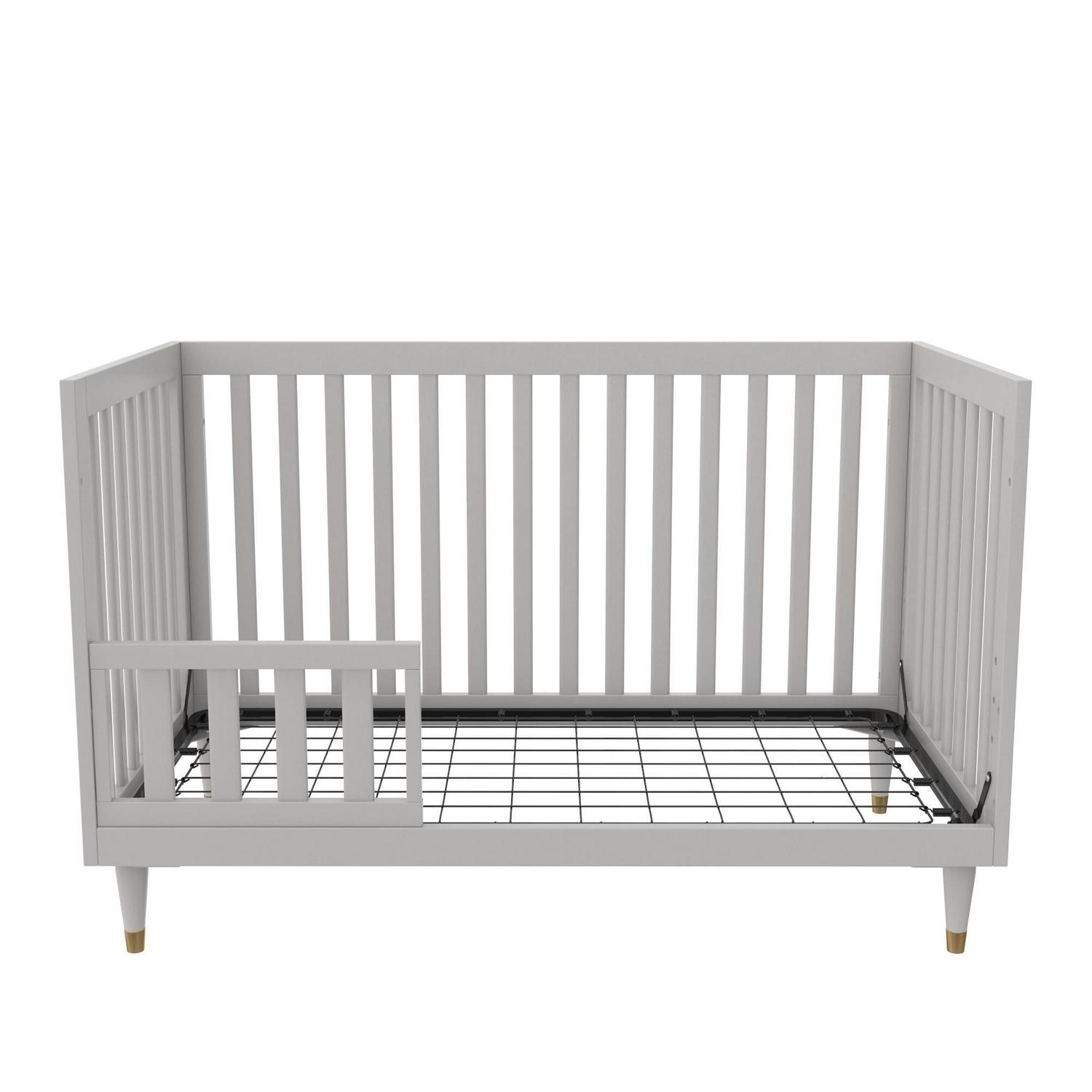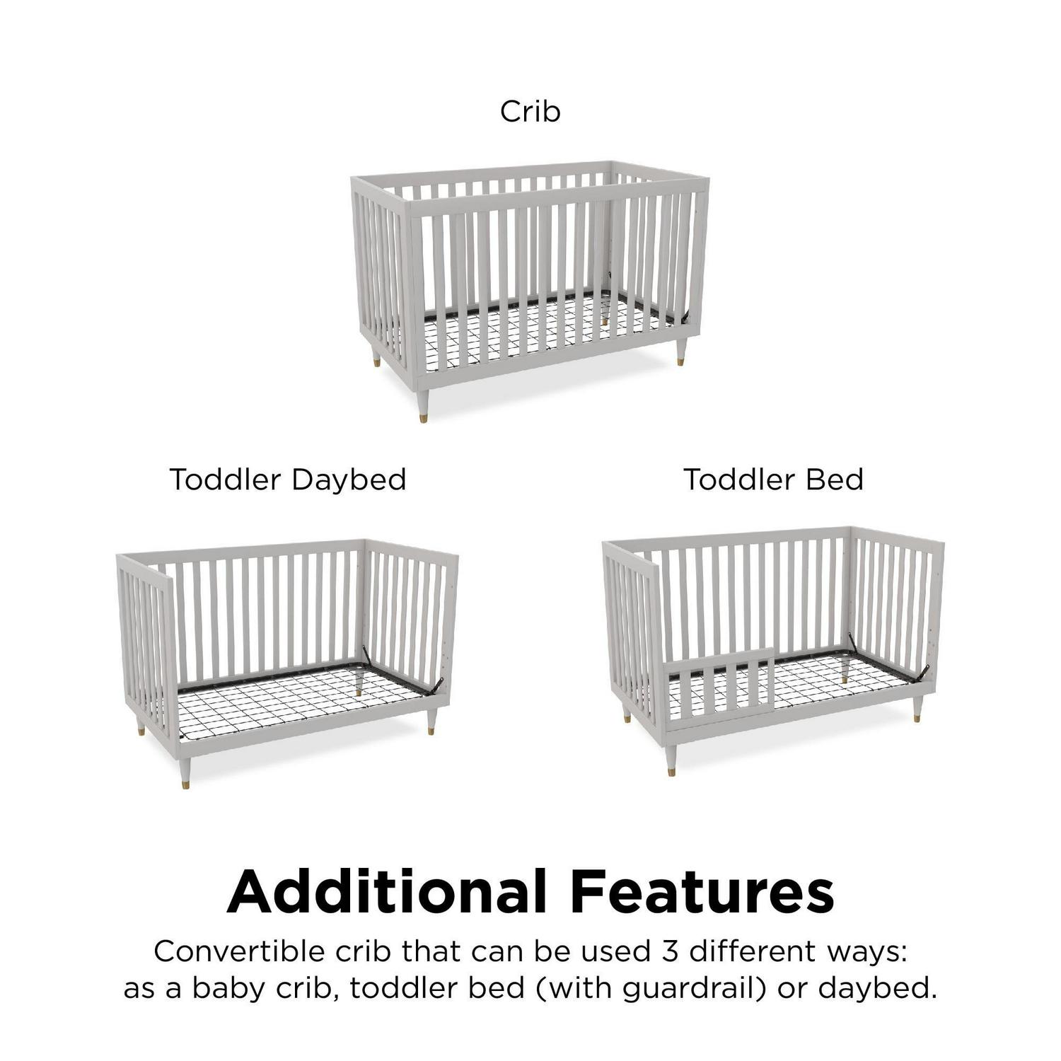 – Easily converts between a crib, toddler bed and daybed. Toddler rail sold separately.