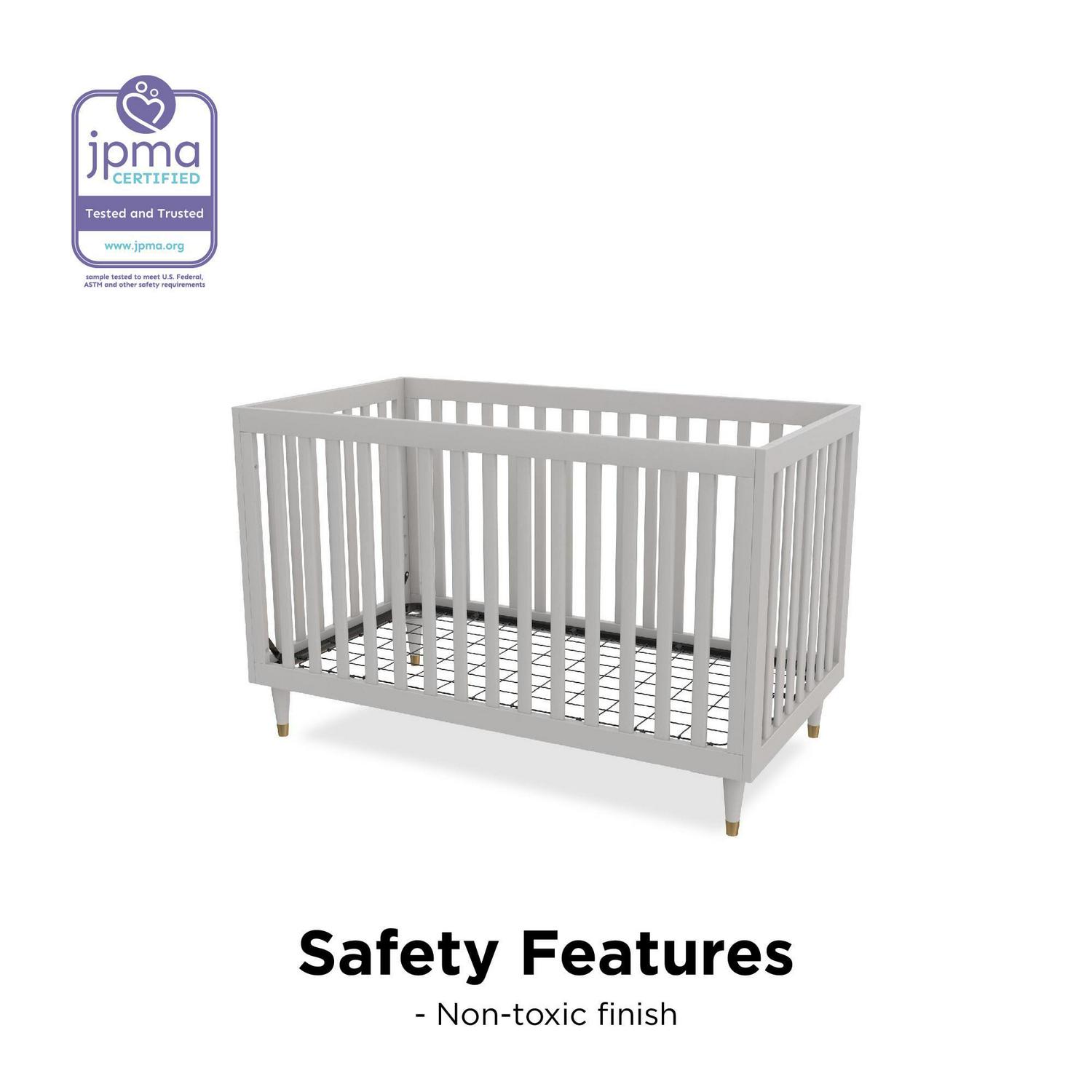 – JPMA Certified. Ships in one box. Easy assembly required. 1-year limited warranty. Accommodates a standard size crib mattress (sold separately).