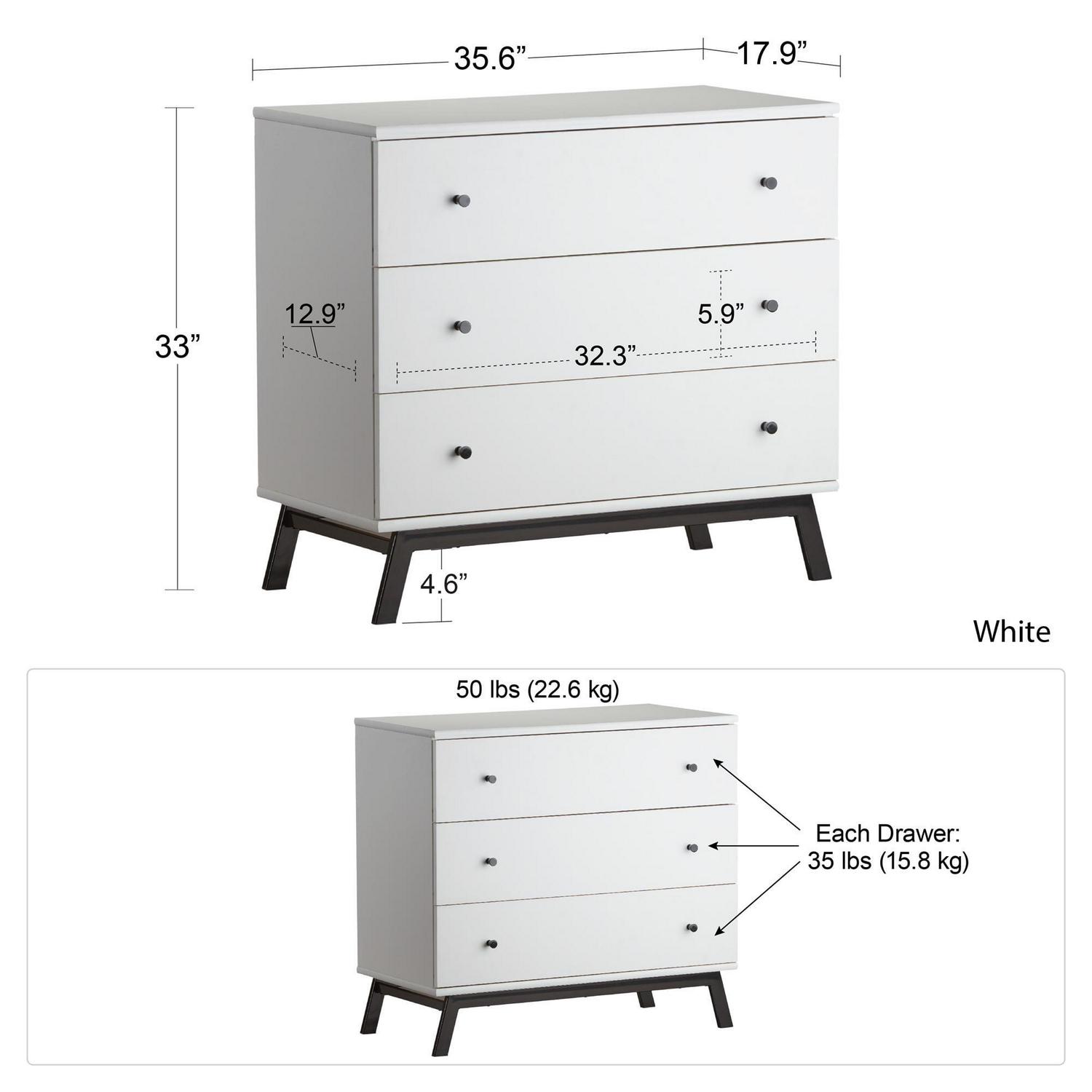 Add a contemporary feel to your child’s bedroom or nursery with the Little Seeds Rowan Valley Lark Urban 3 Drawer Dresser. The chassis is made from laminated particleboard that is finished in a crisp white finish that contrasts the black, powder-coated, angled metal base for a contemporary look. Durable metal drawer slides last for years and are made with built-in stops for safety. Keep folded t-shirts, jeans, sweaters, and extra linens stored away in the 3 spacious drawers. The 3 Drawer Dresser can be converted to a Changing Table by adding the Little Seeds Changing Table Topper (sold separately). Remove the Changing Table Topper when your child outgrows it to convert back to a youth dresser. The 3 Drawer Dresser meets or exceeds the CPSIA Juvenile testing requirements and a wall anchor kit is included to ensure your child’s safety. The Dresser ships flat to your door and requires assembly. Two adults are recommended to assemble. Once assembled, the Dresser measures to be 33″H x 35.5625″W x 17.9375″D. Little Seeds not only creates this and many more on trend baby to teen furniture pieces, we also partner with various environmental protection programs to protect pollinator and other wildlife habitats for future generations.