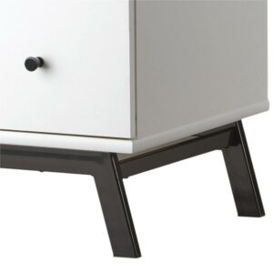 – White, non-toxic finish on the laminated particleboard chassis contrasts the black, powder-coated, angled metal base. Durable metal drawer slides have built-in stops for safety