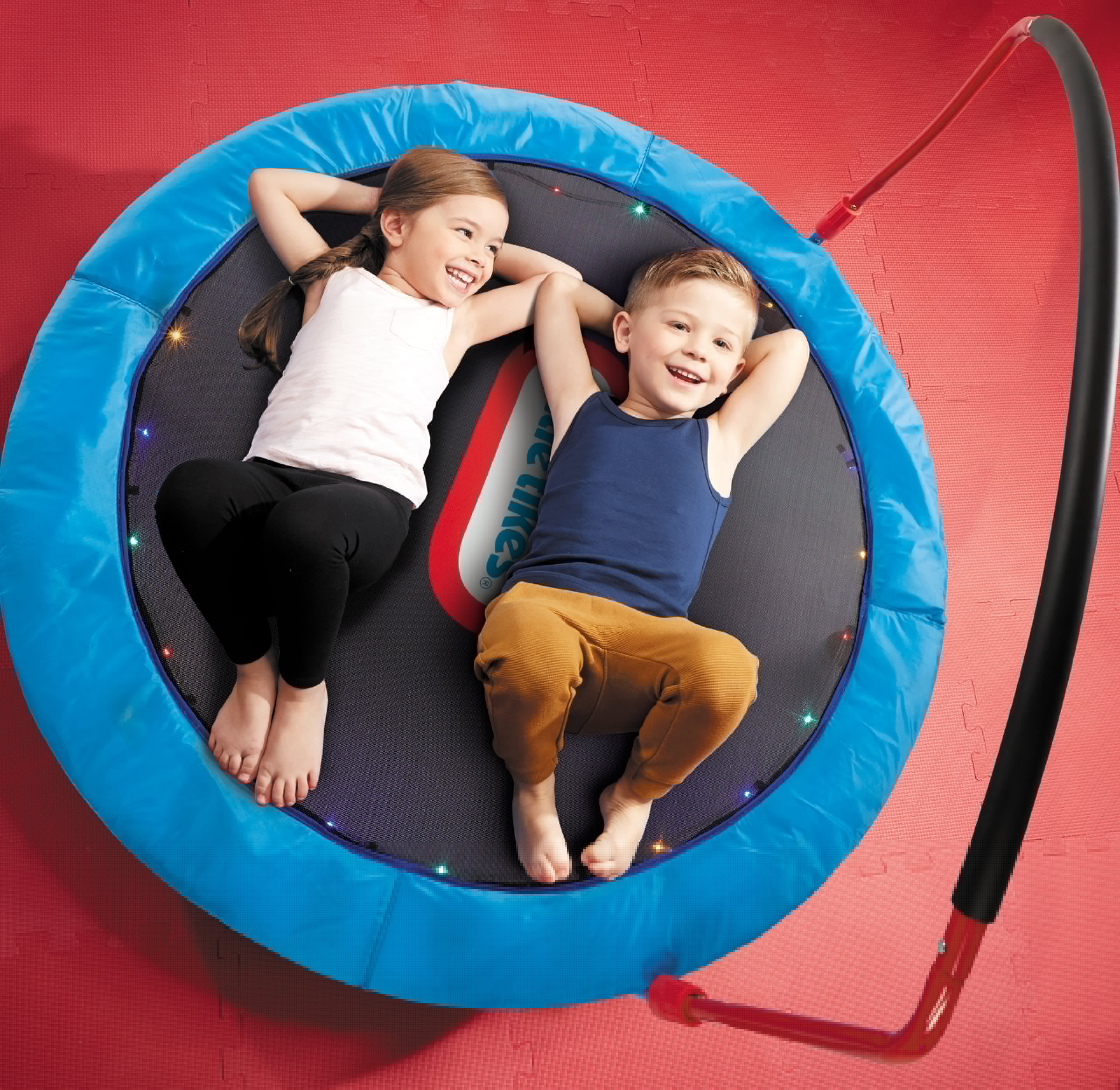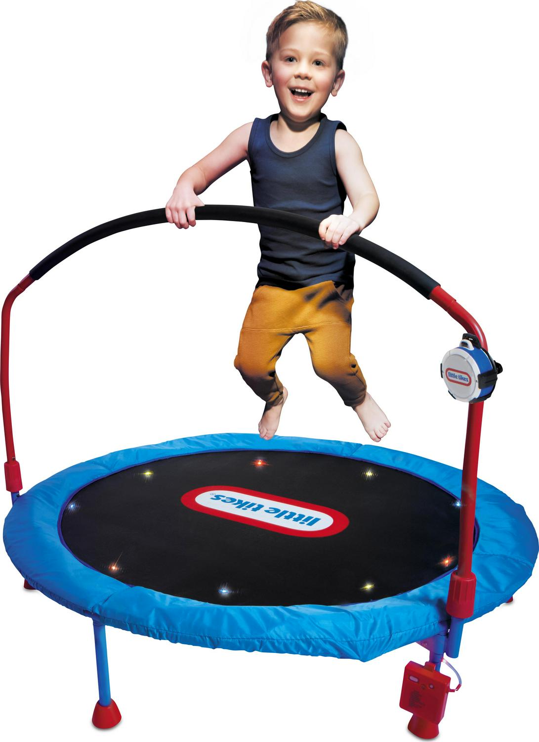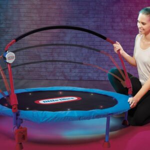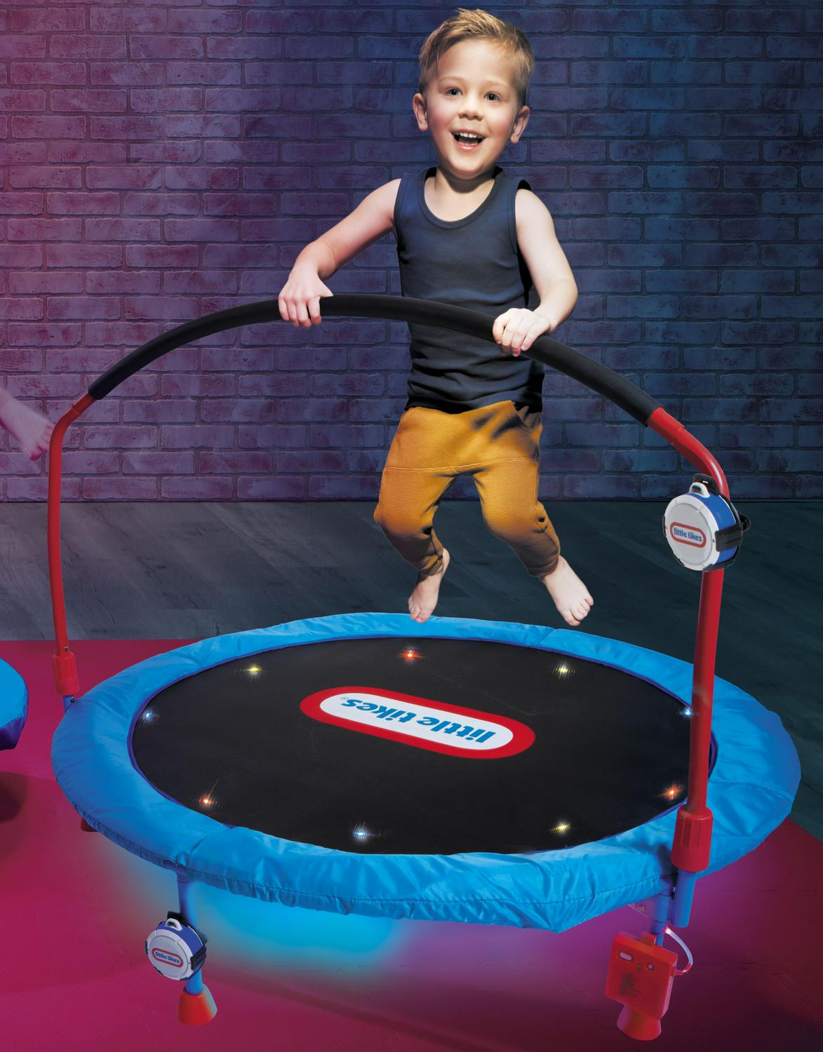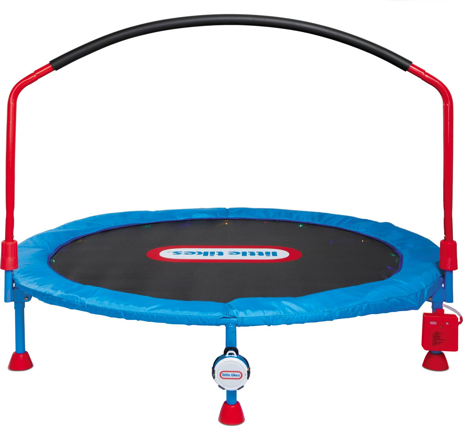 The Little Tikes 4.5-ft. Lights & Music Trampoline is bigger and bouncier, with 4-1/2 feet of jumping surface. Connect your device to the rechargeable Bluetooth speaker and kids can bounce to their favorite tunes. 15 LEDs with 9 different patterns enhance the action and promote extended play. The sturdy handle helps keep jumpers in place and it folds flat for easy storage. LEDs require 3 AA batteries Recommended for ages 3+.