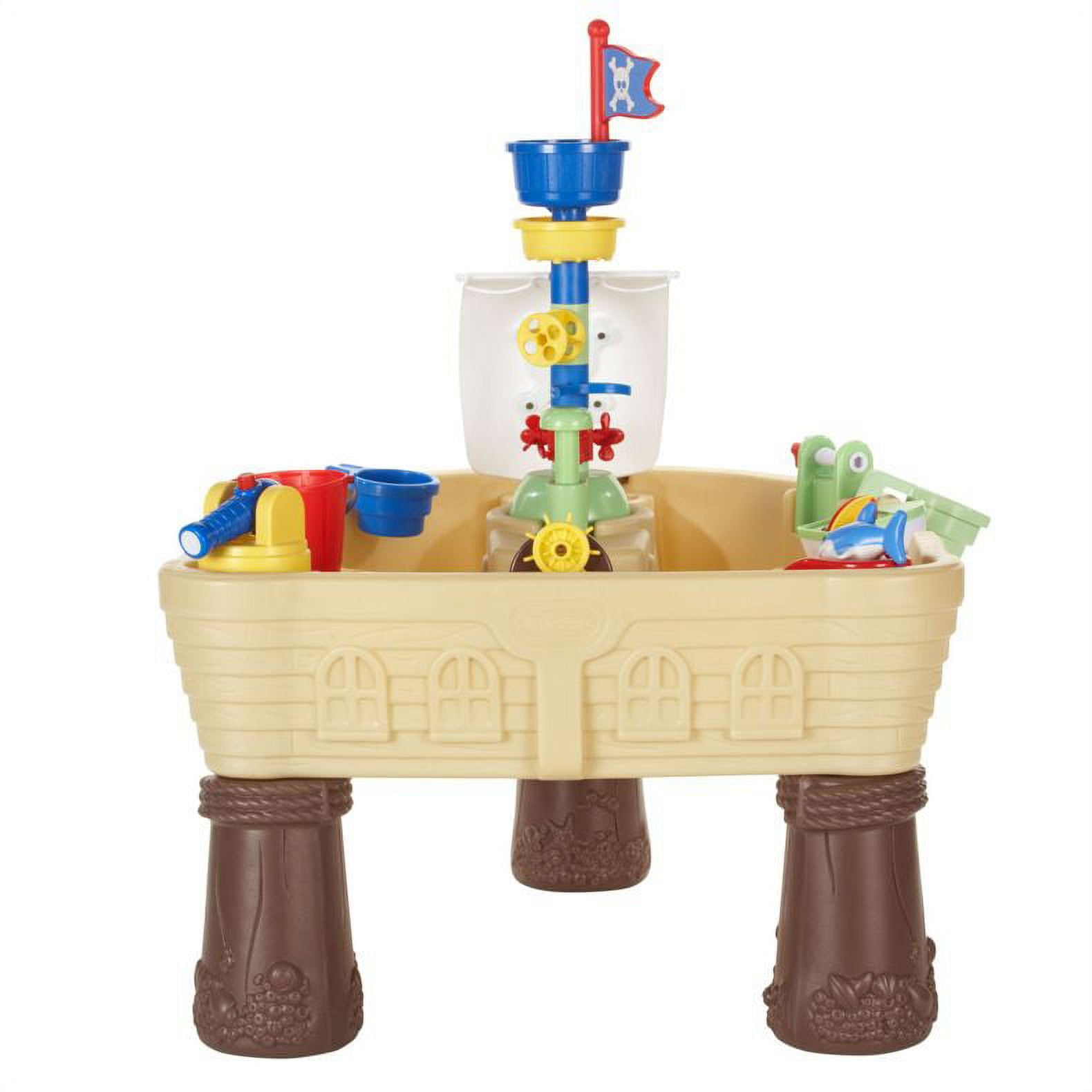 Pirate-themed water table Durable, multi-colored plastic Squirting canons, steering wheels, and cranking anchors Spinners change the current and move floating objects Fun for all ages