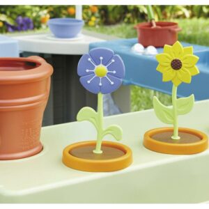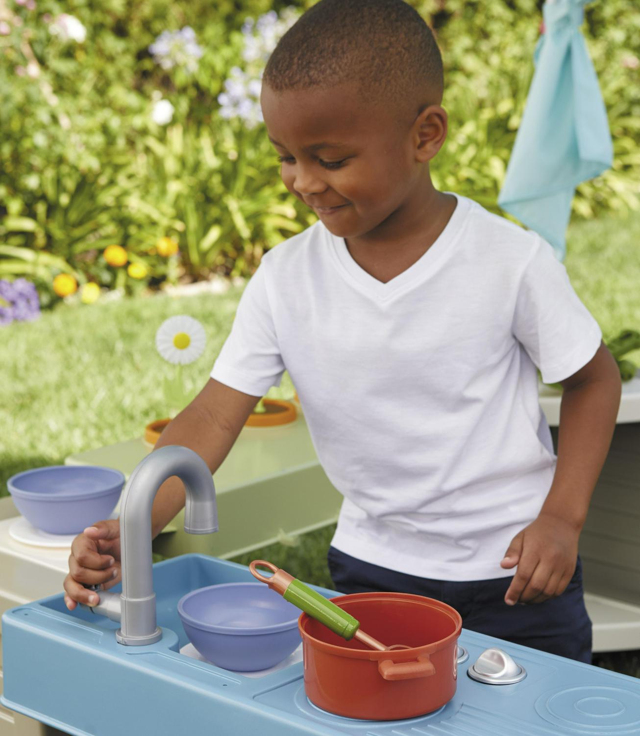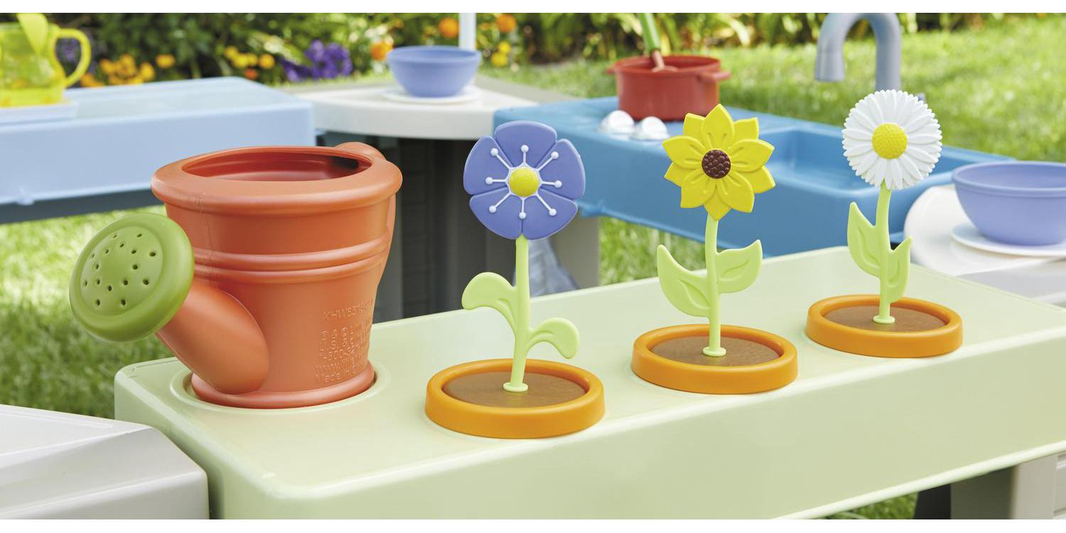 – 3 ROLEPLAY STATIONS. Three roleplay stations: kitchenette with pretend stove and sink, lemonade stand with real chalkboard, and gardening station with pretend flowers