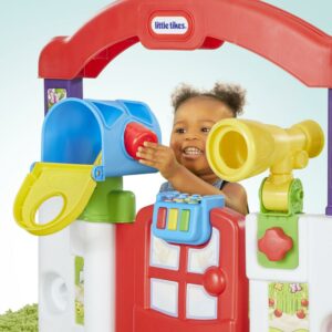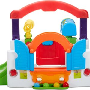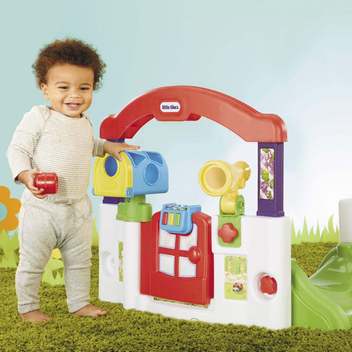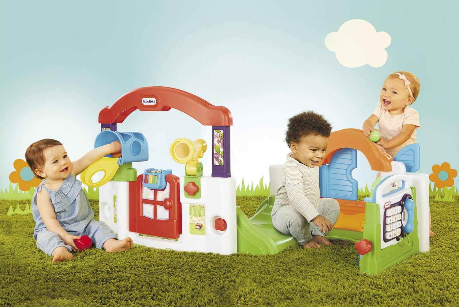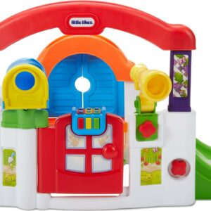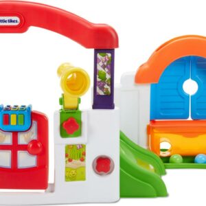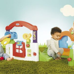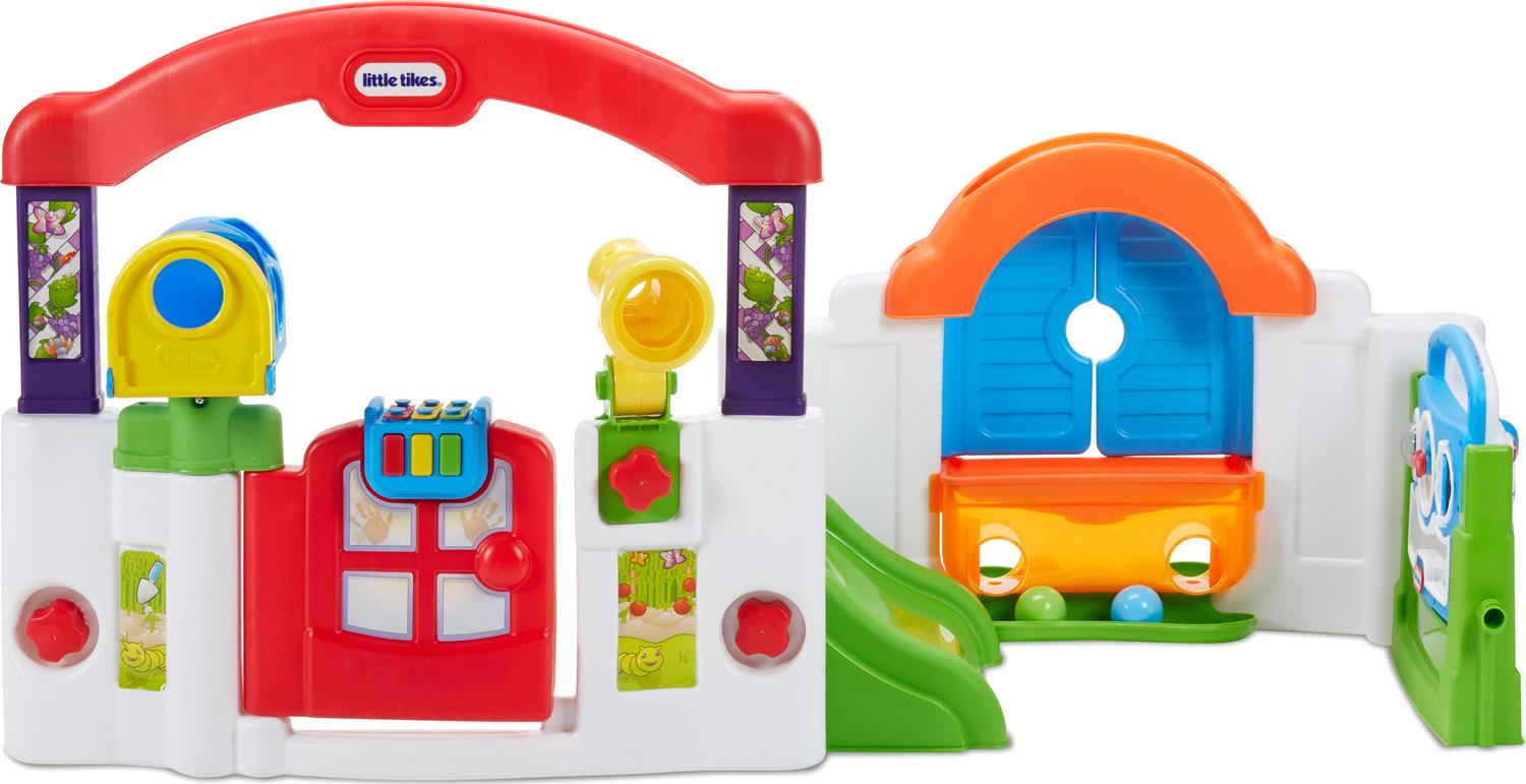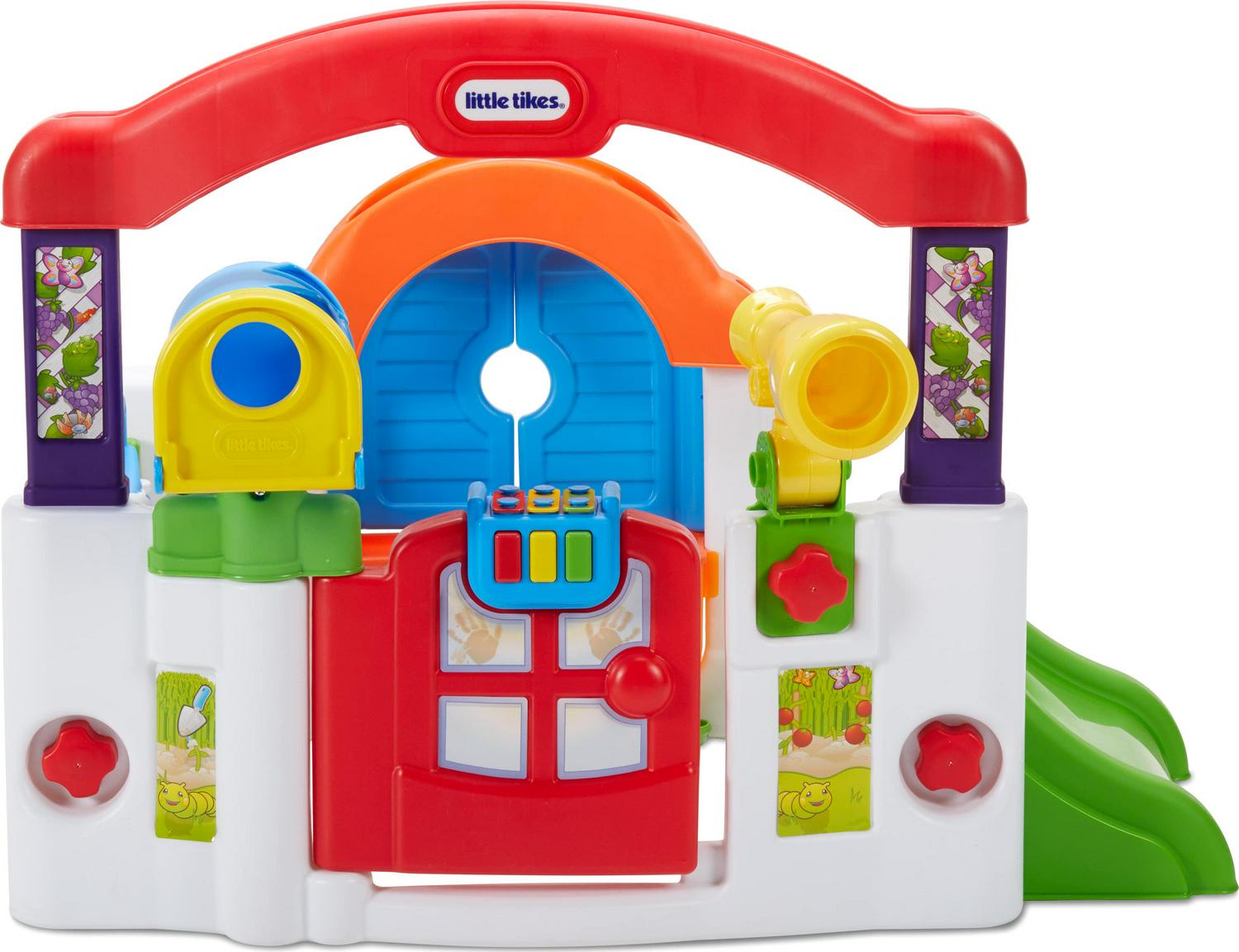 The Little Tikes DiscoverSounds Activity Garden easily converts from a closed play center to an open, two-sided play center without tools to grow with your child. The removable take-along play panel features a mirror, learning clock, ball shaker, and a 3-language interactive telephone. The window shutters open and close to play a game of peek-a-boo. For more fun games, use the window planter for ball drop play. The mailbox allows children to pretend to receive mail’ as well as learn shapes and colors. The Tap-a-Tune Piano has colored chimes and buttons to encourage your child to experiment musically.