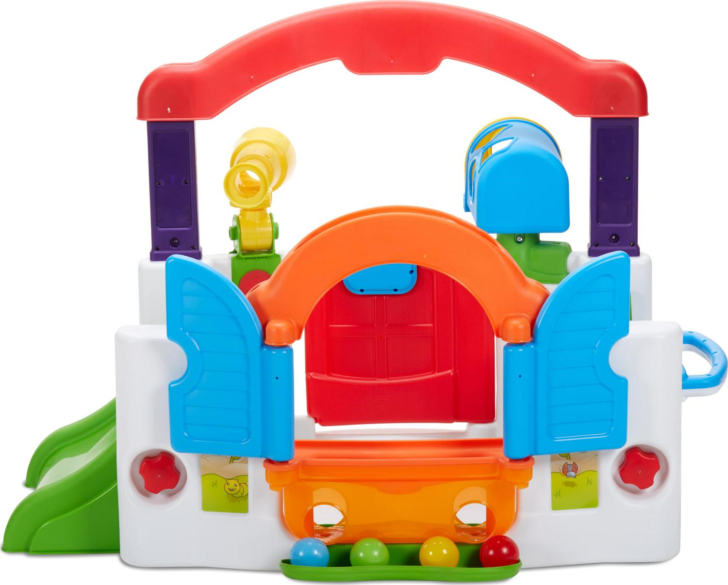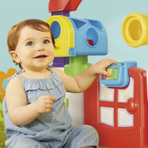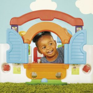 – INTERACTIVE FEATURES. Window shutters open and close to play a game of peek-a-boo with your child. For more fun games, use the window planter for ball drop play. The mailbox allows children to pretend to receive ‘mail’ as well as learn shapes and colors.