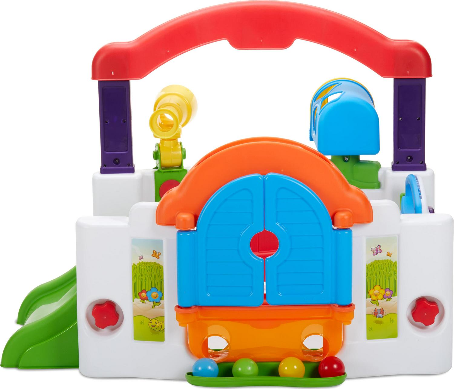 – TWO WAYS TO PLAY. Easily converts from a closed play center to an open, two-sided play center to grow with your child