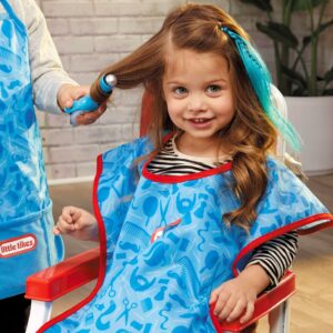 – 20 REALISTIC ACCESSORIES – This salon role play set includes a working blow dryer, buzzing clippers, 2 hair clip extensions, 2 curlers, diffuser, curling iron, play beard, no-cut scissors, kid-safe mirror, comb, hair pick, brush, scalp massage brush, cleaning jar with lid, 2 Tikes Bucks , barber cape and stylist apron.