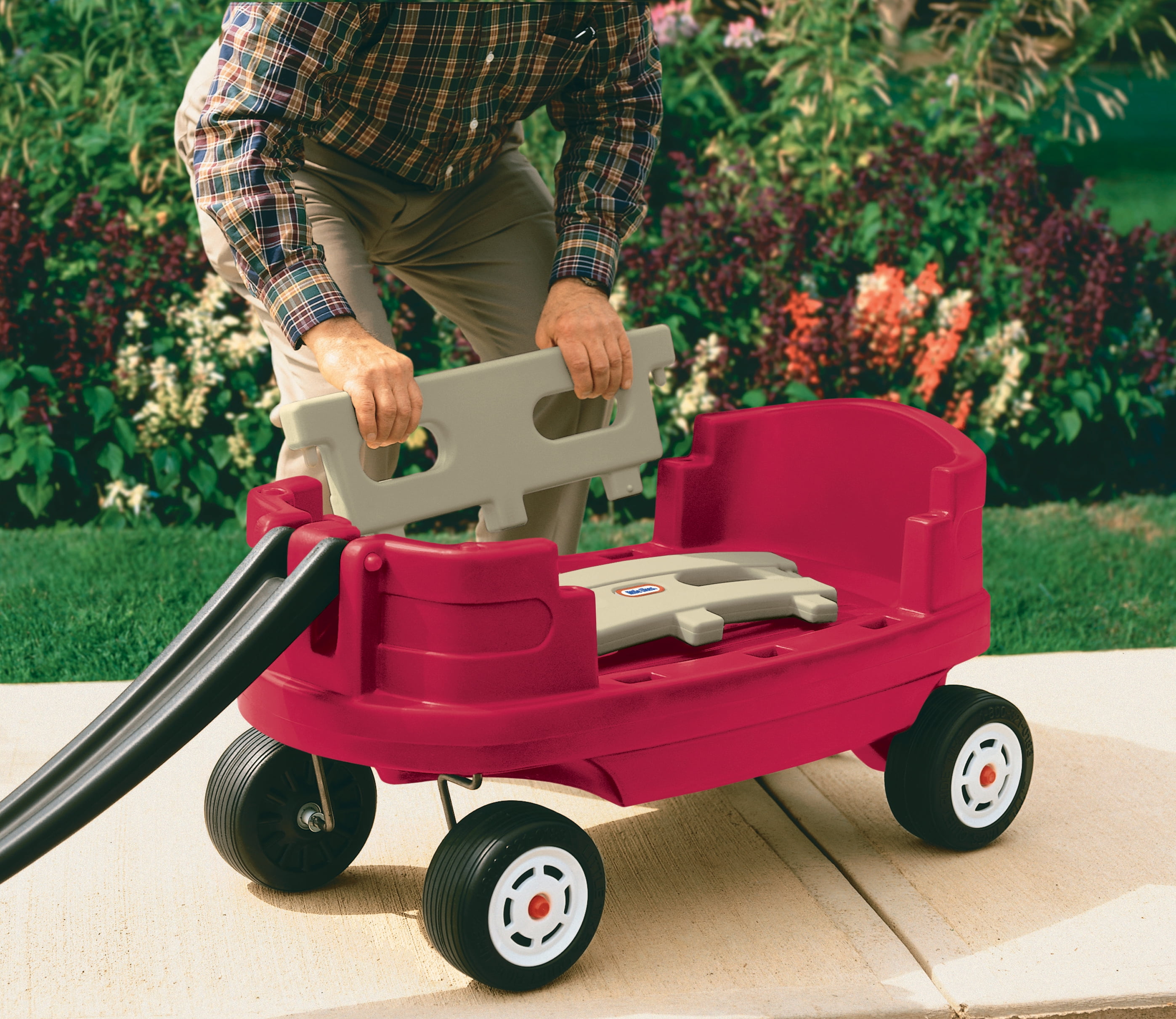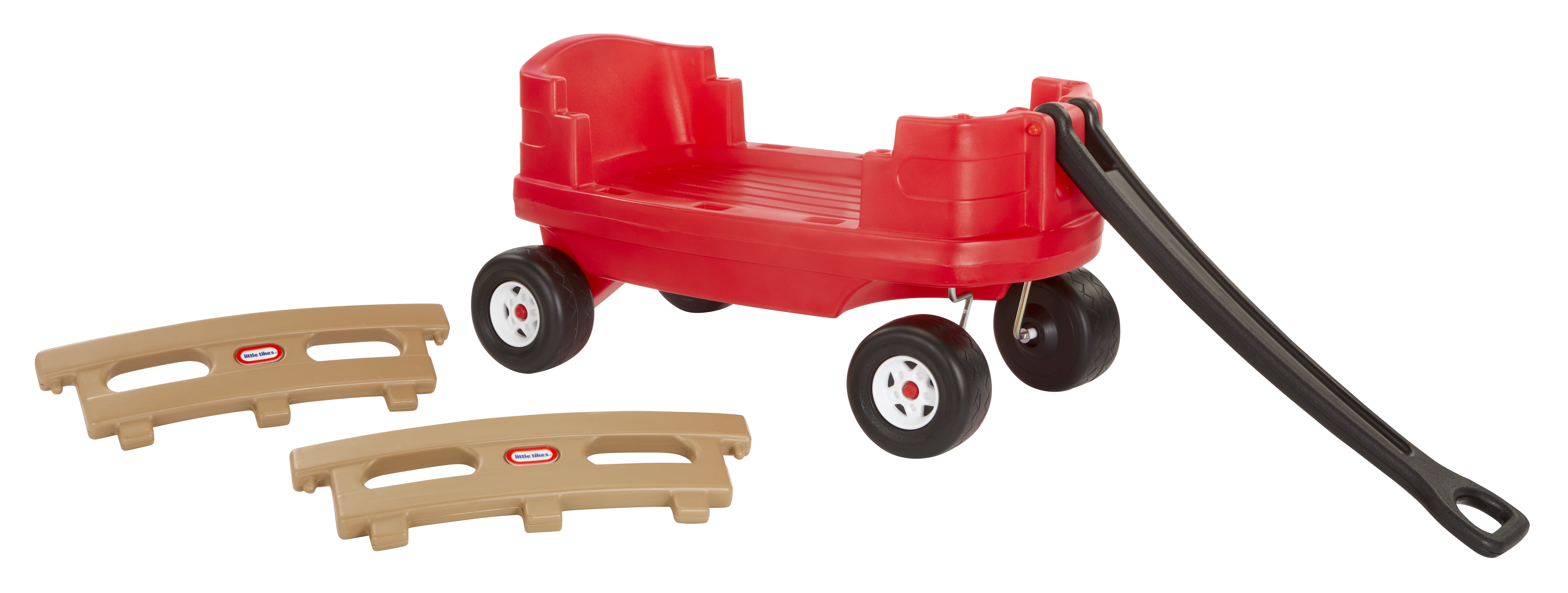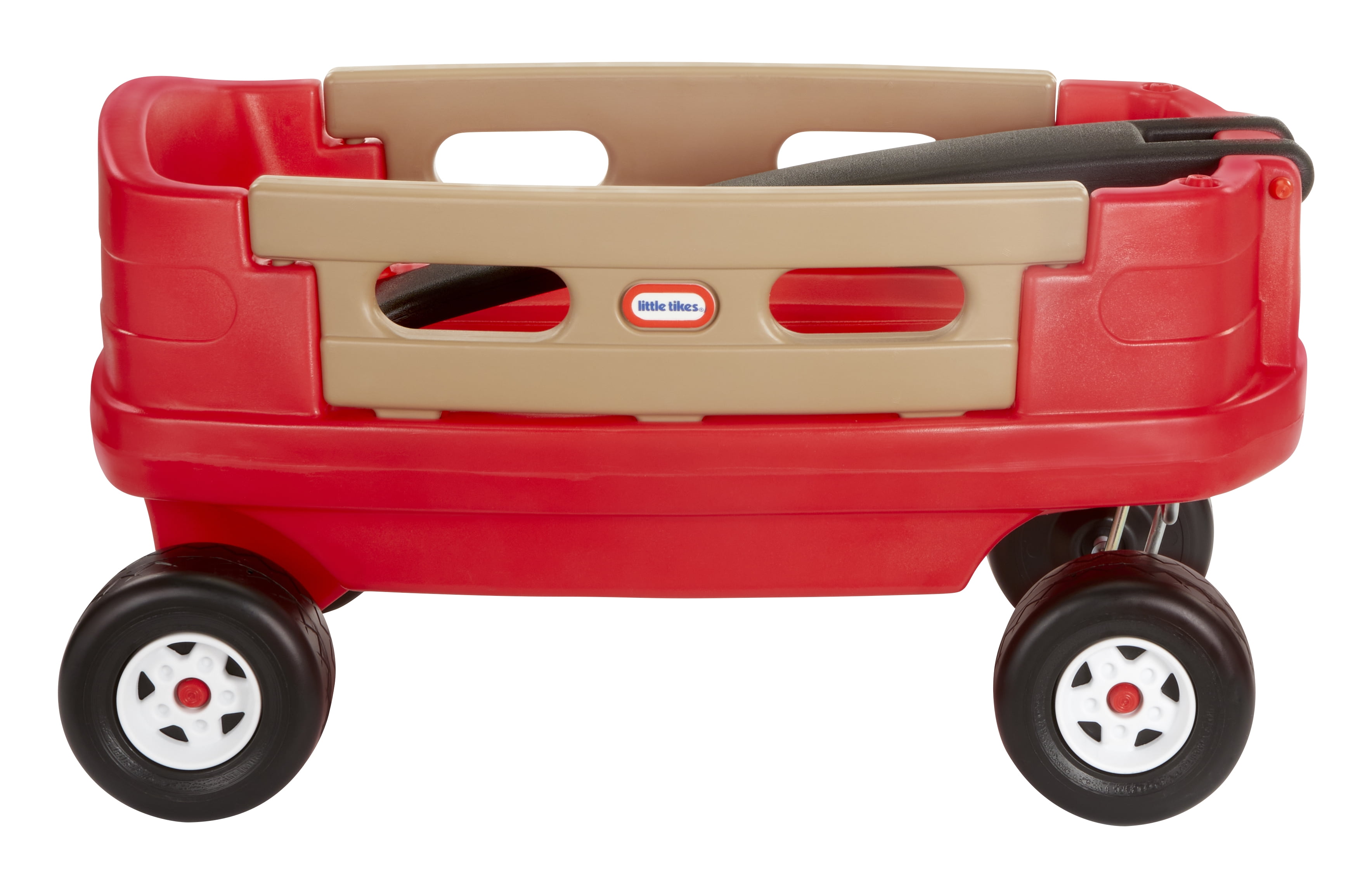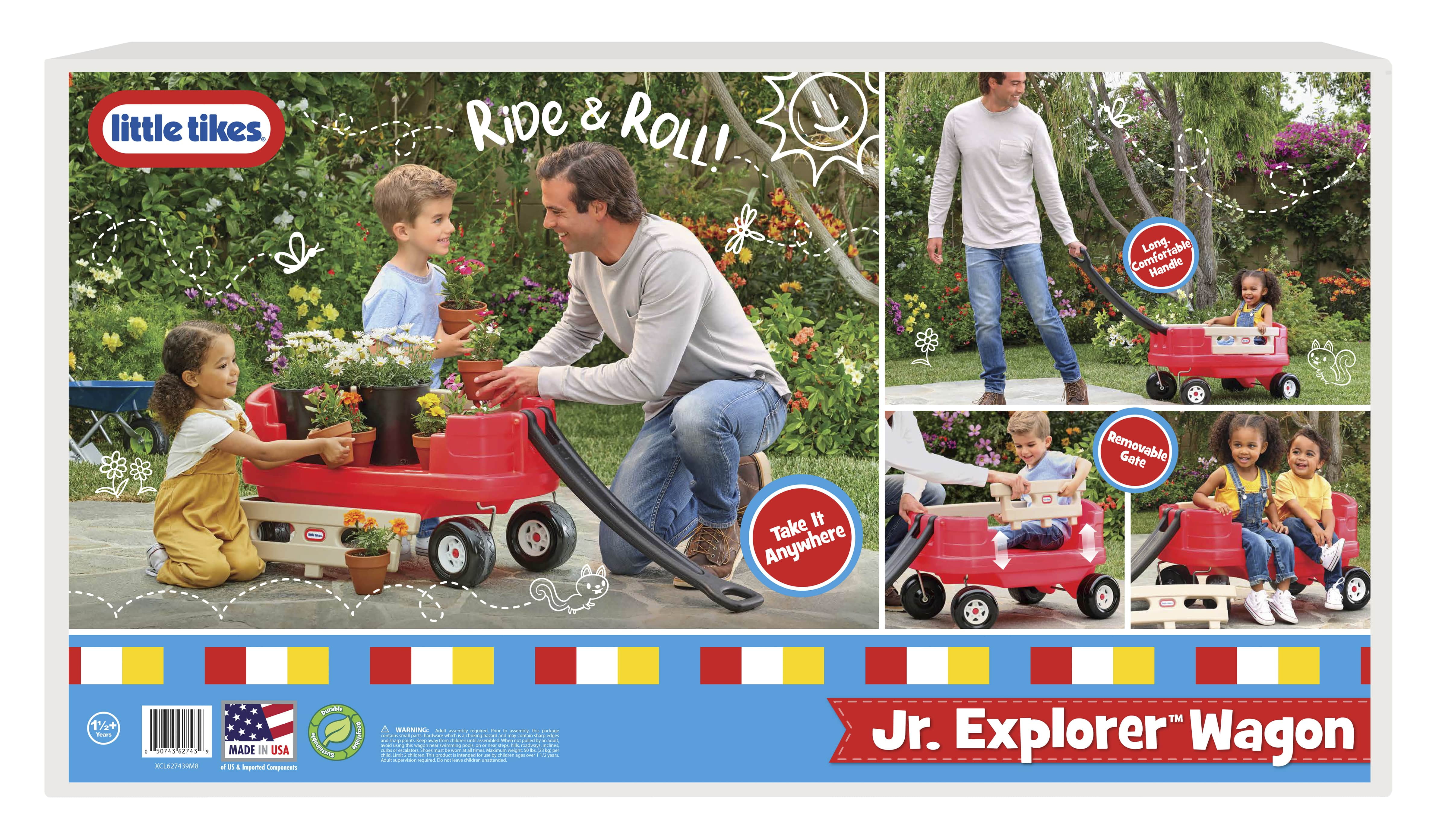 Little Tikes Junior Explorer Wagon: Extra-long handle 2 extra-high sides are removable for easy loading and unloading Plastic construction Quiet ride tires Folds flat for storage Easily fits in the trunk of a small car Maximum weight capacity: 50 lbs Adult assembly required See our entire assortment of bikes and ride on toys at .