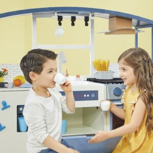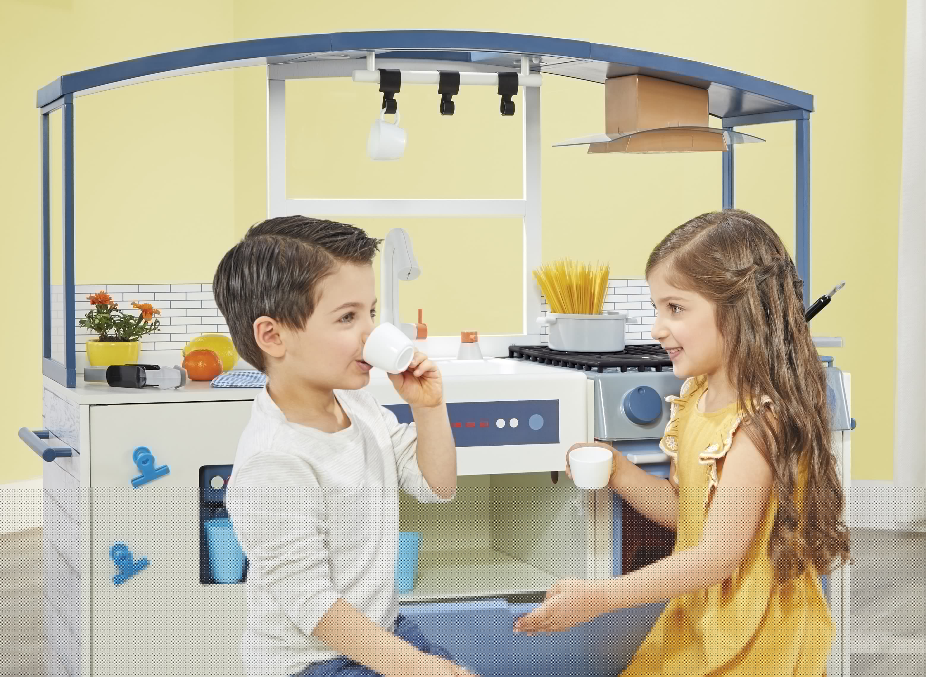 – PRODUCT INCLUDES: Over 20 interactive accessories like drinking glasses, coffee cups, pan, pot, tongs, spatula, kitchen towel and hooks. Age: 3+ Years