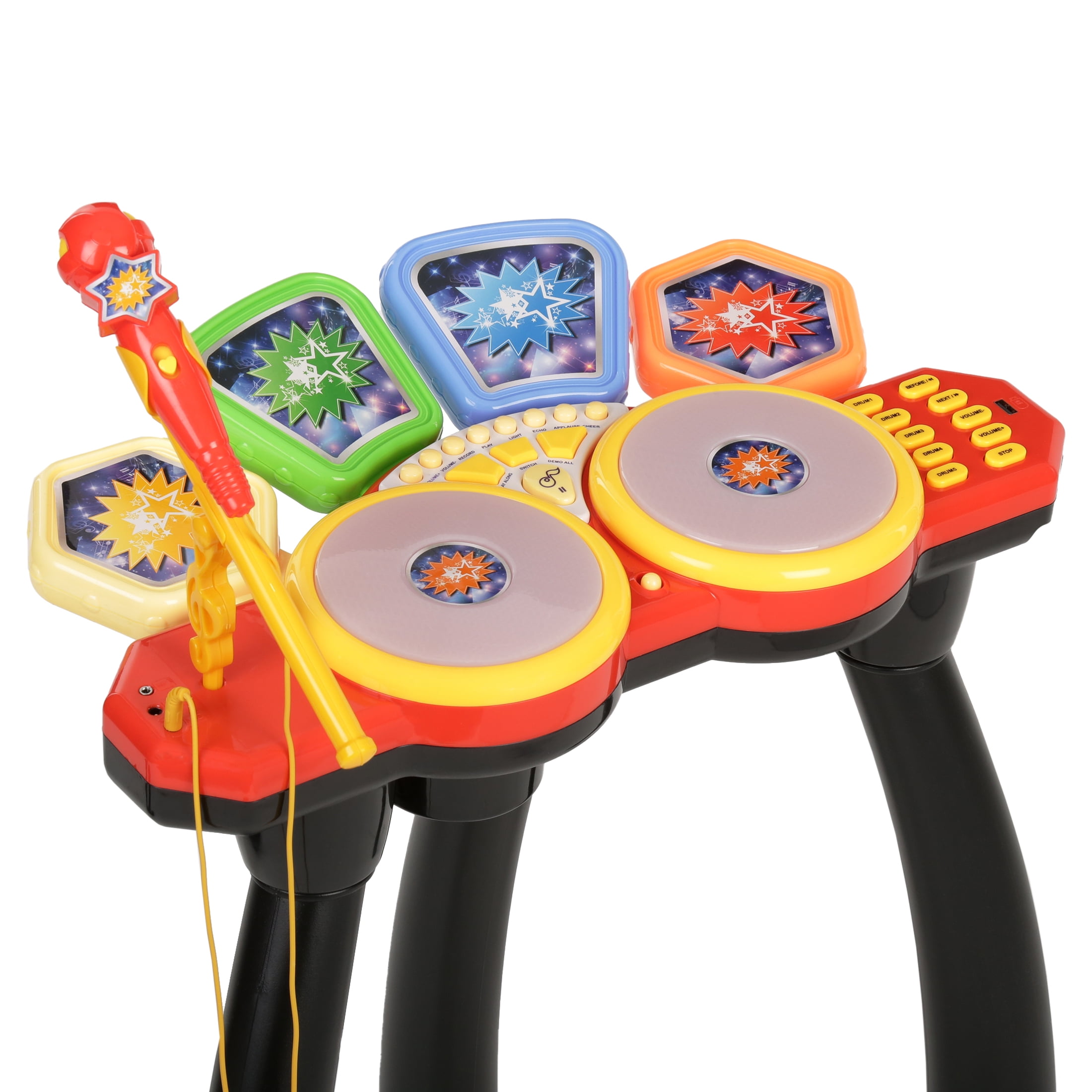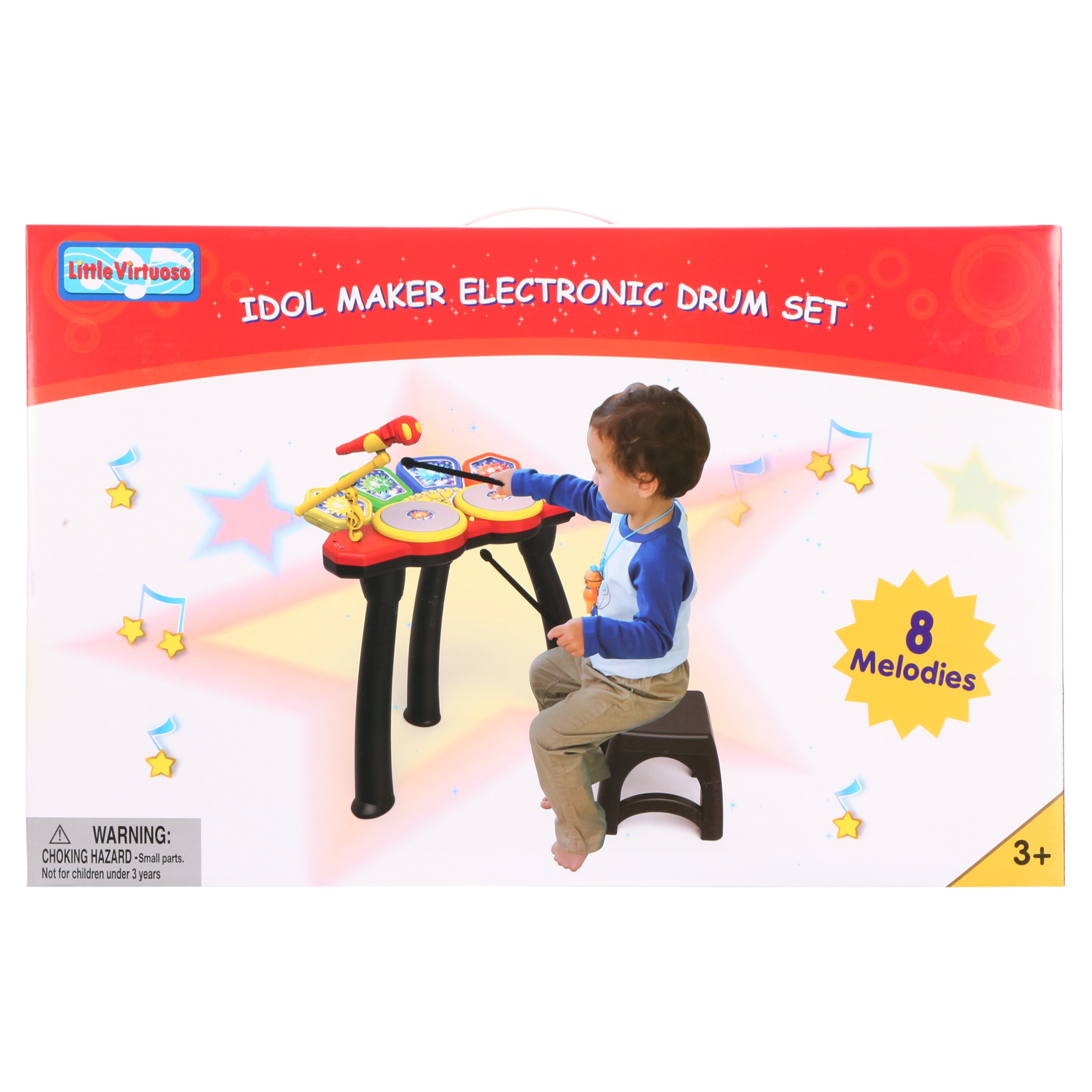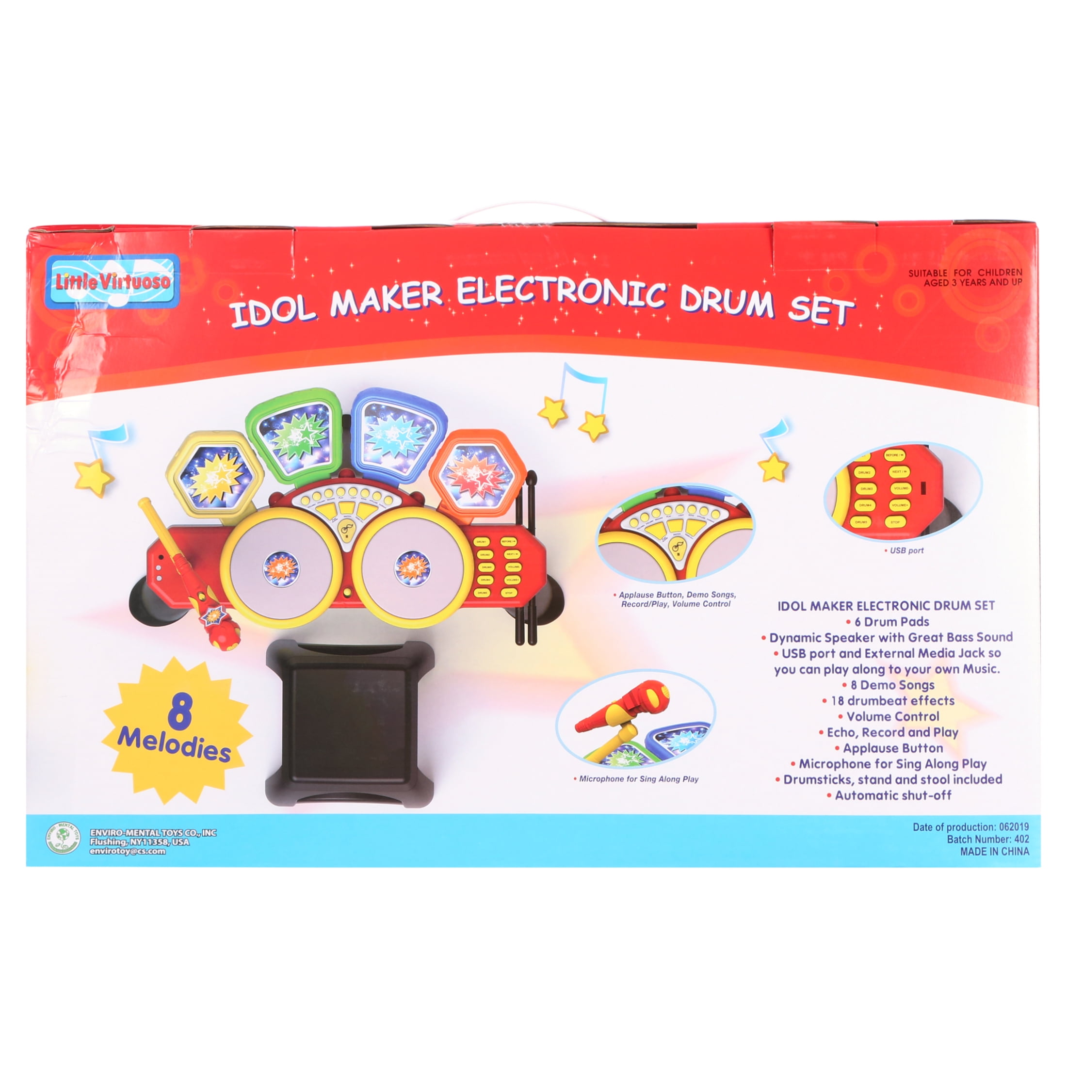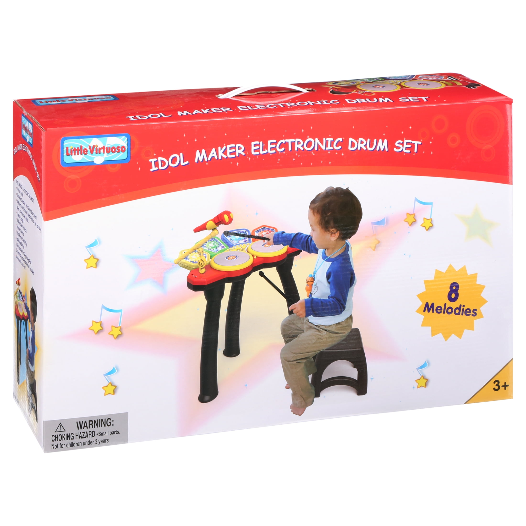 Little Virtuoso Idol Maker Drum Set This toy drum set features 18 different drumbeat effects Features 8 built-in demo songs Lighter, and thus safer than traditional drums Operates using 4 AA batteries (not included)