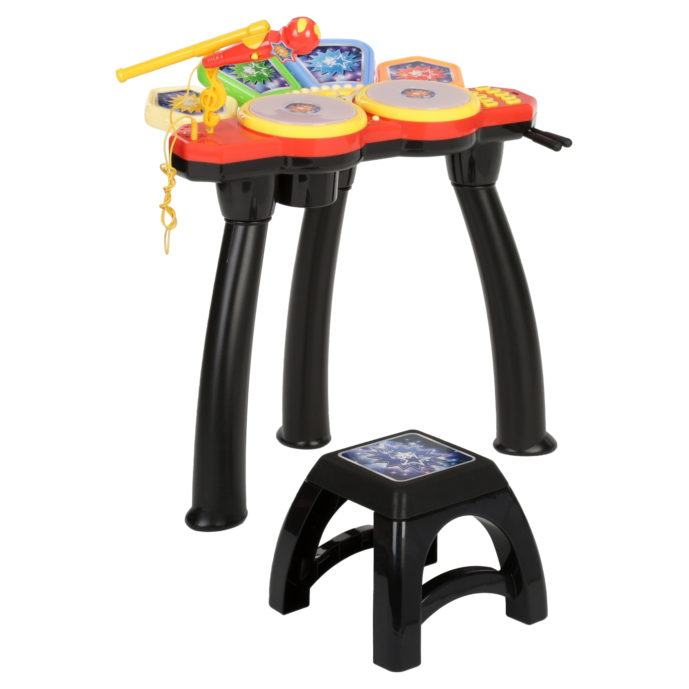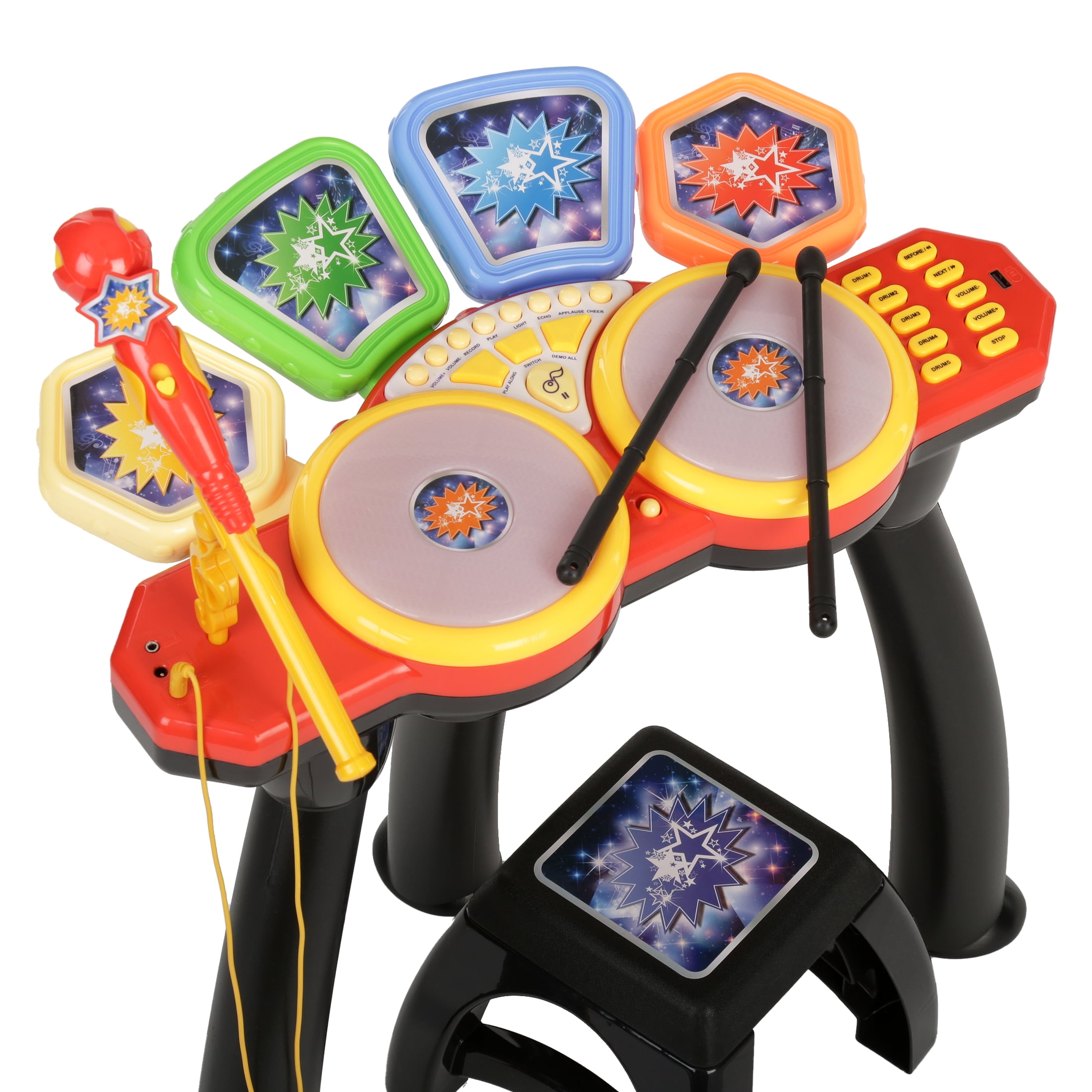Little ones will be inspired by the pre-loaded demo songs to create their masterpieces. The large speaker and Big Bass sound make all the music sound great. They can have fun creating different sounds using the different preset rhythms or rehearse and put on performances. They can also connect an MP3 Player or Flash Drive to the USB port and jam to their favorite tunes. This kids’ electronic drum set is color coded and includes buttons such as tempo controls for controlling the speed of the music and volume controls. Included are two drumsticks, a microphone, a stand, and a stool. It is quick and easy to put together. Some adult assembly is required. Recommended for ages 3 years and up. Warning: choking hazard – small parts. Not for children under 3 years.