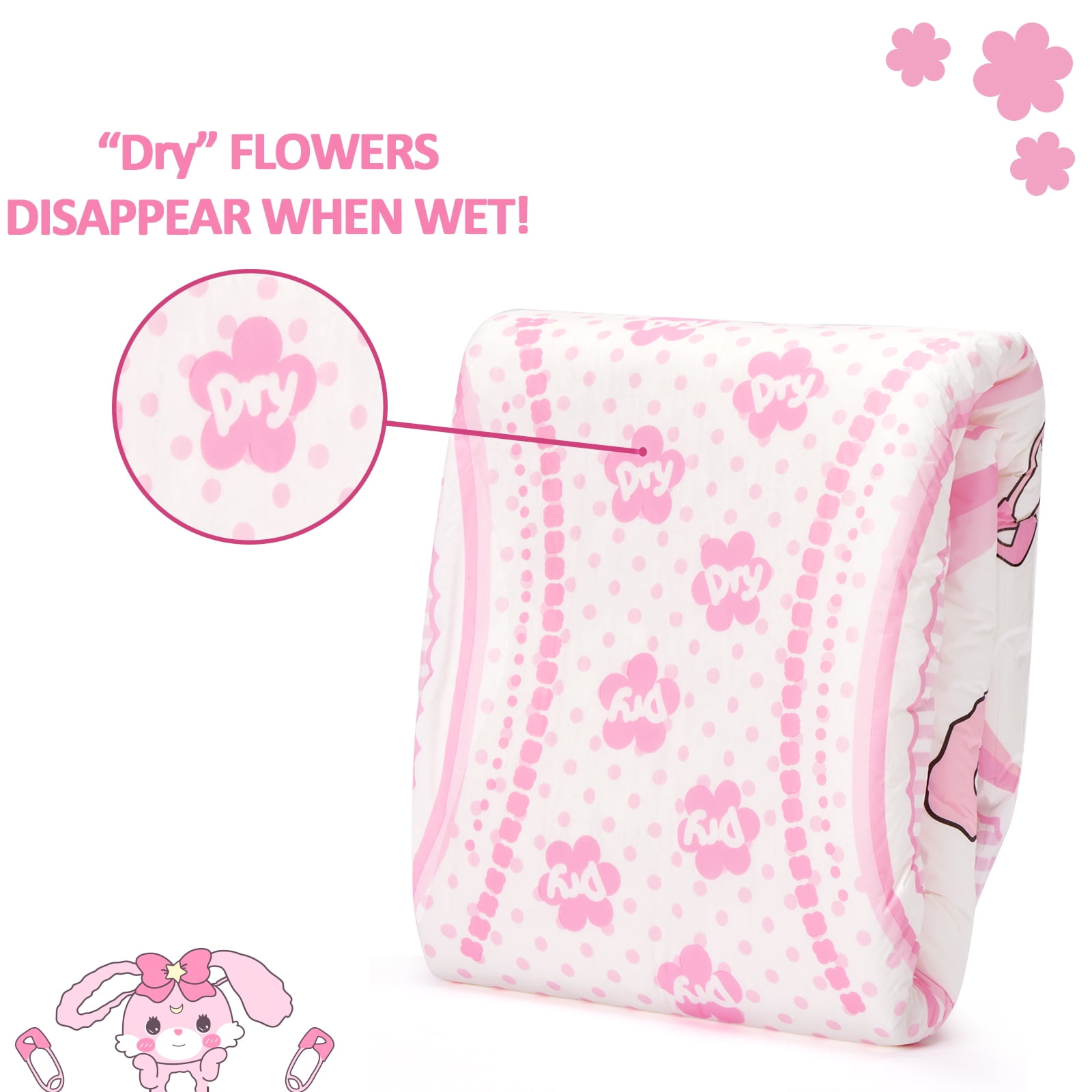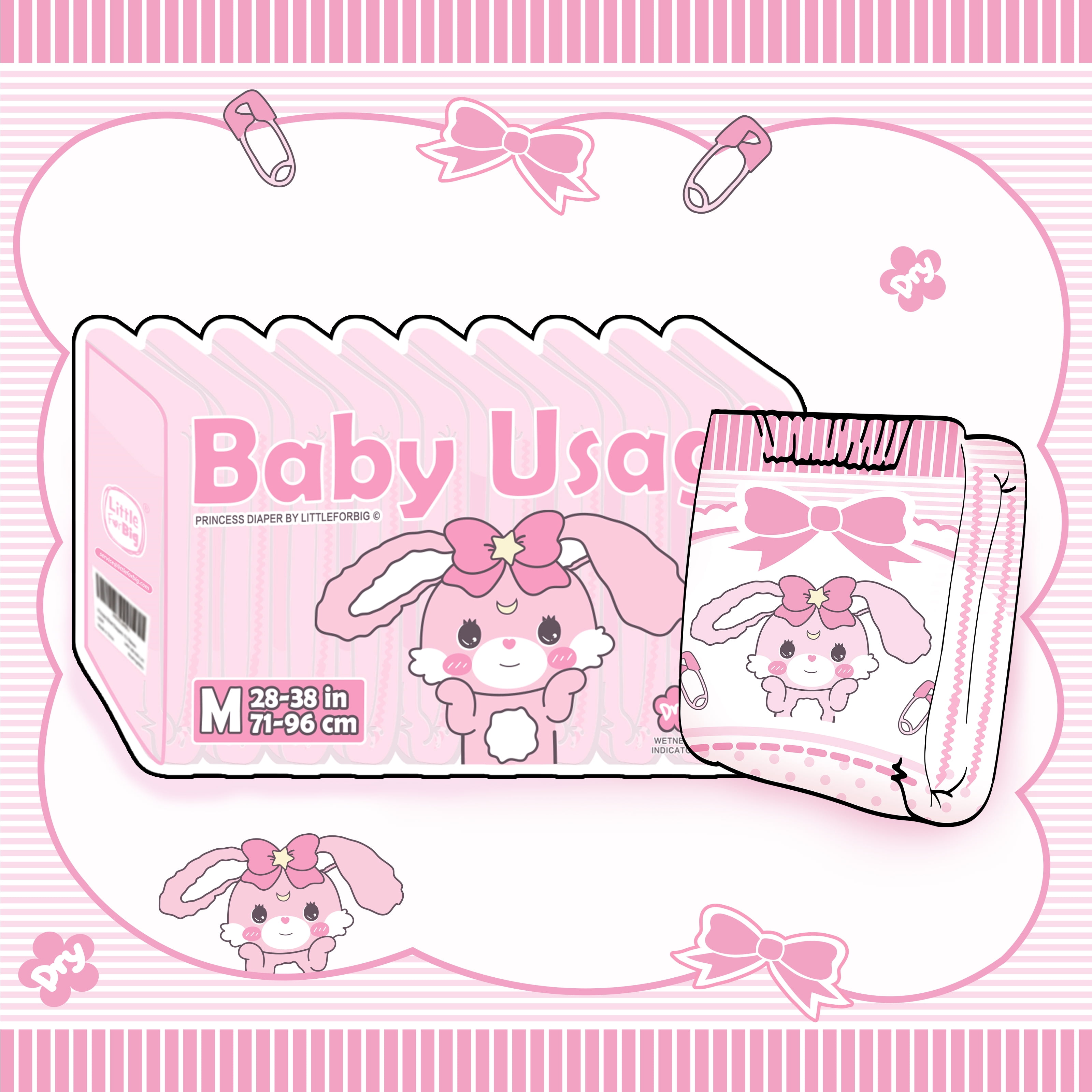 Littleforbig baby usagi adult diaper feature Littleforbig’s exclusive Usagi character – an ultra cute, pastel pink bunny that’s an adult roleplay fantasy come true! Enjoy the nostalgic feeling of positional printing, coupled with ‘dry’ printed wetness indicator flowers that disappear when wet! This snuggly cute diaper is designed for girly, pastel immersion, and is sure to make you look as small and cute as you feel inside. Available sizes Medium (M) through Extra Large (XL). PLEASE TAKE THE TIME TO MEASURE FOR YOUR SIZE.