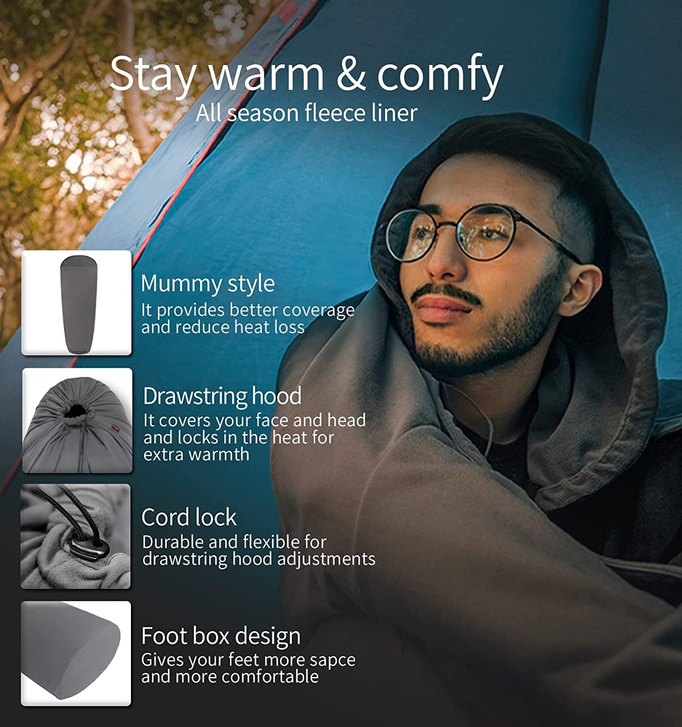 Fill Material : Sleeping bag liner No Fill MaterialTHICKER & WARMER: Our lightweight sleeping bag liners are made using thicker, softer and lightweight fleece to provide you with a convenient way to stay warm and comfy in the outdoors. This all season sleeping bag liner can add up to 27F to your sleeping bag so you can sleep comfortably through the nightMADE WITH COMFORT IN MIND: This mummy sleeping bag is made using soft yet flexible fleece fabric that keeps you warm while giving you the freedom to move around. Thanks to the drawstring hood it locks in the heat for extra warmth while the foot box design gives your feet more space to move aroundLIGHTWEIGHT & EASY TO CARRY: Weighing in at only 16.6oz/ 470g, you can easily carry this sleeping bag liner in the included travel sack without being weighed down. Its compressible design allows you to simply squeeze it in the stuff sack to carry it in your backpack, luggage or simply keep it in your carFOR ALL YOUR ADVENTURES: The anti-pill fleece camping bag liner is the perfect choice for all your outdoor adventures and travels to keep you warm and comfy just like home. It makes the perfect addition to your hiking, traveling, backpacking or traveling gear to enhance comfort and warmth