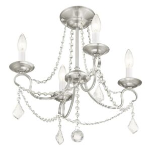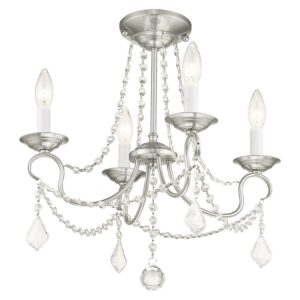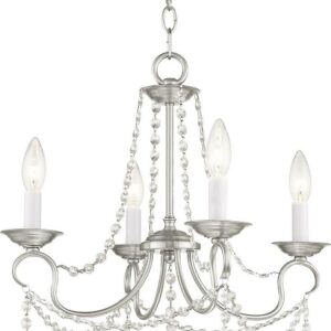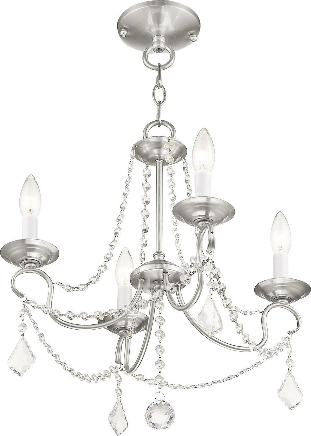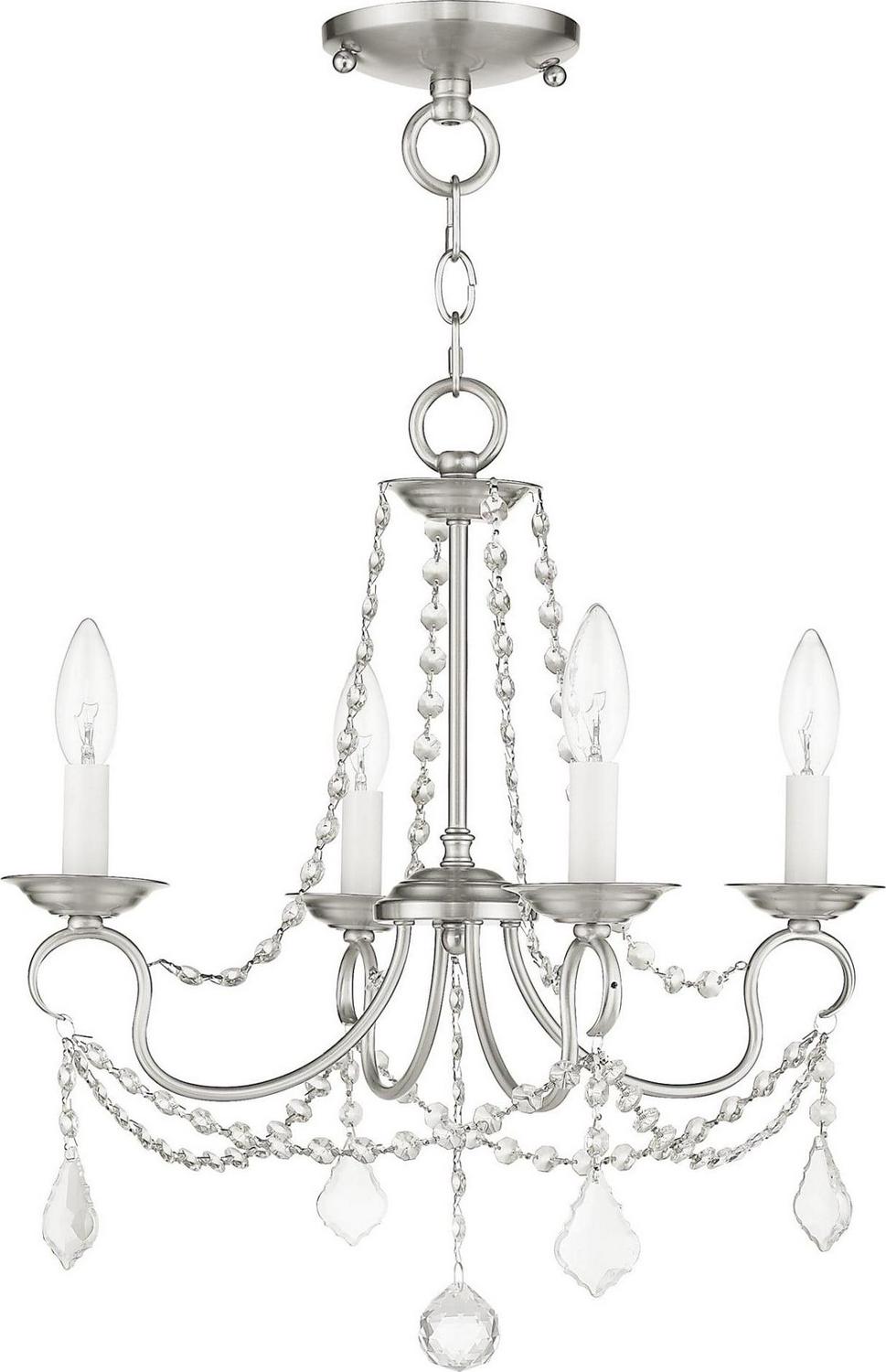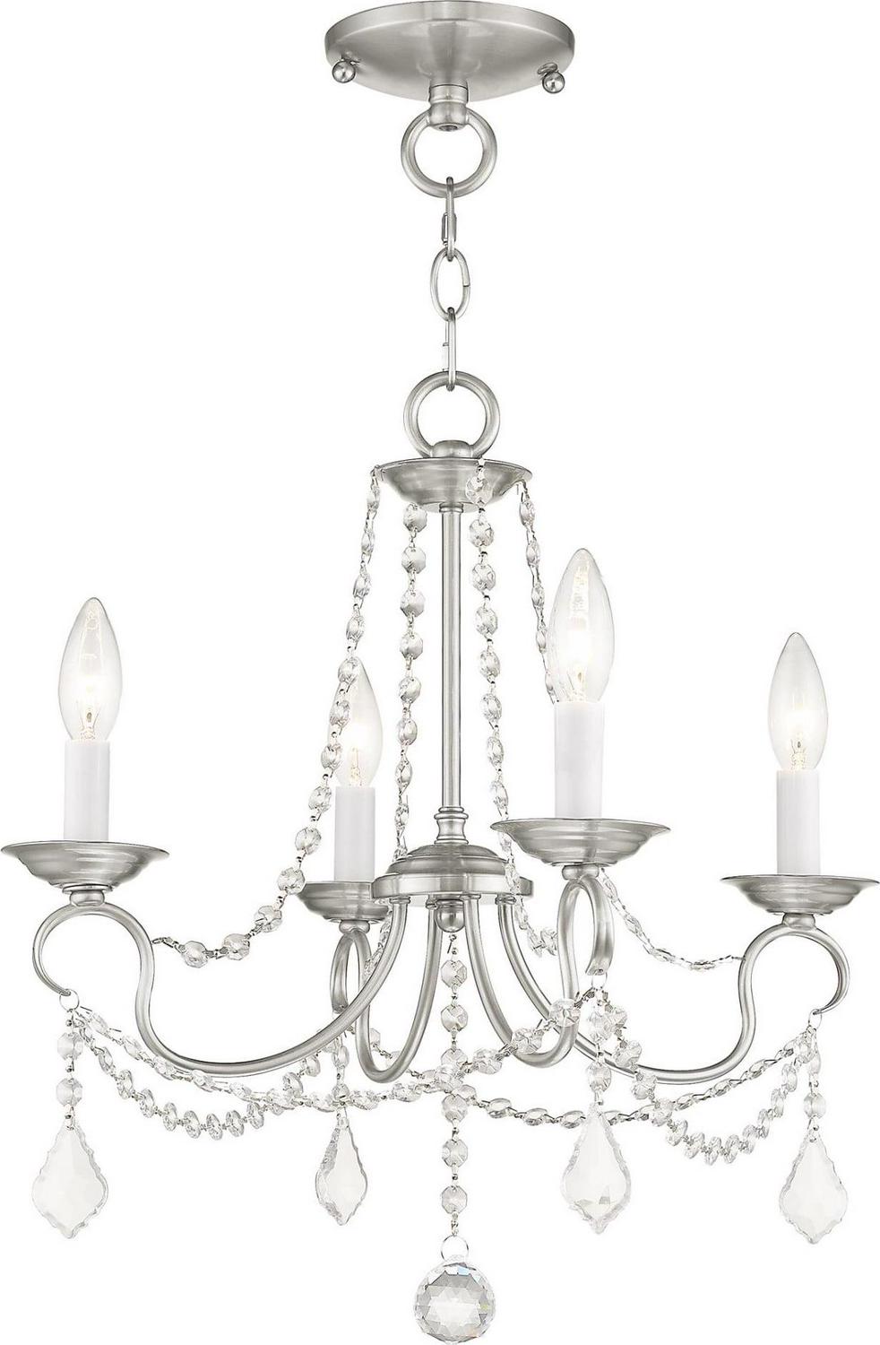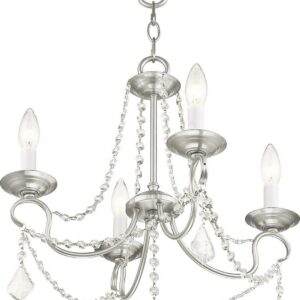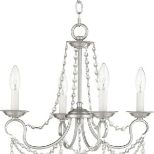 This intricately accented and masterfully forged four light mini chandelier is from the Pennington collection. Finish is a brushed nickel and features include gracefully sculpted arms and with sparkling clear crystal.