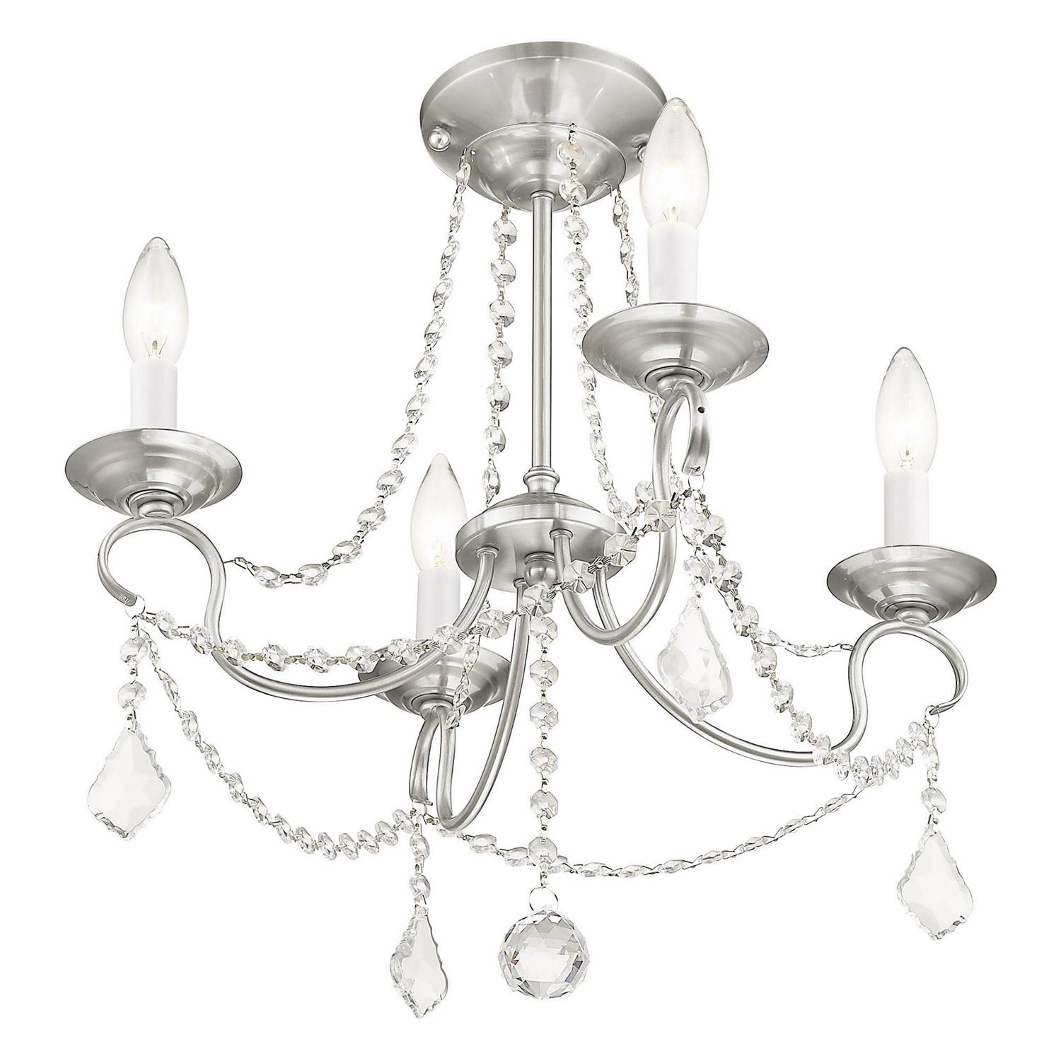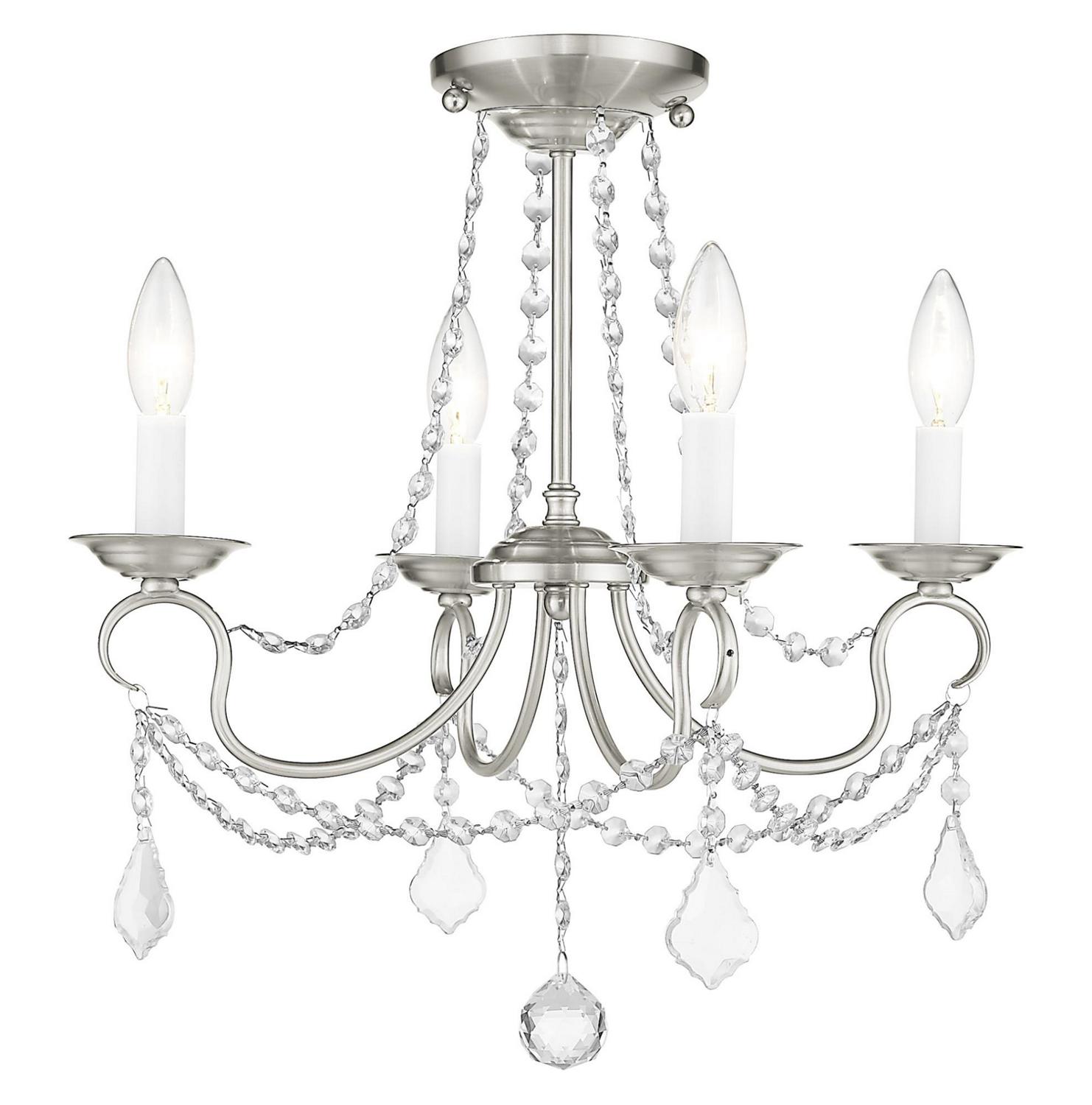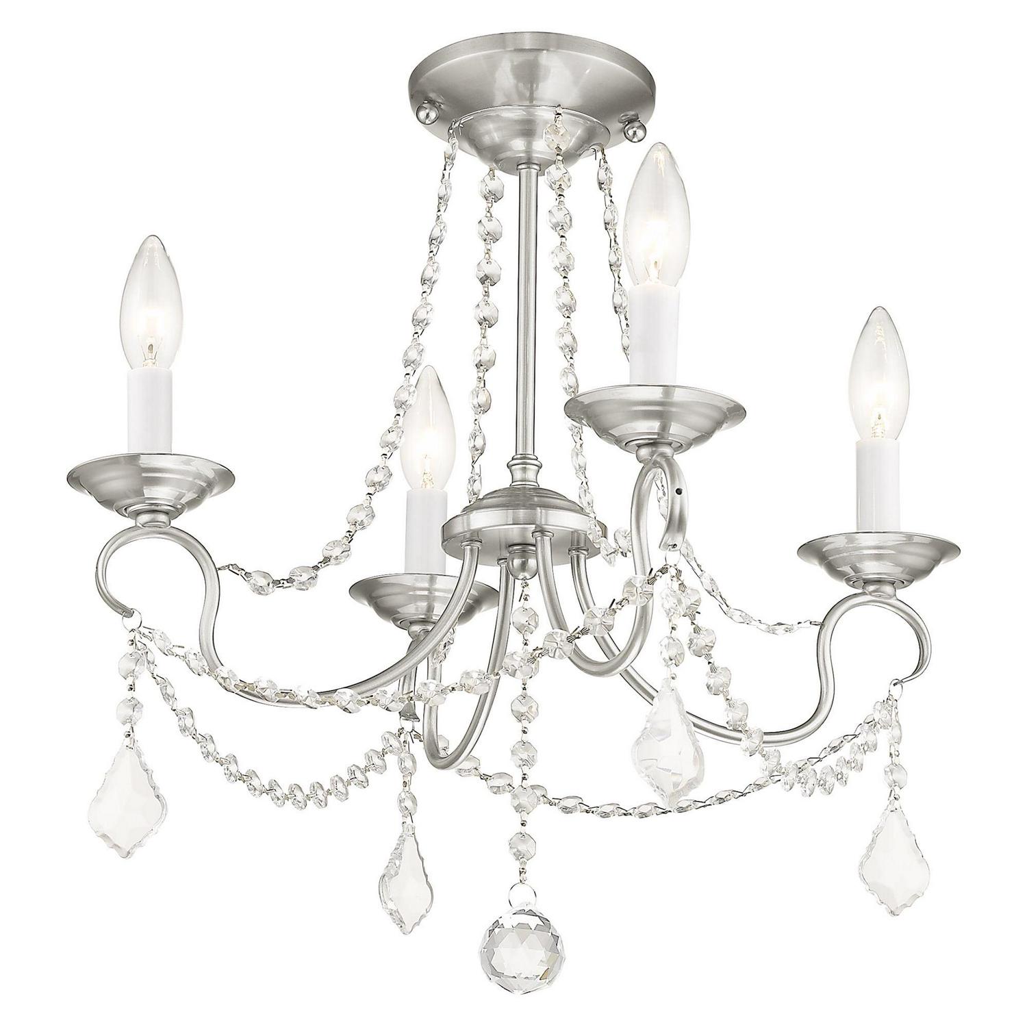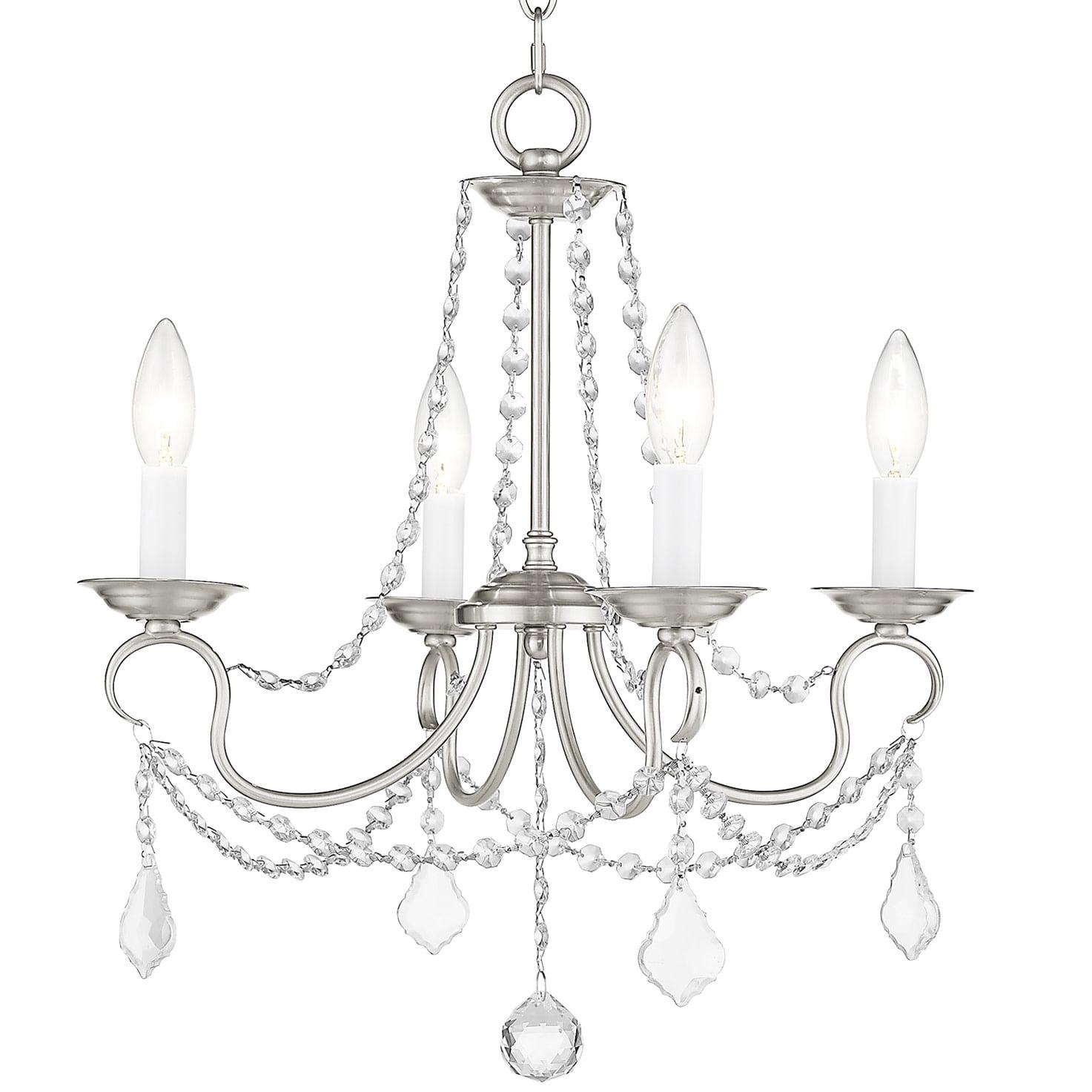 This intricately accented and masterfully forged four light mini chandelier is from the Pennington collection. Finish is a brushed nickel and features include gracefully sculpted arms and with sparkling clear crystal.