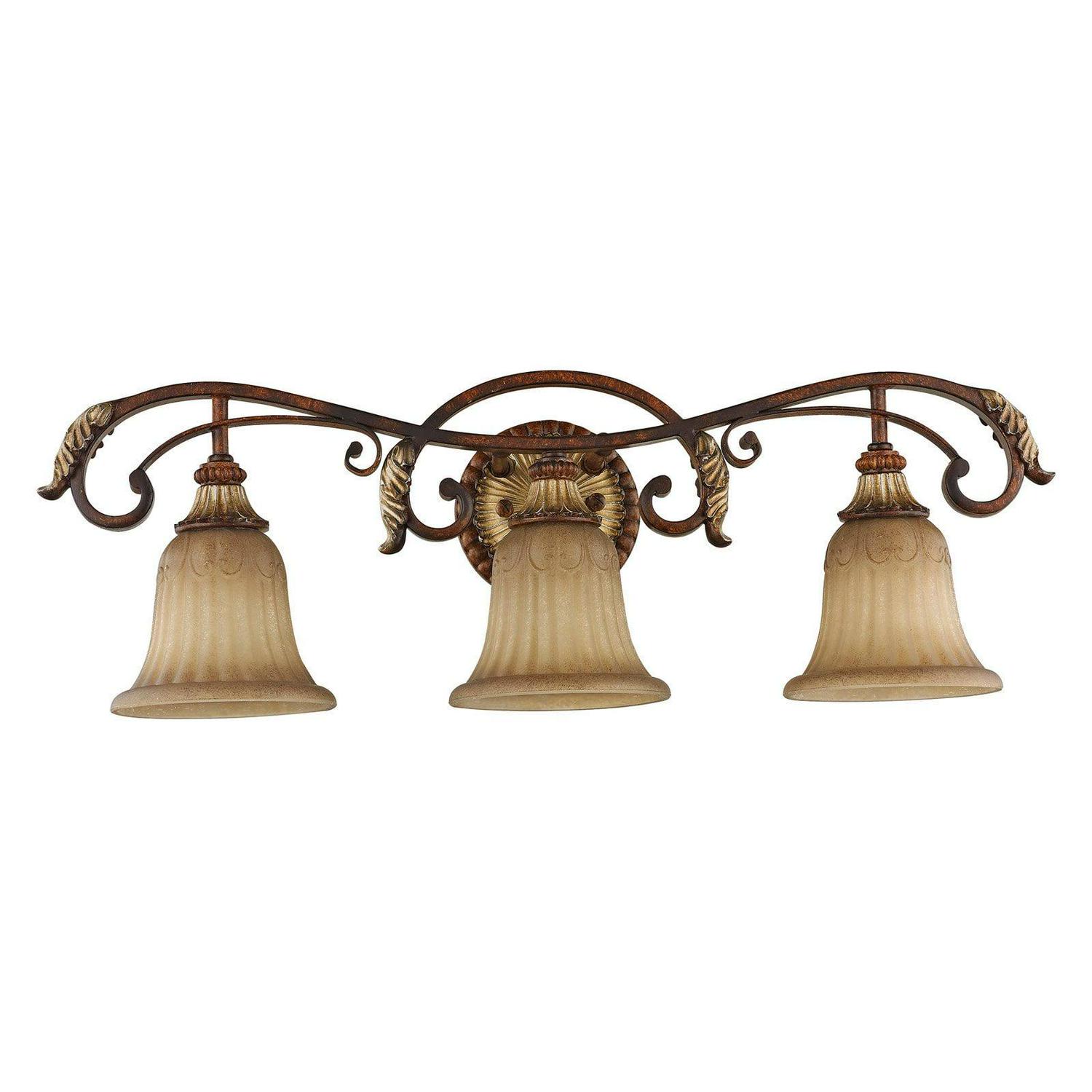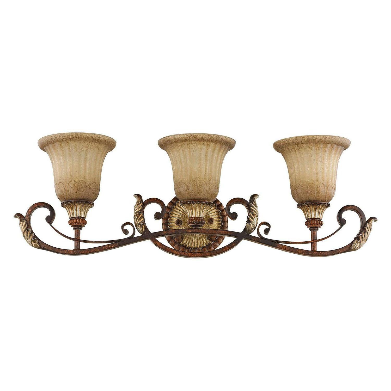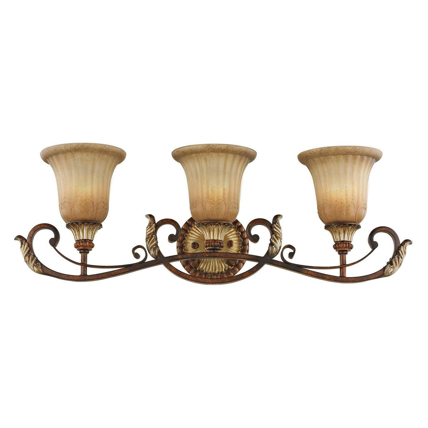 Livex Lighting-8553-63-Collection: Villa Verona, Material: Resin, Finish Color: Verona Bronze/Aged Gold Leaf, Width: 30″, Height: 9.25″, Depth: 7.5″, Height From Outlet Box: 5.75″, Backplate Width: 5.5″, Lamping Type: Incandescent, Number Of Bulbs: 3, Wattage: 60 Watts, Moisture Rating: Dry Rated, Desc: The Villa Verona collection of interior lighting features handsomely styled ironwork complete with scrolling details. This bathroom wall light features a verona bronze finish with aged gold leaf accents and rustic art glass. Display casual, traditional style with this beautiful fixture. Mounting Direction: Up/Down / Shade Included: Yes. ,-Villa Verona – 3 Light Bath Vanity in Mediterranean Style – 30 Inches wide by 9.25 Inches high