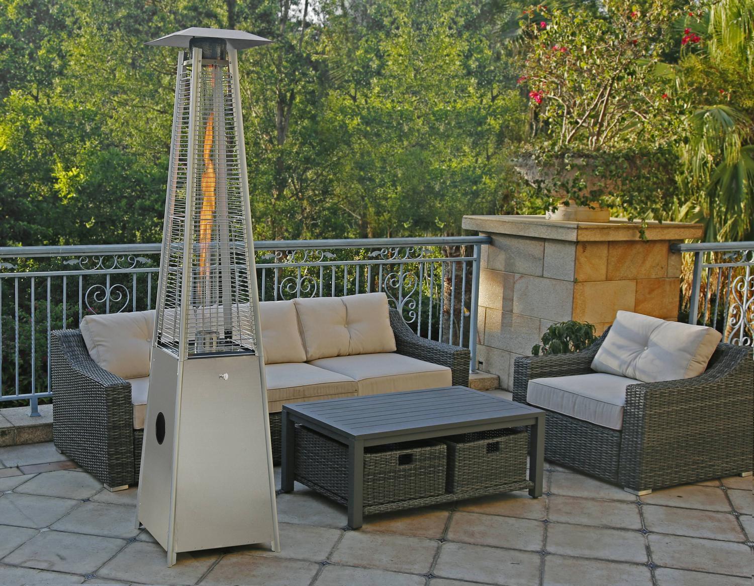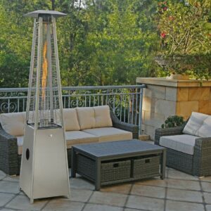 The Living Accents Pyramid LP Gas Patio Heater with Quartz Glass Tube is the perfect combination of function and style. It provides 40,000 BTU of adjustable heat output and will heat approximately an 8 foot radius or about 210 sq ft. It features an elegant pyramid design with a quartz glass tube that encapsulates a mesmerizing flame. It is equipped with an automatic shut-off in case of accident tip-overs and comes with wheels for easy mobility.