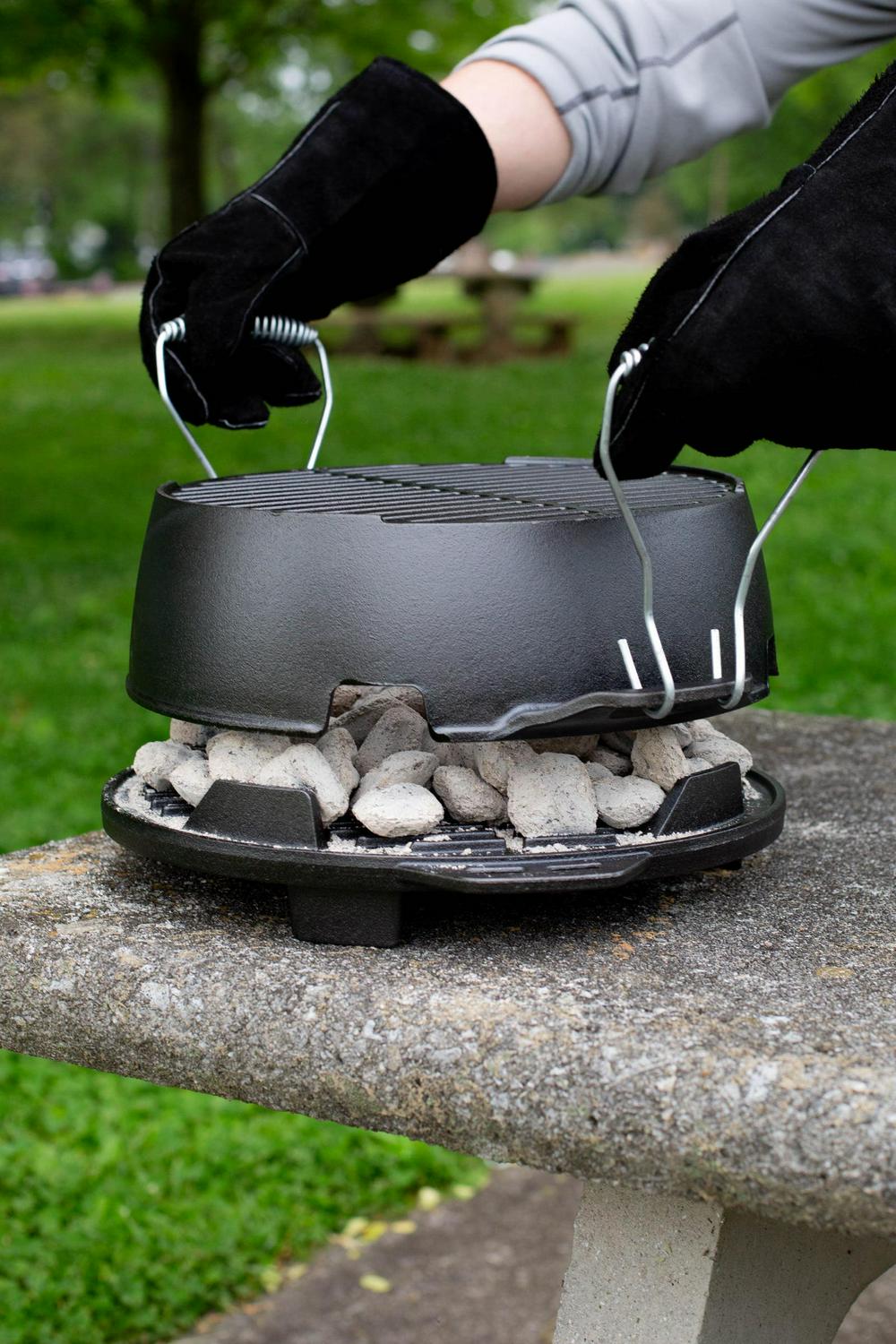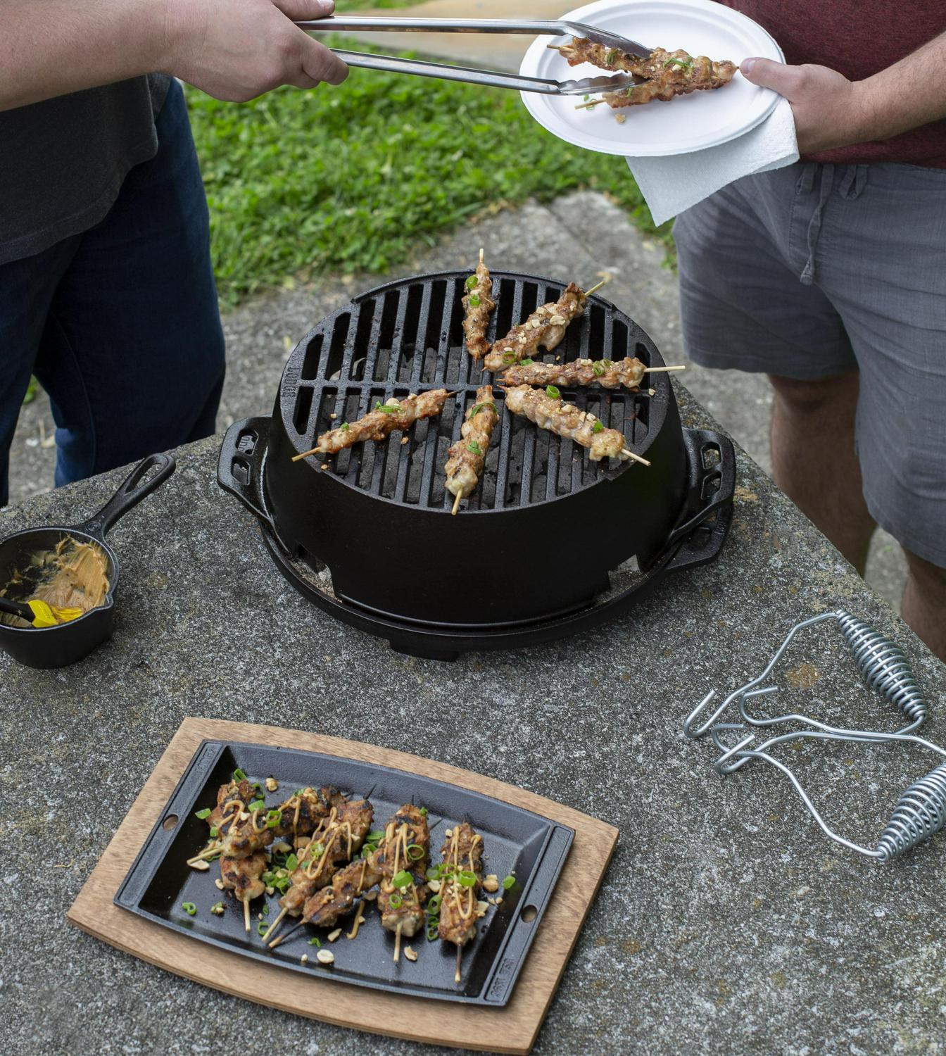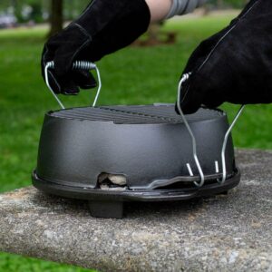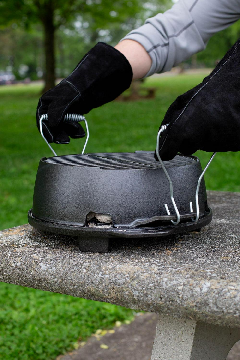 Did someone say celebrate Grab this grill to kickoff the weekend, use on your next vacation, or to christen the first game of the season. This portable cast iron grill brings the fun to any gathering. Made of two pieces of cast iron that require no assembly, its easy-to-use design allows you to simply twist to adjust the draft as you cook. Lodge’s naturally seasoned cooking surface is ready to help you kickoff memorable moments. Comes with a set of Steel Hook & Carry Handles for a secure, safe grip when lifting and moving around the campsite. This grill is the little brother to the Lodge L410 Sportsman Hibachi Grill.