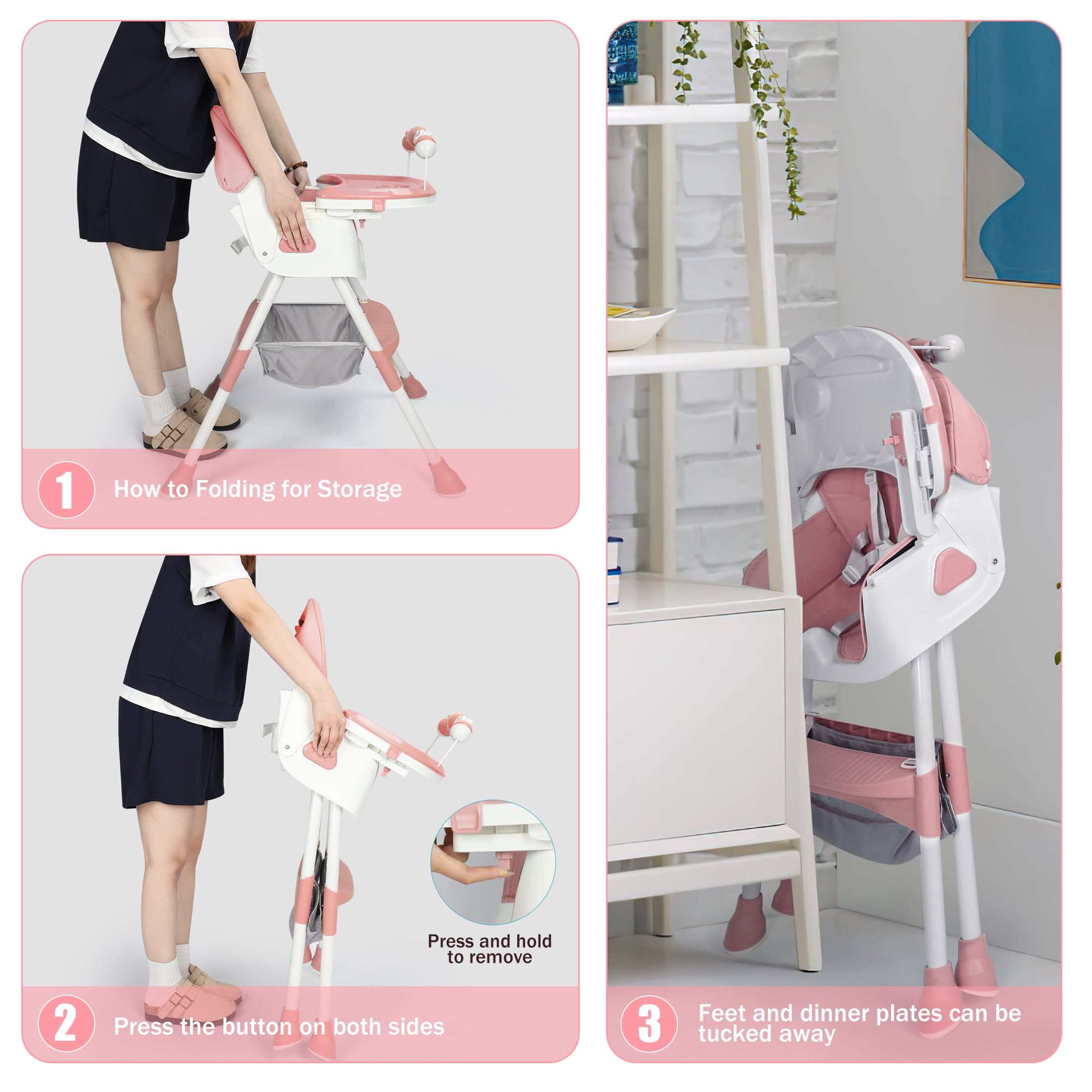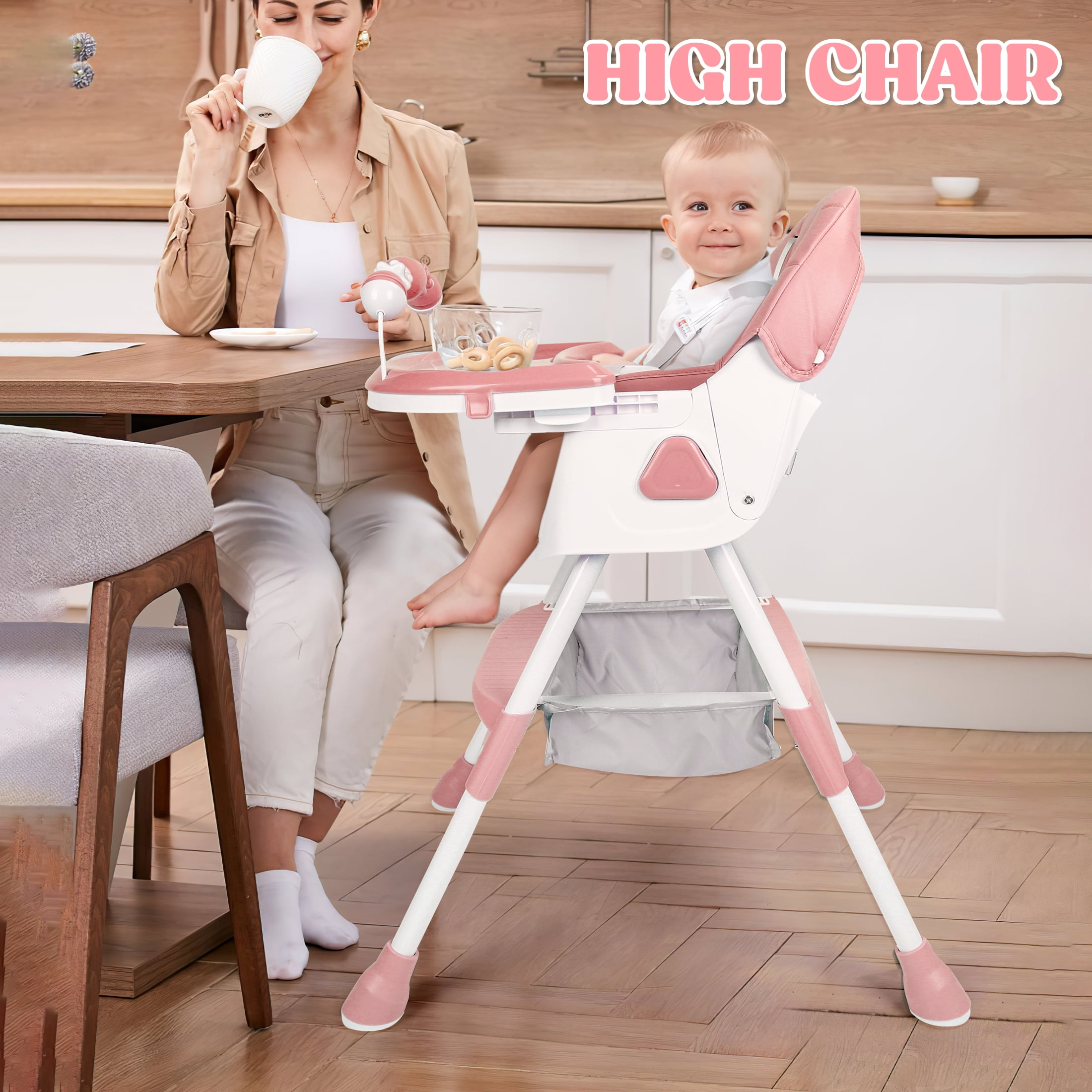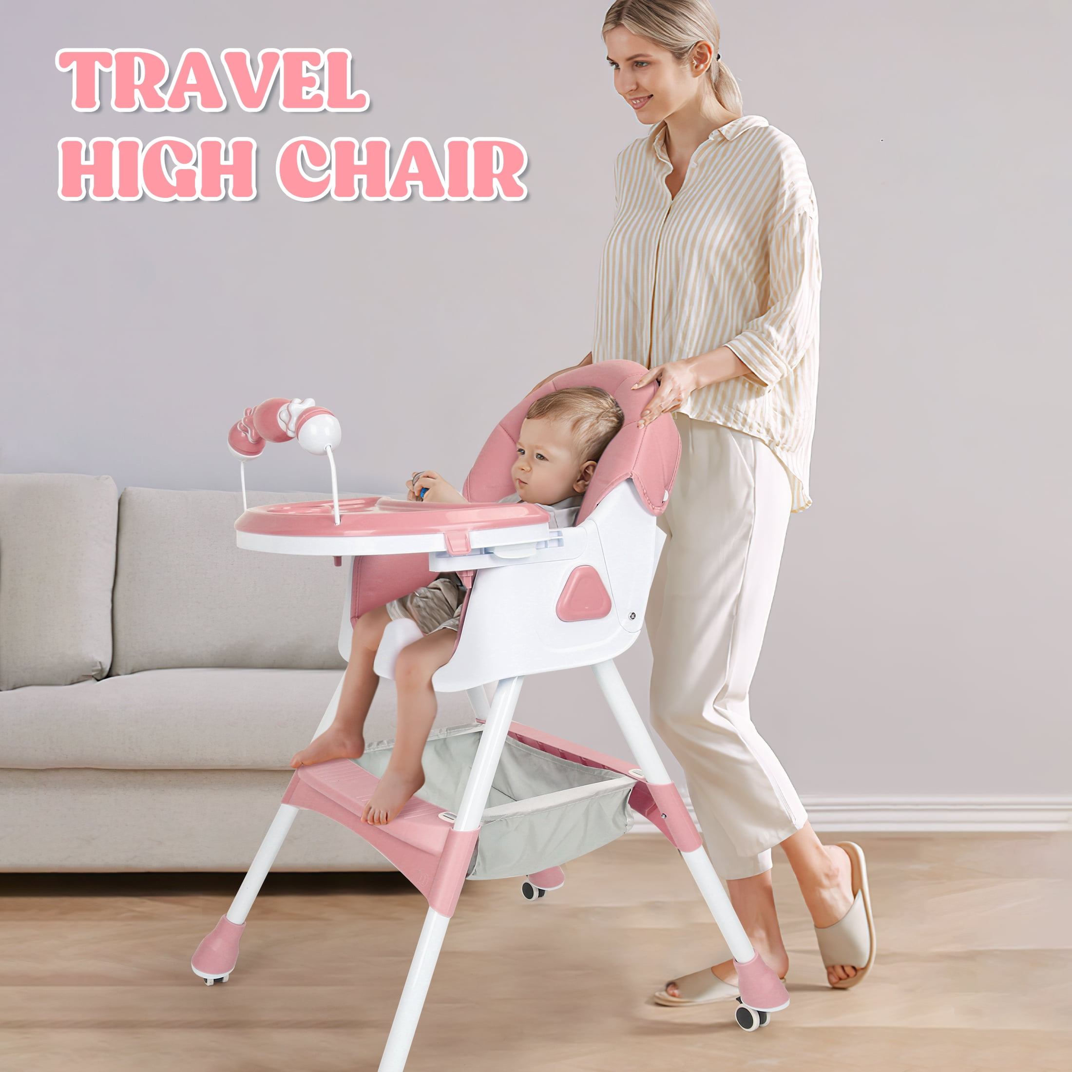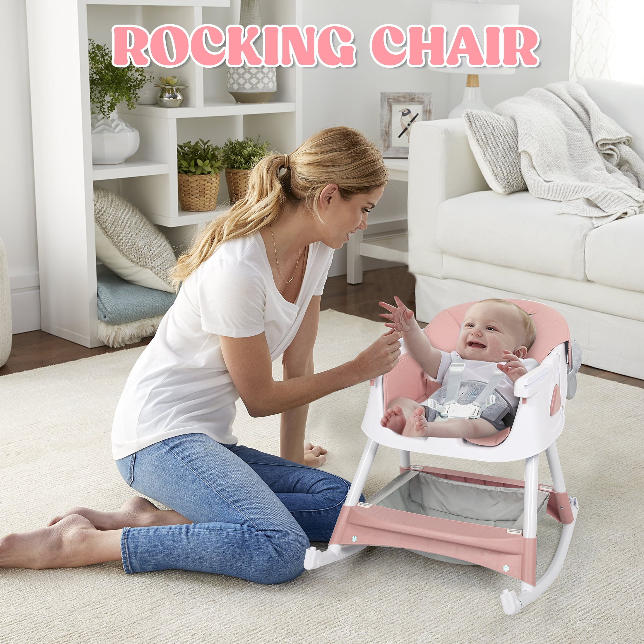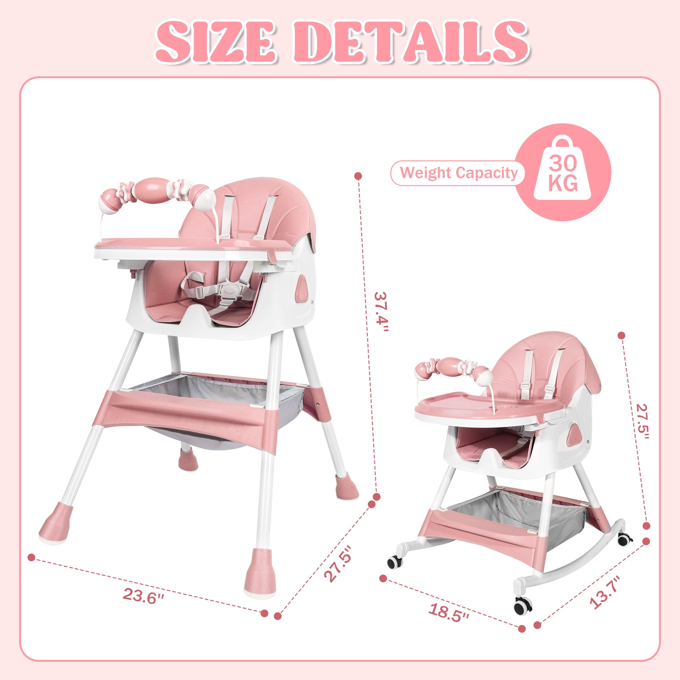 This versatile 4-in-1 high chair feature solid value and smart design, adapt effortlessly to your child’s needs with its functions as a baby high chair, toddler arm chair, baby dining chair, and baby rocking chair. Suitable for ages 6 months to 6 years, which could ensure long-lasting use. It breeze with a removable and telescopic tray, a five-point safety harness, a anti-slip seat crotch and 3-level adjustable backrest to ensure baby maximum comfort and safety. In addition, the high chair for toddlers has 4 removable 360 degree lockable wheels and a large storage basket, which can hold baby toys or other baby’s essentials while taking kids for a walk. The baby booster chair can be effortlessly folded away with a single click to storage out of sight or to pack easily into the car, ideals for home and traveling! Product Specifications: Material: Plastic PP, PU leather pad, Steel pipe Weight: 11.5 Pounds Product Dimensions: 24.8 x 29.53 x 35.83 inches Color: Pink/Blue/Grown Care instructions Wipe the stain with a damp cloths Assembly requie: Yes Age range: 6 Months & Up Max Weight: 60 lbs Package Includes: 1 x Convertible Baby Chair Reminder: Be sure to use your product as directed. If not sure how to assemble and use properly, just contact our world-class, friendly customer service team for quick solutions.