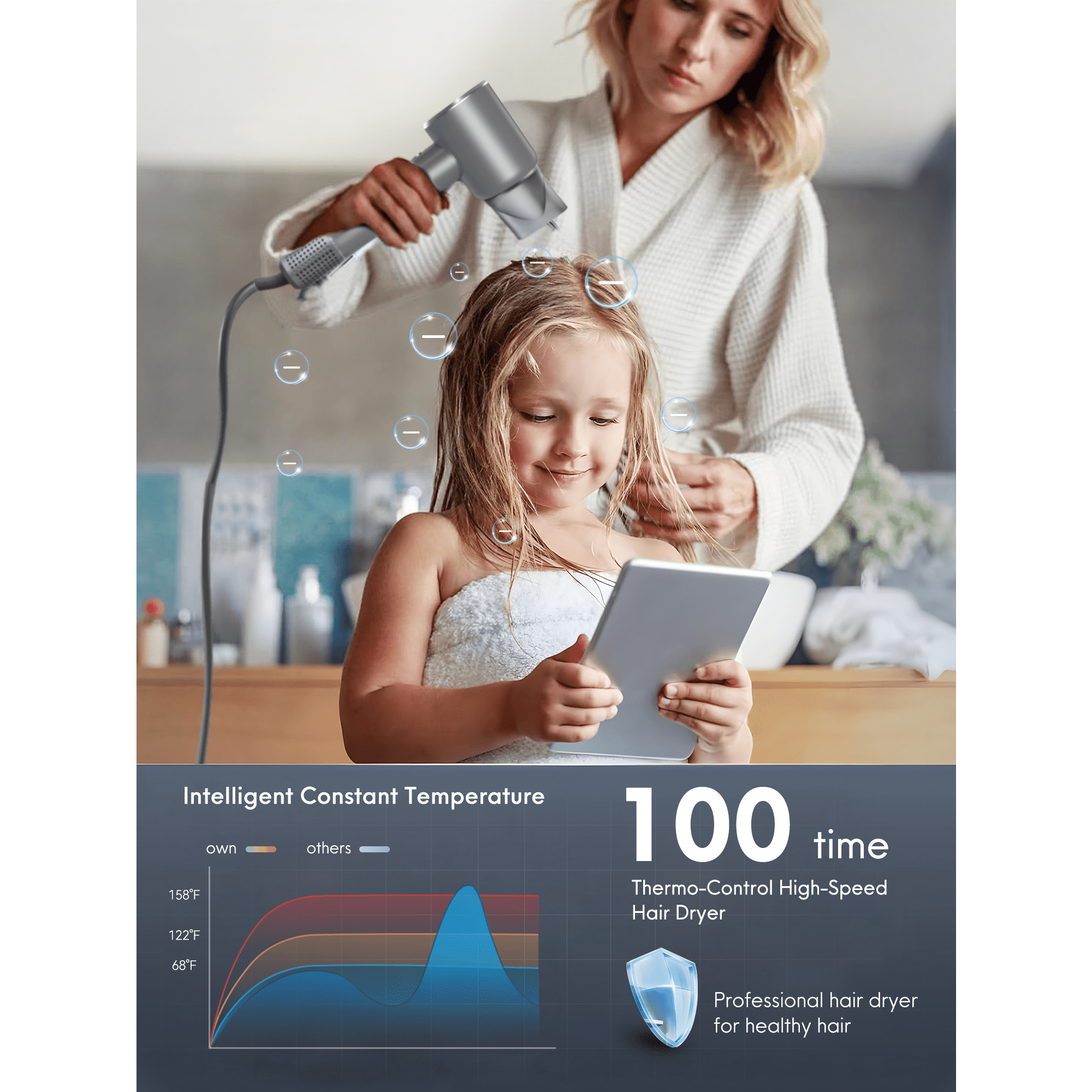 【Fast Drying Power】 Unleash the speed with our hair dryer featuring a 110,000RPM high-speed brushless motor. This upgraded powerhouse delivers an impressive airflow of 25m/s, making your drying experience up to 3 times faster than conventional hairdryers. Whether you have short or long hair, it takes just 3-8 minutes to achieve the perfect dryness. 【Negative Ion Magic】 Our ionic hair dryer releases 200 million negative ions, reducing static electricity, minimizing frizz, and enhancing shine. The magic doesn’t stop there – it locks in moisture, nourishing your hair for a voluminous and healthy look. Say goodbye to dull hair! 【Temperature Control Mastery】 Equipped with an intelligent temperature control processor, this hair dryer adjusts its temperature output over 100 times per second. This ensures your hair is protected from overheating and damage. The built-in high soundproof air intake and PI sound-absorbing material keep noise to a mere 60dB, so you can dry your hair in peace. 【LCD HD Display】 The hairdryer features an HD LCD display for easy control. Switch between 2 speed settings (low/fast) and 3 temperature settings (68°F/140°F/185°F) with the touch of a button. Enjoy the convenience of color-coded lights (blue/orange/red) representing cold/warm/hot air, providing a personalized drying experience. 【Safety Meets Durability】Our newly upgraded hair dryer combines safety with durability. With an ergonomic design, comfortable handle, and user-friendly buttons, it’s perfect for daily use. The 360° rotating magnetic nozzle, along with the removable tight filter, prevents dust and hair from interfering with the drying process. Ideal for home or travel, this portable hair dryer makes a thoughtful gift for friends and family!