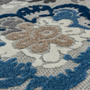 Bring simple sophistication to your sunroom, patio, or kitchen with the abstract floral-inspired design and intriguing texture of this area rug. A versatile, contemporary palette of navy blue, sapphire, slate gray, charcoal, and ivory works seamlessly with a wide range of home decor styles, adding a touch of modern luxury to your indoor or outdoor space. The unique high-low weaving technique creates compelling depth and dimension, adding an extra element of compliment-worthy style to your home. Because these pieces are long-lasting and easy to clean, you can enjoy your favorite space without fear of staining or fading, even in the most high-traffic or spill-prone areas of your home. Each rug is machine made using state-of-the-art, computer-driven looms, and polypropylene yarns create a low profile pile that s stain resistant and fade resistant. Delight in a modern combination of rich color, surprising comfort, and exceptional durability that fits both your home and your lifestyle effortlessly. For indoor or outdoor use. Imported.