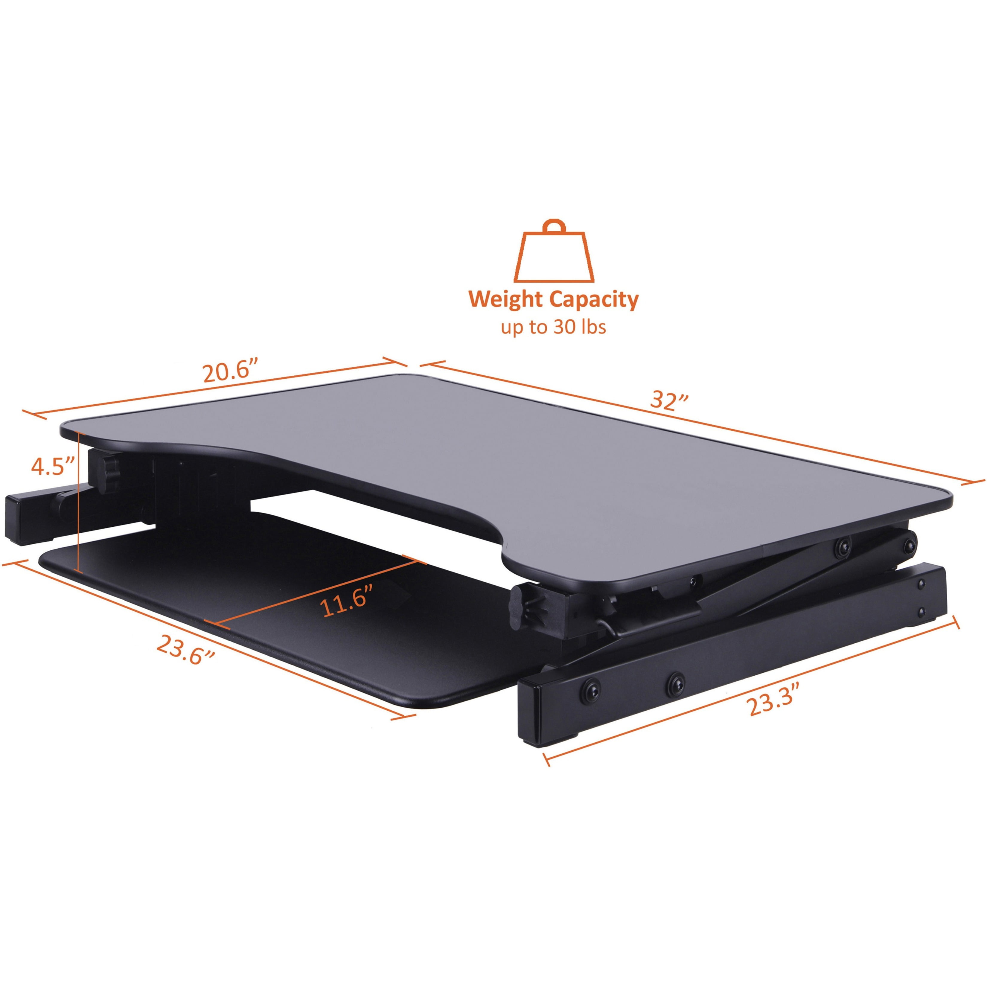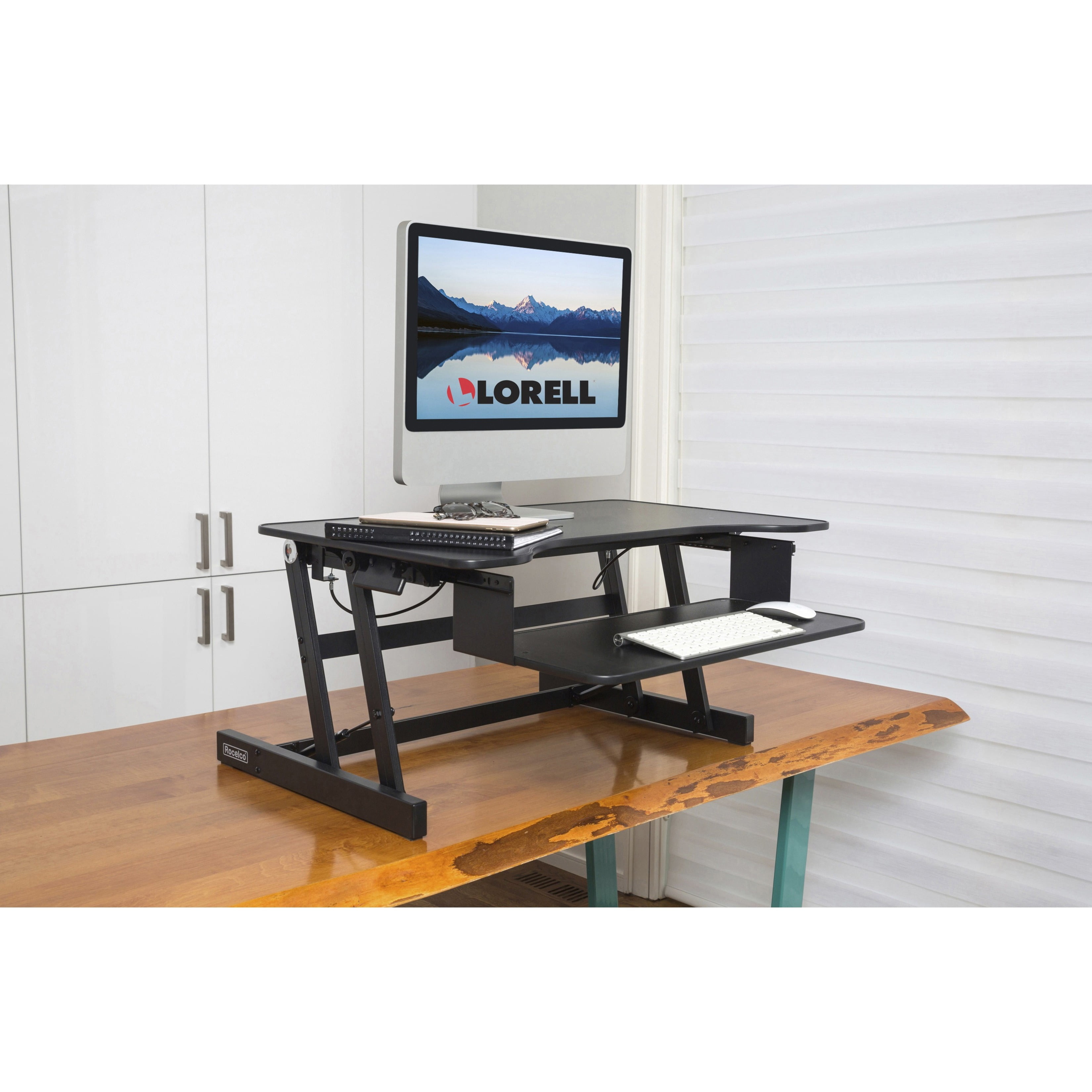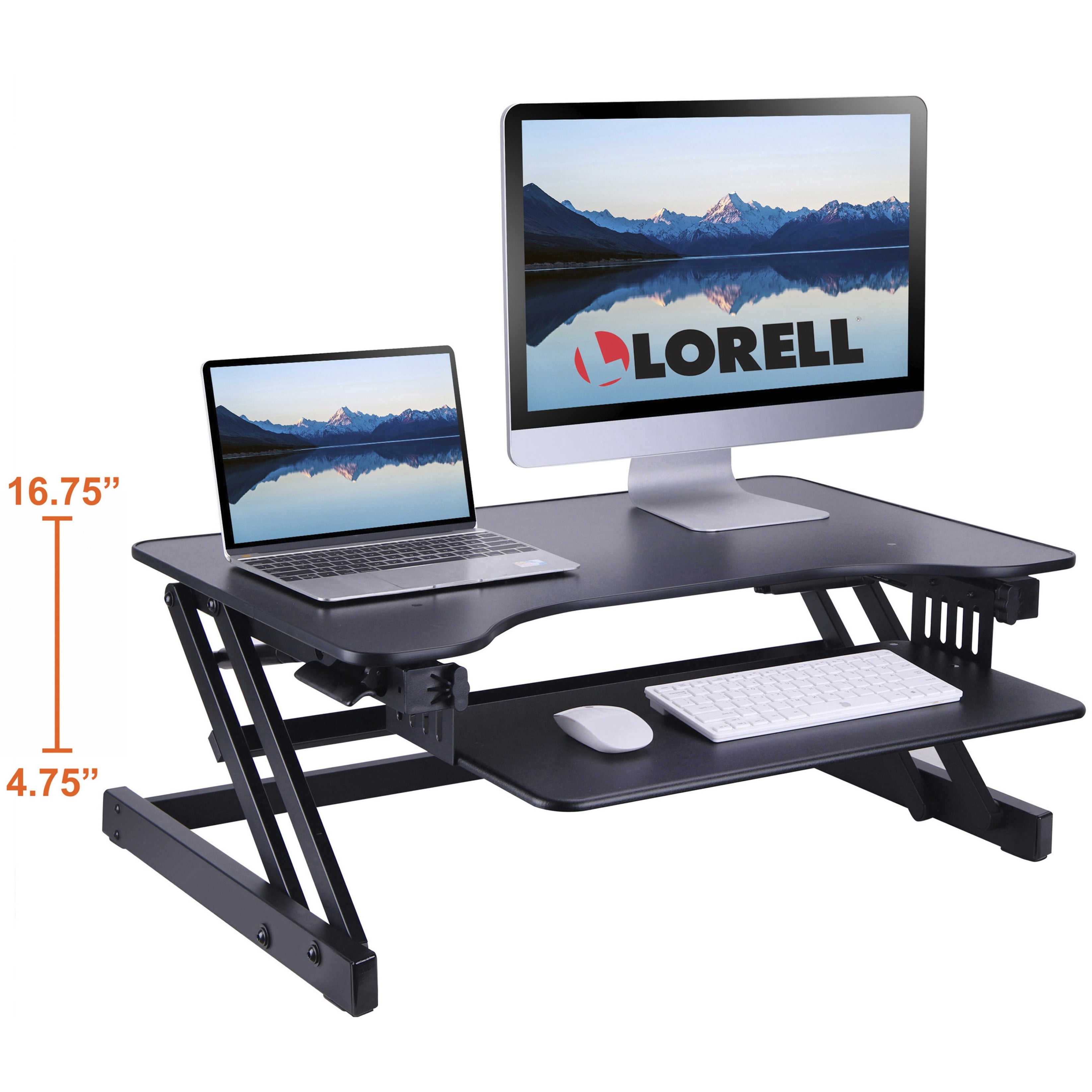 Lorell, LLR81974, Adjustable Desk and Monitor Riser, 1 Each, Black: Designed for 2 monitors or a monitor and laptop Adjustable, ergonomic keyboard tray Adjust the desk riser to 5 heights with a gas spring Easy-to-use side levers for raising and lowering Ready for use, fully assembled Limited 5-year warranty Adjustable computer riser supports up to 50 lbs