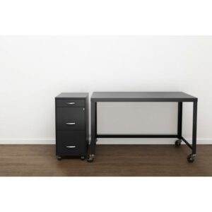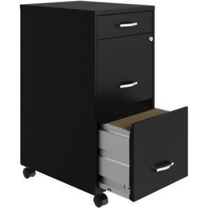 SOHO File Cabinet offers convenient storage of files and supplies with an accessory drawer on top and two file drawers with smooth-glide suspension. The accessory drawer is perfect for cell phones, tablets, cables and small supplies. Full high-side drawers accommodate letter-size, hanging file folders. The lock secures the two top drawers. Four casters allow you to move the pedestal where you need it. Three-drawer organizer also includes an 18″ depth, recessed plastic handles and steel construction with a baked enamel finish.