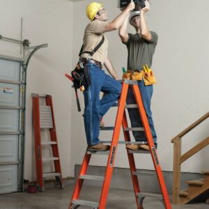 This Louisville Ladder FM1504 4′ Fiberglass Step Ladder has a load capacity of up to 300 lb, which is ANSI Type IA rated. It comes equipped with non-marring Raptor boots that are mechanically fastened to create secure slip-resistant footing. The twin step ladder features the SHOX impact absorption system, heavy-gauge steel hinges, inside spreader braces and double rivet step construction for added support. It is the ideal solution for allowing two users to work on the unit simultaneously. This folding step ladder weighs 19.2 lb so it is not too heavy to lift and hang from a wall or strap to racks on a work vehicle. The Louisville ladder FM1504 4′ fiberglass step ladder meets or exceeds the safety standards set by OSHA, ANSI and CSA.