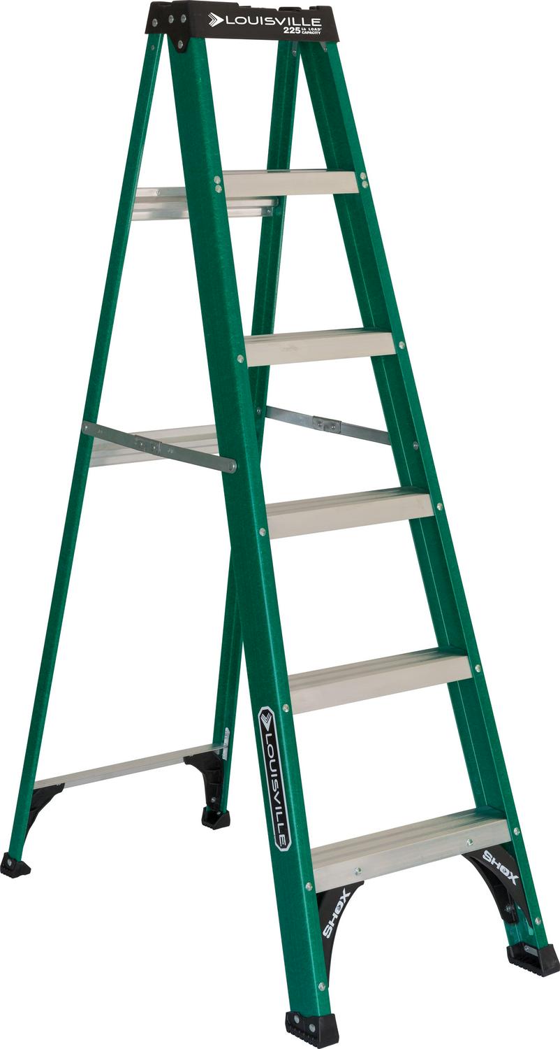 This Louisville 6 foot non-conductive fiberglass step ladder has a load capacity of 225lbs, rated ANSI Type II. This ladder is equipped with the innovative ProTop with multiple tool slots, SHOX impact absorption system, slip-resistant rubber boot, pinch-resistant spreader braces, and wide back braces. The Louisville FS4006 step ladder meets or exceeds the safety standards set by ANSI, CSA, and OSHA.