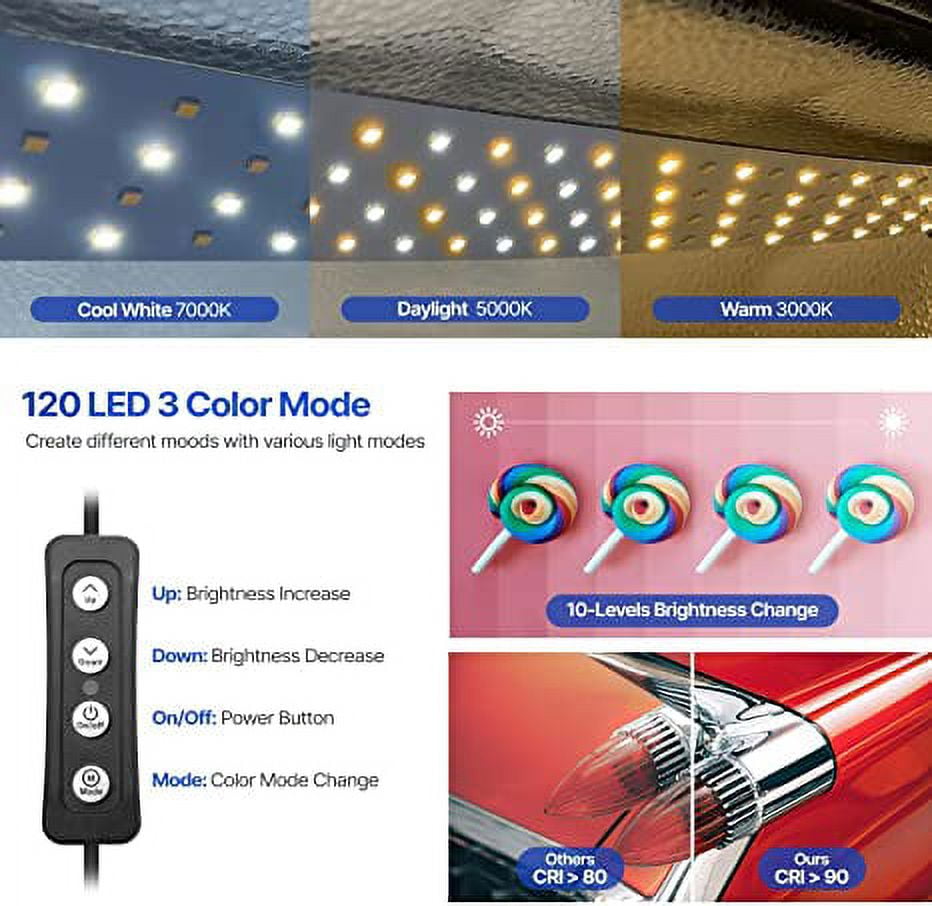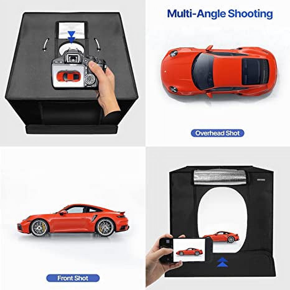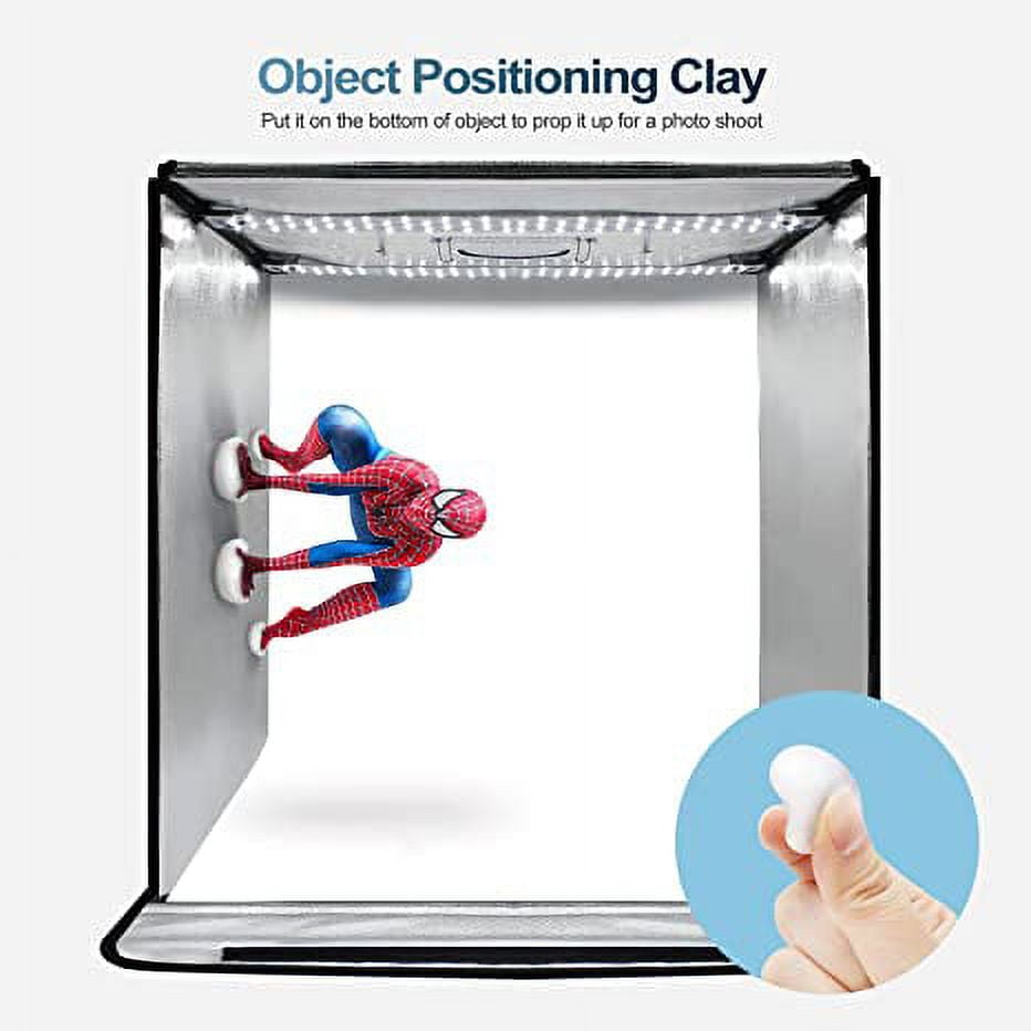 Package Include [1x] 24″ x 24″ Light Box [2x] 120 LED Bar [2x] Elastic Length Adjustable String Clip [1x] Poly Sticky Clay Sheet [1x] White/Black/Sky Blue/Light Orange PVC Background [1x] White Diffuser Cover [10x] Adhesive Velcro Strip [1x] AC110-220V Power Adapter [1x] Product Instruction 【Ceiling String】 Designed for hanging your item easily with elastic length adjustable string. Use a spring clip to hold your object without any hassle. 【Prop-up with Sticky Clay】 Easily set up round objects or irregular shapes with reusable poly sticky clay. Place objects in many different ways. On the floor, on the wall, or stacking on top of other objects. 【Light Level Control / 4000 Lumen】 Position adjustable LED strip. 120 LED Light, 4000LM, 10-level brightness, 3-color mode (White: 7000K Warm: 3000K Daylight: 5000K) 【White Diffuser Cover】 For reflective subjects, install the diffuser cloth under the LED light to prevent the light spots from being reflected on the subjects. Also can be used with an elastic string hanger clip. 【Multi-Angle Angle Shooting】 Front and top openings give you options to take photos with different angles to show the best features and beauty of your object.