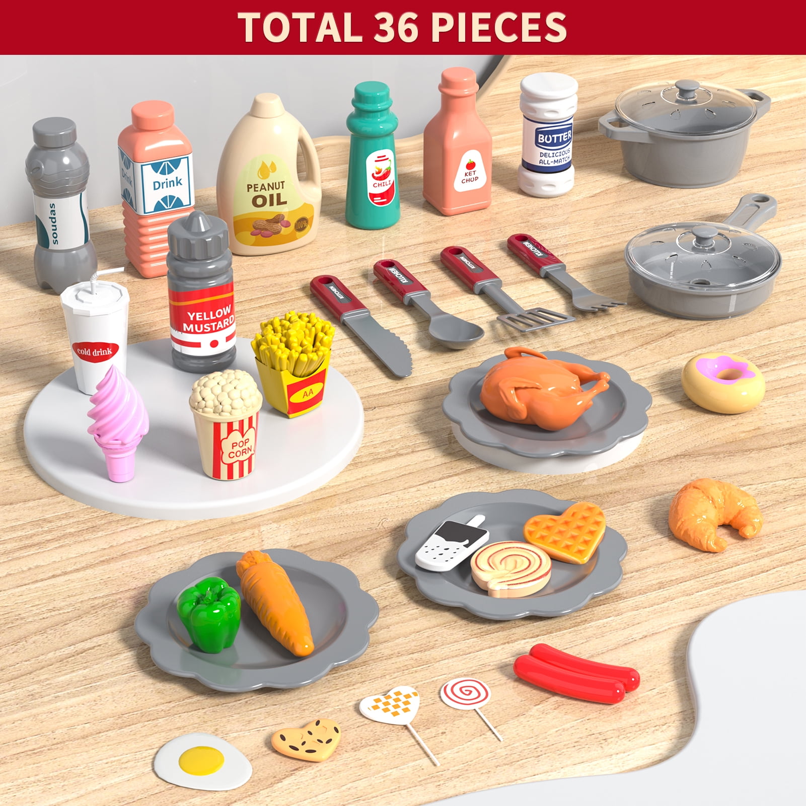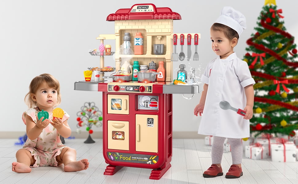 Kids Kitchen Playset Look Like A Real Kitchen Kids can remove the knife and fork from the hanging hook, and wash the vegetables with the sink and faucet. Turn on the play kitchen stove button and you are ready to start cooking. When the toy kitchen sets sizzle sound come out , the food is almost cooked. Don’t forget to add some seasoning to make food more delicious. Toy kitchen sets requires 3 “AA” batteries. (Not Included) Cute Sink Toys & Large Storage Space Kids kitchen playset is designed with water circulation which more environmentally friendly. Kids can wash vegetables, fruits, tableware in the sink. Compared to other toy kitchen sets, our kitchen playset have more storage space. You don’t have to worry about clutter and missing accessoriesKids, the kitchen playset all the cabinets can be opened and stored accessories. Premium Quality & Child Safe Kids kitchen playset is made of high quality ABS eco-friendly plastic, the edges are smooth and burr-free, which is safe for children. Our toy kitchen sets is passed physical and chemical safety tests far beyond the U.S ASTMF-963 and EU EN-71 standards. Perfect for kids role play, educational toy, early development for toddlers, kids intelligent learning toys. Play Kitchen Playset for Toddlers Girls Kids Ages 3+ This kids kitchen playset comes with stickers and instructions, easy to assemble. Toy kitchen sets provides a whole lot of fun and skill during playtime. Kids can role-play with friends or parents and exercise their language & social skills. A never go wrong as a gift/toys which is perfect for birthday party, Christmas, holiday, festival, daily life, and cute nursery.