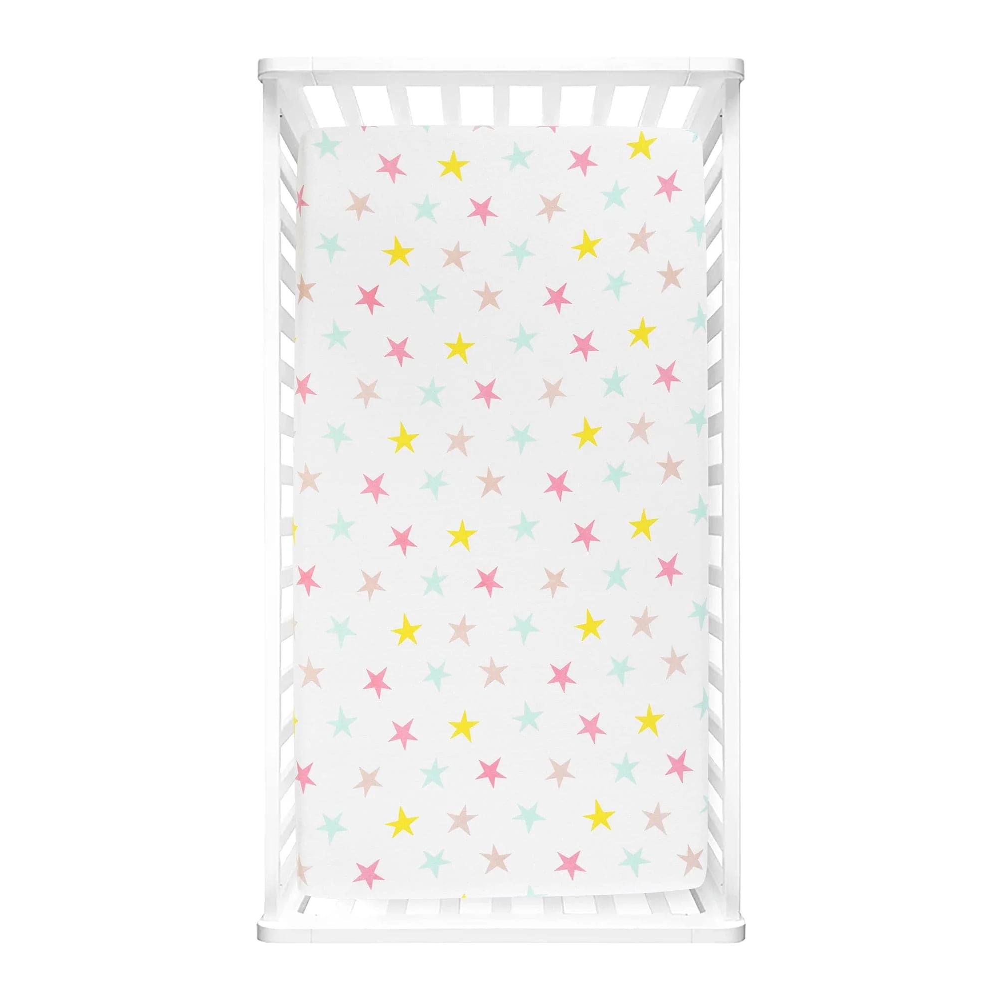 Design your nursery in a magical unicorn theme with this Unicorn Heart Rainbow Star Organic Cotton Fitted Crib Sheet 2 Pack Set. These 100% organic cotton fitted crib sheets are both STANDARD 100 by OEKO-TEX® Certified and GOTS Certified so you can feel comfortable laying your baby down on them. You’ll probably have to change your fitted crib sheet often, so we offer this adorable two-pack set to allow you to keep a clean one on hand while you wash the other. This Unicorn Heart Rainbow Star Organic Cotton Fitted Crib Sheet 2 Pack Set is a great item on its own or as part of the Unicorn Heart Rainbow curated nursery collection. This Unicorn Heart Rainbow Star Organic Cotton Fitted Crib Sheet 2 Pack Set also allows you to mix and match these coordinating styles. One of the fitted crib sheets features a printed design of colorful stars. The second fitted crib sheet has a linen textured print in solid color to easily coordinate with the rest of your nursery decor. Each of the 100% organic cotton fitted crib sheets in this Unicorn Heart Rainbow Star Organic Cotton Fitted Crib Sheet 2 Pack Set measures 28 inches wide by 52 inches long with a 9-inch drop. The elastic band helps keep it securely in place. These should also fit a standard toddler bed. We have enhanced our products for your health and well-being. This Unicorn Heart Rainbow Star Organic Cotton Fitted Crib Sheet 2 Pack Set is STANDARD 100 by OEKO-TEX® certified, which means the fabric, dye and all components have been tested in an independent laboratory and certified against a list of more than 350 harmful substances. This item is also GOTS certified. GOTS is the worldwide leading textile processing standard for organic fibers backed by independent certification of the entire textile supply chain. This certification means that the processing, manufacturing, packaging, labelling, trading and distribution of all textiles are made from at least 95 percent certified organic natural fibers. Rest assured that this product is truly organic and sourced only from green supply chains. Conveniently, this Unicorn Heart Rainbow Star Organic Cotton Fitted Crib Sheet 2 Pack Set is safe to machine wash and tumble dry. Please refer to the care label for full instructions before cleaning. Part of the Unicorn Heart Rainbow Collection. 2-Pack Set Includes Two Fitted Crib Sheets Size (each): 52″L x 28″W + 9″ Drop Fabric Content: 100% Organic Cotton Jersey Geometric Print STANDARD 100 by OEKO-TEX® Certified GOTS Certified Made in India Care Instructions – Machine Wash Cold Separately With Similar Colors. Delicate Cycle. Use Only Non-Chlorine Bleach If Needed. Tumble Dry Low. Use Garment Steamers If Needed.