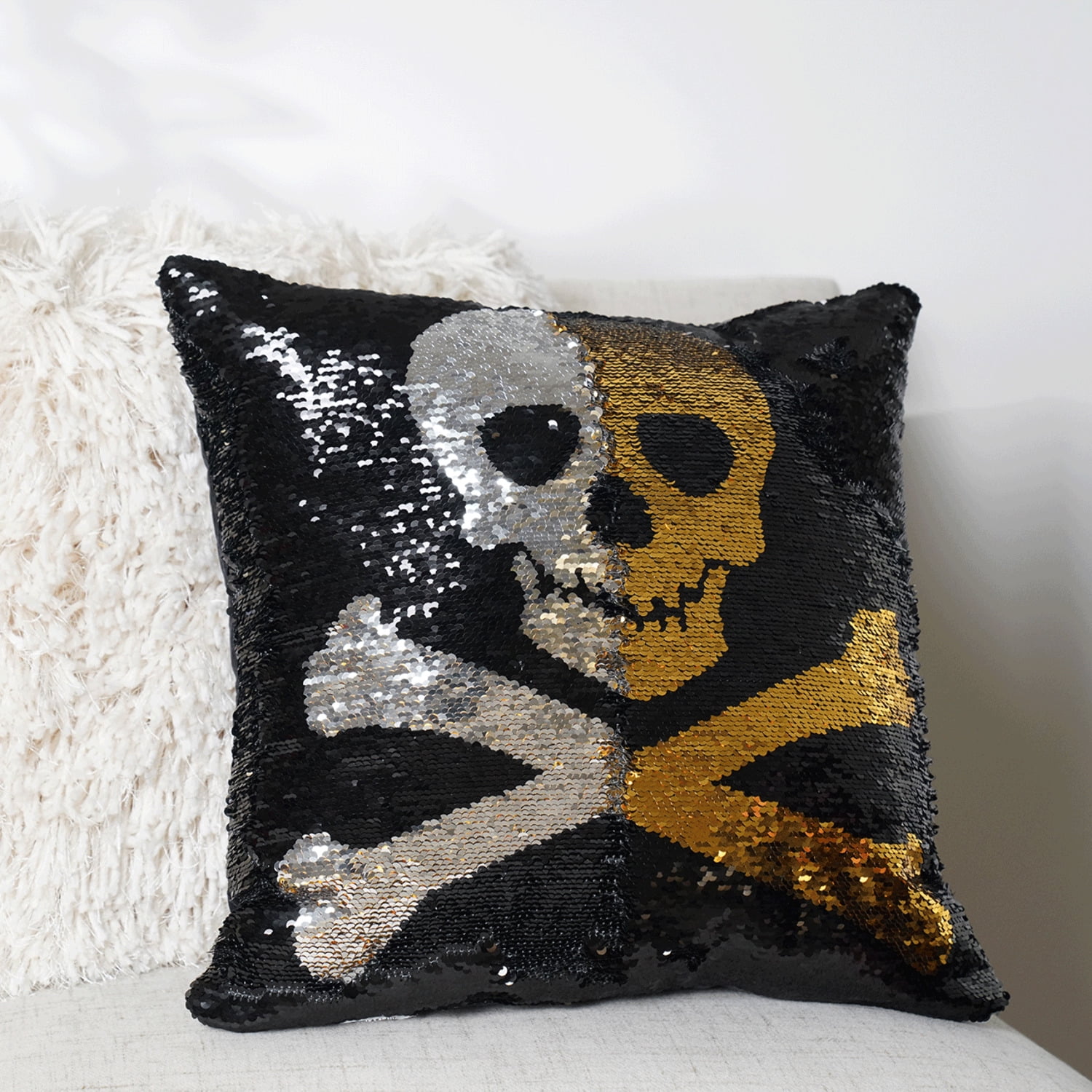 We mixed a pinch of glam with a little bit of Halloween spirit in our cauldron and came up with the perfect Halloween decorative accessory for your home! This Skull And Crossbones Decorative Pillow decorates your beautiful home for spooky season with black and gold sequins over a classic ghostly design. Add some Halloween spookiness to your decor. With its shimmering sequins and skull and crossbones design, this Skull And Crossbones Decorative Pillow is sure to add some Halloween spirit to your space. Whether you’re entertaining guests or just want something fun and festive, this pillow is a holiday must-have. Add this Skull And Crossbones Decorative Pillow to your bed, sofa or entryway bench to add some festive Halloween style to your home. A great size to decorate anywhere in the home, this square pillow is 18 inches by 18 inches. This polyester filled Skull And Crossbones Decorative Pillow has been vacuumed packed as a part of our sustainability commitment to reduce packing material and decrease our carbon footprint. This Skull And Crossbones Decorative Pillow is labeled spot clean only. Please do not machine wash or dry the pillow, as you will risk ruining the pillow. Includes: 1 Pillow Size: 18″W x 18″H Fabric Content: 100% Polyester Fill Content: 100% Polyester Sequins Knife Edge Made In China Care Instructions – Spot Clean