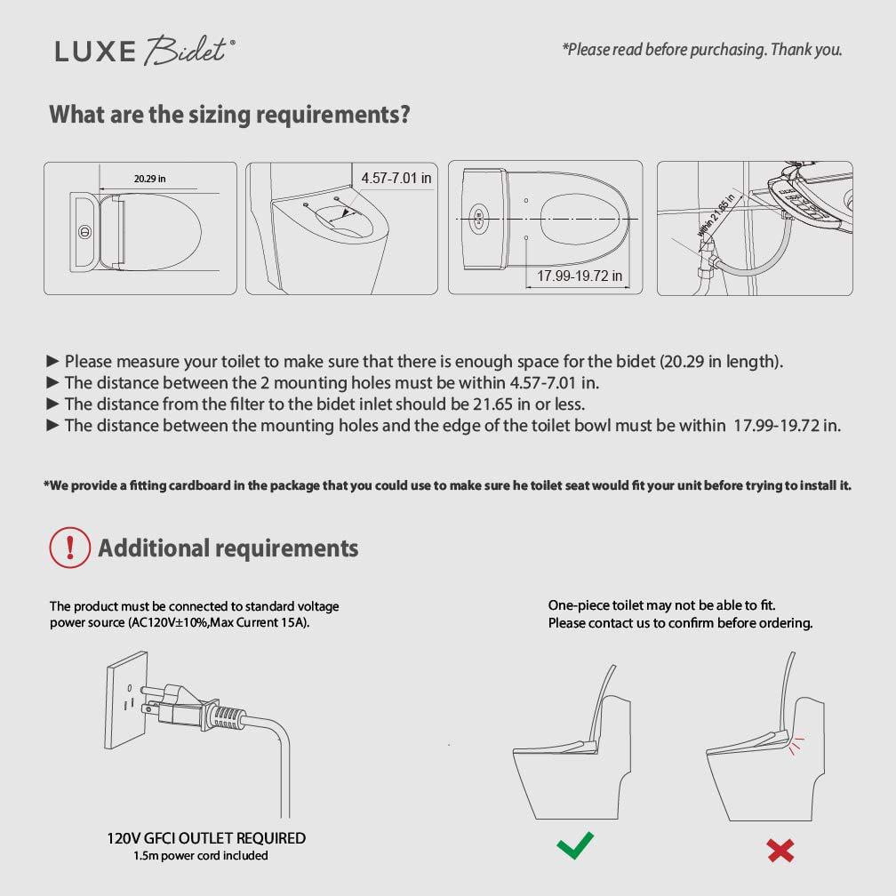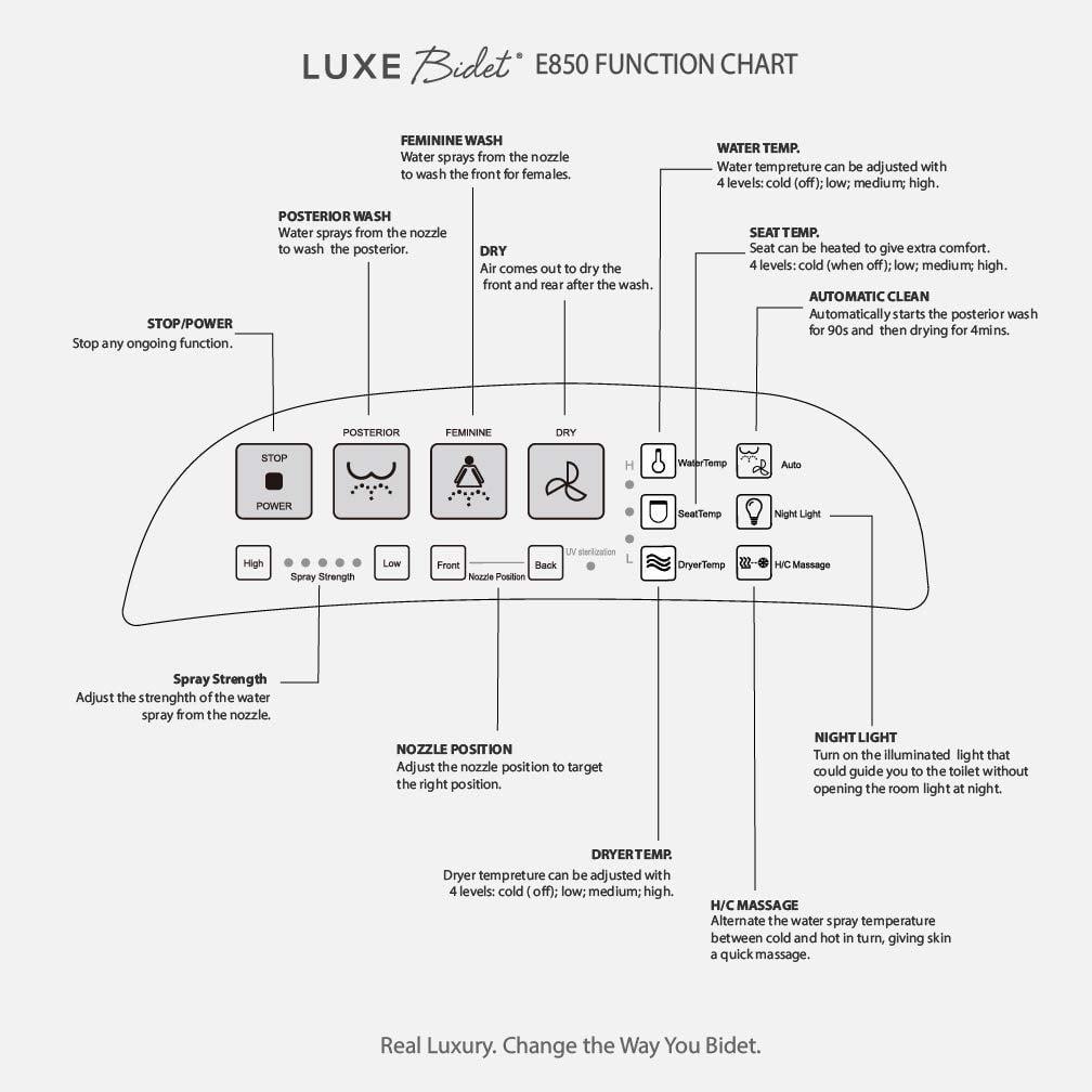 The most luxurious series in our LUXE BIDET family. Luxe E850 is one of the thinnest and most user-friendly electronic bidets in the market. Its sleek design fits not only any bathroom style but also most toilets in the market, both elongated and rounded. The body of the toilet seat is made of high quality materials that are anti-bacterial. This comes in handy especially for elderly persons, children and people who have limited mobility. The 2 in 1 stainless steel nozzle can move back and forth and includes 3 different wash modes: Feminine wash, posterior wash and hot/cold massage wash. To provide the ultimate hygienic experience, the nozzle is sanitized by a powerful UV Sterilization function inside after use. Temperature of the water spray, the toilet seat as well as the air dryer can easily be adjusted to your preference. The seat itself is equipped with a soft-close lid and illuminated LED night light that won t interrupt your sleep at night. If not in use for 24 hours, unit will automatically shut off to save energy. This toilet seat is thoughtfully engineered for a quick and simple install – it also unloads in seconds with one press, saving time and energy whenever you want to clean it.