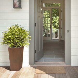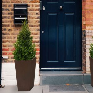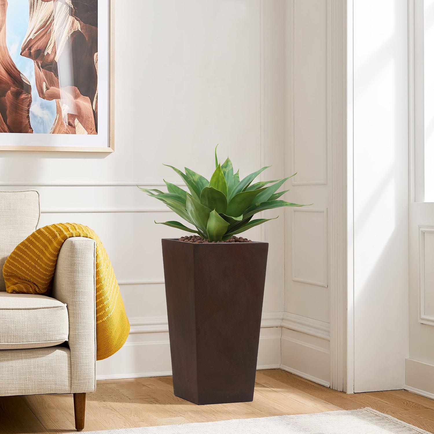 This tall and distinctive planter is the perfect addition to any front entrance. This design showcases a modern sleek square tapered design finished in a rustic brown perfect for the modern home. Designed to live outdoors it is crafted from weather-resistant magnesium oxide that does not mind UV light beaming down or rainstorms rolling through and this planter is durable and designed for all seasons. The planter includes a drainage hole so you can avoid over watering your plant. It also includes a drainage plug so you can place it indoors to freshen up your home as well! Whether on your porch in your sun room or entryway this planter is the perfect complement to your style!