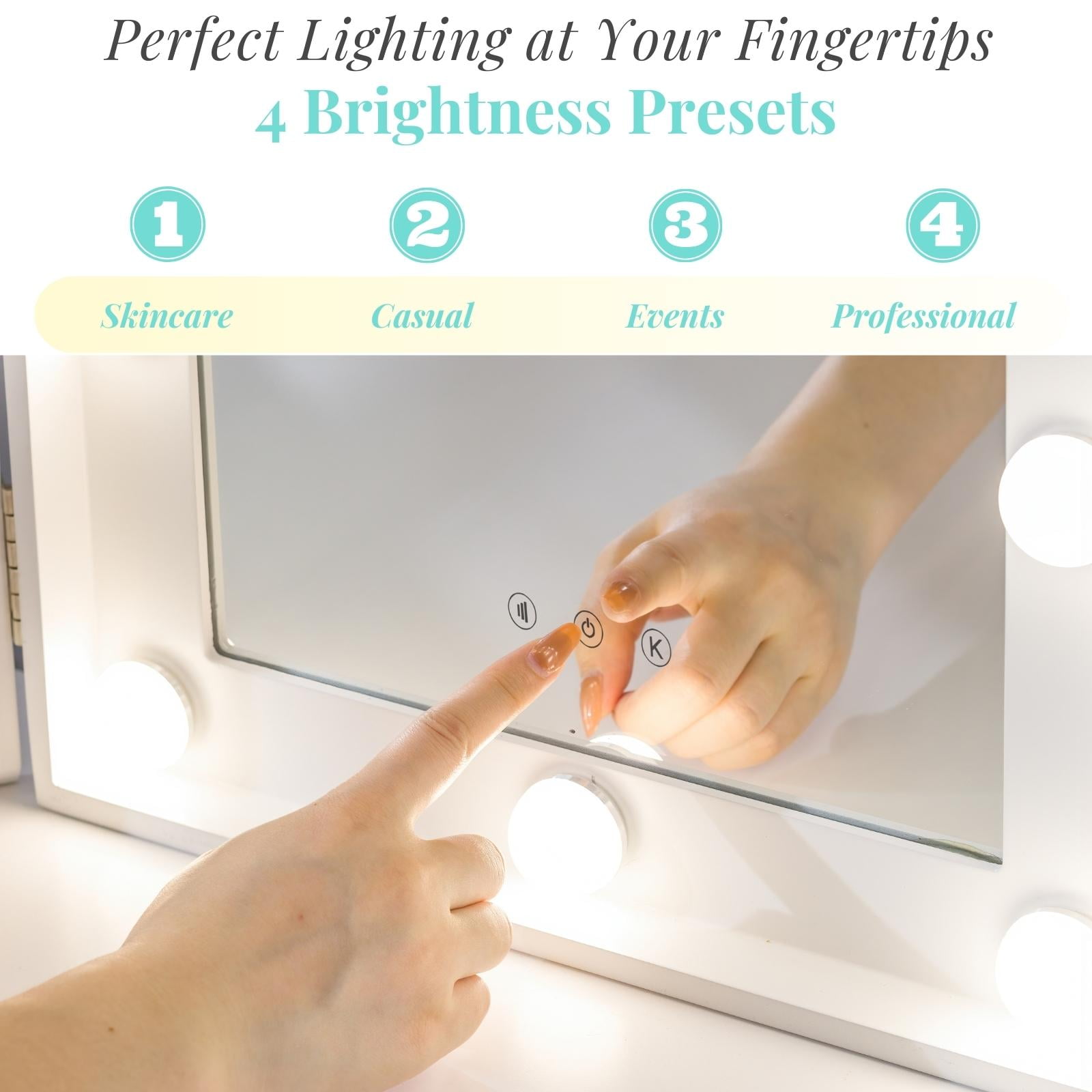 VIVID DETAILS Experience crystal clear views with an ULTRA-HD glass mirror No dark and blurry reflections HOLLYWOOD FEELS Ergonomic trifold frame design Natural curve elements soften your vanity areas sharp angles See your face from 2 angles and contour each side with precision Just like a Hollywood vanity mirror DAZZLE & GLOW Light up your face with 10 bright LED’s This makeup mirror lights ensures you can perfect your makeup no matter the lighting conditions SMART FUNCTIONS Convenient memory functions save your last desired brightness settings Customize your makeup looks in advance with color temperature settings Hazard-free auto-shut off features One touch power and adjustment button FAMILY SAFE SGS Certified Safe NO Formaldehyde NO Toxic Heavy Metals WE GO THE EXTRA MILE RISK-FREE GUARANTEE- Our hollywood vanity mirror with lights offers a 30-day money-back guarantee TALK TO US- 24/7 Customer service representatives are ready to handle your concerns. Zoom in on the details Ultra- HD glass mir ror Trifold mirror design Black velvet backside USB- DC ca ble One-touch sensor Brightness control adjustments Smart Memory Functions Assembly Options Tabletop Option, easy setup and perfect for your mirror with lights From the Manufacturer Adaptor output should be no more than 5V-2A for optimum performance Using 12V adapter may damage the chip In-box Items Vanity Mirror x 1 USB-DC cable x 1 Instructions Manual x 1