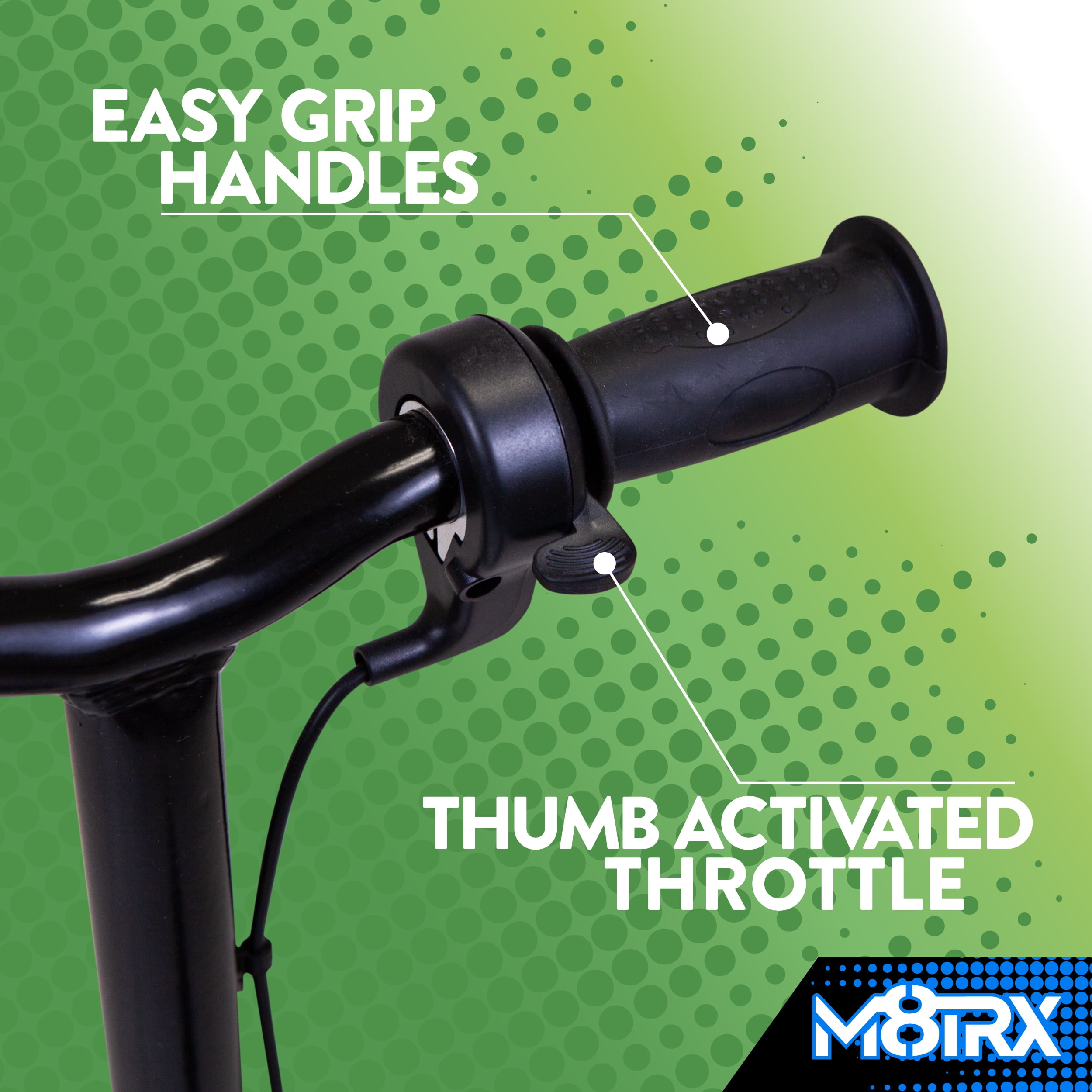 Reach top speeds of 8mph on the M8TRX electric scooter Kids can ride this electric scooter for up to 40 mins Perfect for children between the ages of 6-12 years old Easy grip handles; thumb activated throttle 12V battery and high-torque electric motor High-impact 130mm urethane wheels Two color options: the boys (male) electric scooter in blue and the girls (female) electric scooter in pink