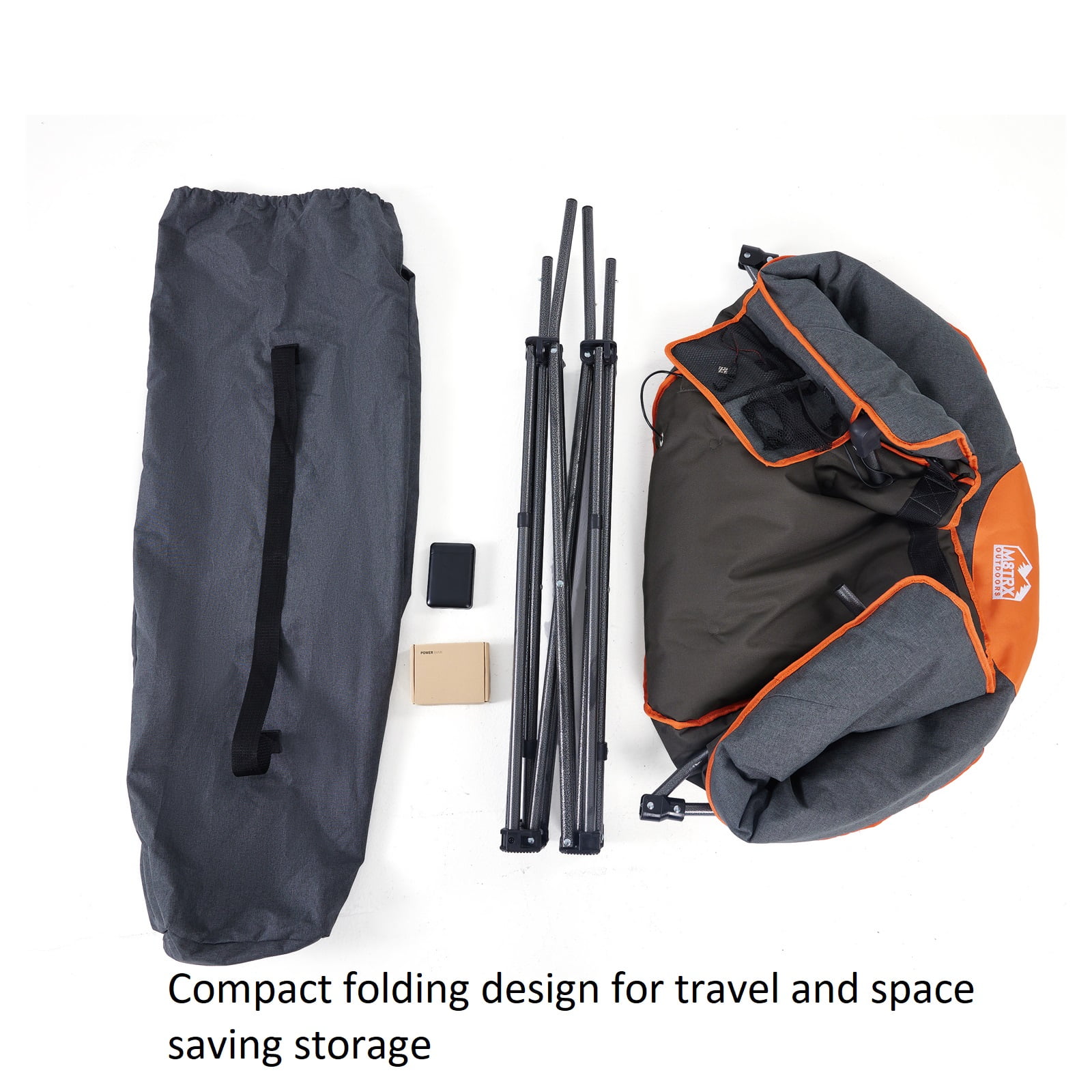 Extra-wide back and seat Dims W33.5″ x D29″ x H36.6″ Weight capacity of 350 LBS 600D Oxford fabric Non-slip wide footpads and sturdy steel frame Compact folding design for travel and space saving storage Battery and storage pockets Control buttons Heating Pad with 5,000mAH Power Bank 5V Li-polymer battery comes equipped with on/off button, LED battery life indicator, Micro and Type C charging port and a USB port for mobile charging
