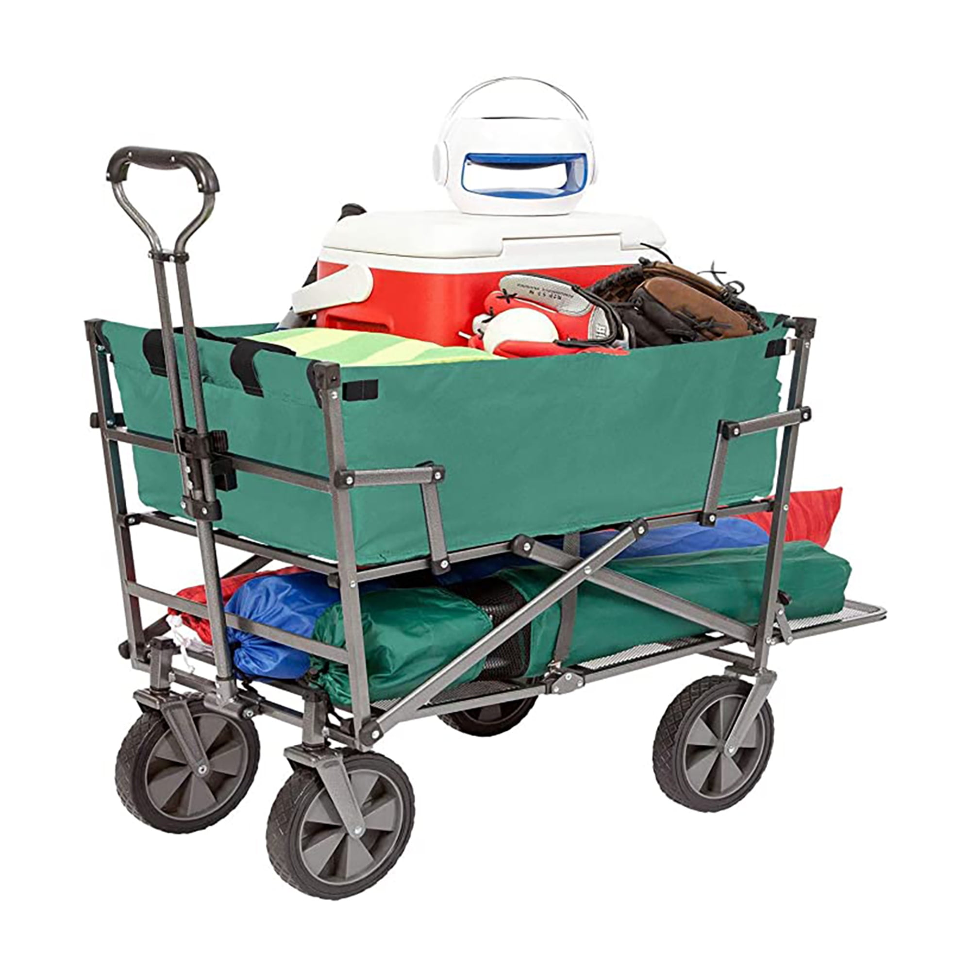 Mac Sports Double Decker Wagons – ROOMY INTERIOR: Large capacity folding wagon cart opens to 32.5″ L x 17.5″ W x 10.5″ H with even more storage using the 2-tier design for larger items and included wagon straps for security. BUILT WITH QUALITY: Heavy duty frame made from powder-coated steel paired with durable 600D Fabric and PVC materials make a heavy duty fold up wagon that won’t tear, is durable and waterproof. UNFOLD TWO-TIER WAGON IN SECONDS: Fold and store your foldable wagon cart in seconds and unfold without any hassle. Have it ready no matter where you are, groceries, beach trips, or camping. ALL-TERRAIN PORTABLE WAGON: Pushing and pulling has never been easier and more convenient with wheels built for any surface. Use it on grassy fields, forests, sandy beaches, and more without problem. LIGHTWEIGHT DURABLE DESIGN: Carry around and store your wagon cart with wheels foldable without any issue thanks to it’s 27.6lb weight and heavy-duty PVC clasps which lock the folding utility wagon. ALLOY STEEL FRAME.With its double utility tier level of cart storage, many people have found it to add extra value when loading items of different sizes and lengths. The top basket is great for carrying balls, sporting items, food, ice boxes and the like while the bottom shelf tier is best utilized for longer items like folded chairs, large tents and collapsible canopies.MACSPORTS® ADVENTURE READY – At MACSPORTS® we believe life is a journey and that some of it should be spent outdoors. Let us help you enjoy those moments with equipment that you can trust and rely on. BUILT TOUGH – We boast high-quality fabric and steel that will endure for many years. They’re flexible, compact and mobile, easy to use, and comfortable equipment that will enhance your outdoor experience.