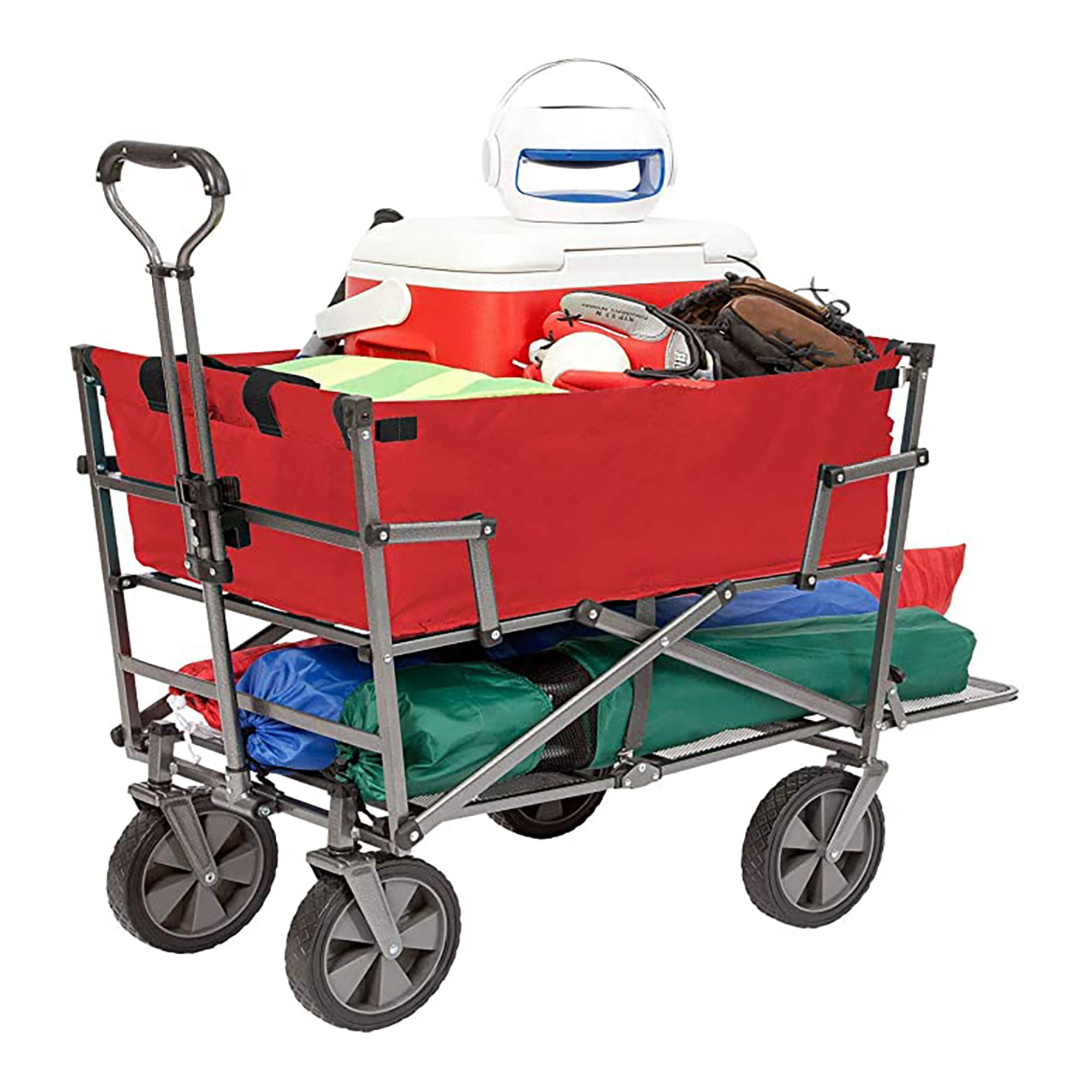 Mac Sports Double Decker Wagons – ROOMY INTERIOR: Large capacity folding wagon cart opens to 32.5″ L x 17.5″ W x 10.5″ H with even more storage using the 2-tier design for larger items and included wagon straps for security. BUILT WITH QUALITY: Heavy duty frame made from powder-coated steel paired with durable 600D Fabric and PVC materials make a heavy duty fold up wagon that won’t tear, is durable and waterproof. UNFOLD TWO-TIER WAGON IN SECONDS: Fold and store your foldable wagon cart in seconds and unfold without any hassle. Have it ready no matter where you are, groceries, beach trips, or camping. ALL-TERRAIN PORTABLE WAGON: Pushing and pulling has never been easier and more convenient with wheels built for any surface. Use it on grassy fields, forests, sandy beaches, and more without problem. LIGHTWEIGHT DURABLE DESIGN: Carry around and store your wagon cart with wheels foldable without any issue thanks to it’s 27.6lb weight and heavy-duty PVC clasps which lock the folding utility wagon. ALLOY STEEL FRAME.With its double utility tier level of cart storage, many people have found it to add extra value when loading items of different sizes and lengths. The top basket is great for carrying balls, sporting items, food, ice boxes and the like while the bottom shelf tier is best utilized for longer items like folded chairs, large tents and collapsible canopies.MACSPORTS® ADVENTURE READY – At MACSPORTS® we believe life is a journey and that some of it should be spent outdoors. Let us help you enjoy those moments with equipment that you can trust and rely on. BUILT TOUGH – We boast high-quality fabric and steel that will endure for many years. They’re flexible, compact and mobile, easy to use, and comfortable equipment that will enhance your outdoor experience.