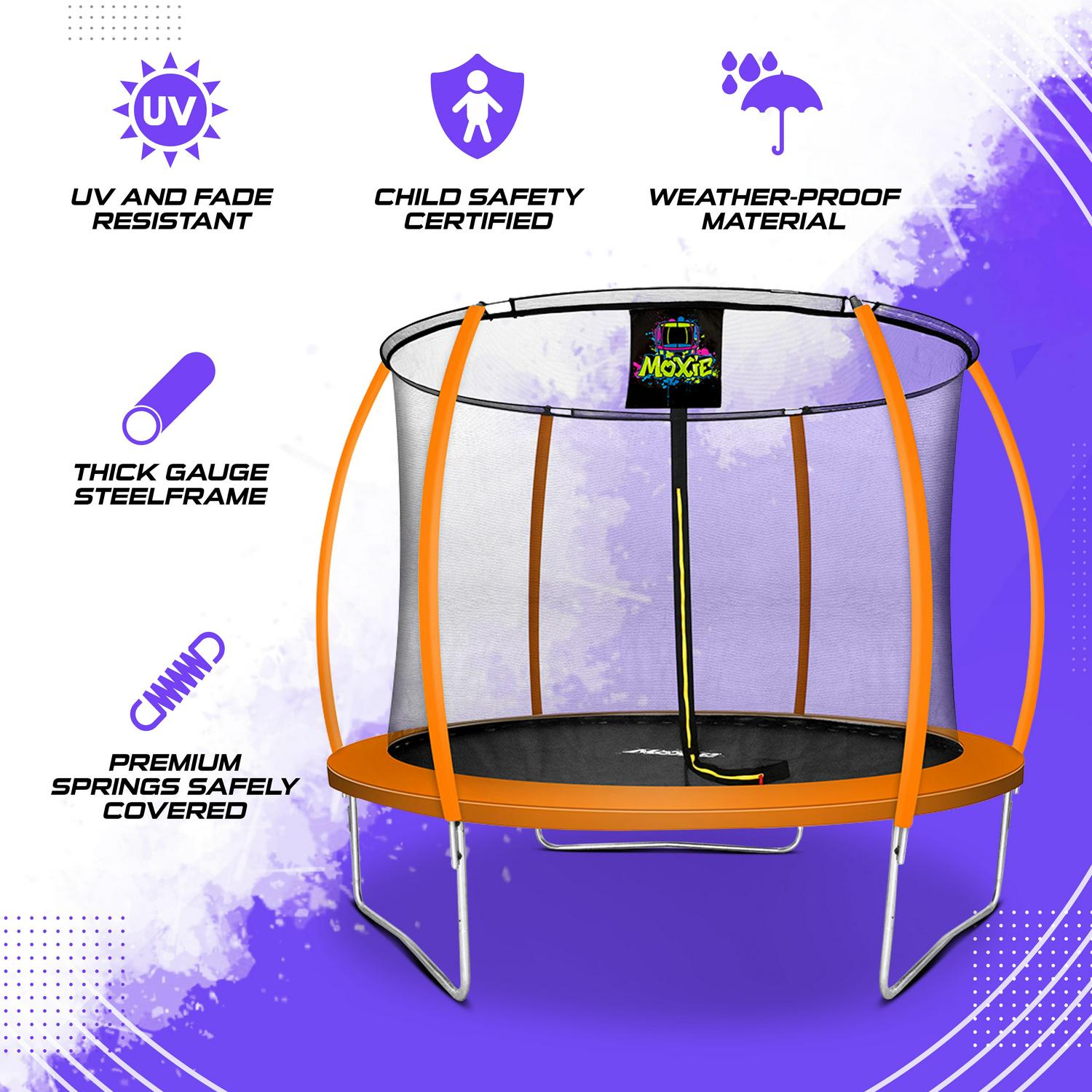 – Durability & Longevity This Moxie by Upper Bounce Pumpkin-Shaped trampoline is built with rust and corrosion-resistant materials. This outdoor trampoline is capable of enduring all types of outdoor weather conditions. Its heavy-gouged powder-coated steel structure prevents it from breaking or bending easily.