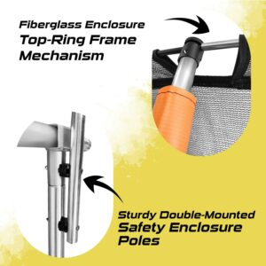 – Easy Assembly This trampoline with enclosure comes with an easy-to-understand assembly instructions manual and takes about 2 adults to assemble it comfortably. All the tools you need are included in the packaging.