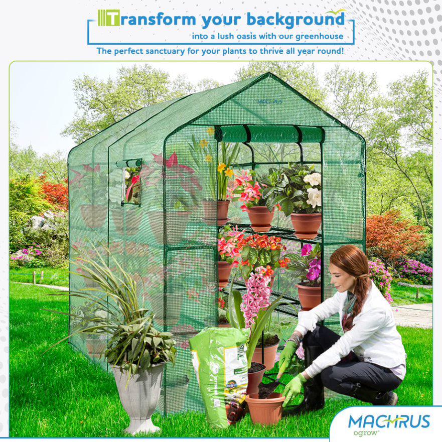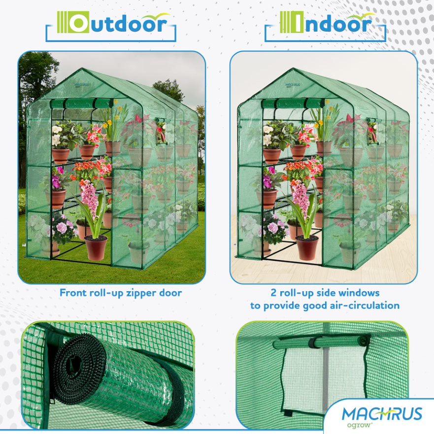 If you are a garden hobbyist who would like to enjoy flowers and vegetables year-round, the Machrus Ogrow Walk-In Greenhouse is perfect for you. Our greenhouses are affordable, lightweight, and easy to assemble. No hardware is needed for assembly! Designed with special heavy-duty high-quality plastic connectors for easy 123 assemblies. Perfect for your garden, lawn, and backyard and even for patios, decks, and balconies right in front of your home! A sturdy dark green powder-coated frame for rust protection offers plenty of support for pots and trays. Its heavy-duty clear plastic cover with full-length roll-up gives you easy access to the Inside where there are sturdy shelves for pots and seed trays. Machrus’s Ogrow Walk-In Greenhouse connects with Hook and Loop connection vs. ties that other greenhouses offer thus giving you longer-lasting durability. It features a heavy-duty cover construction that ensures years of reliable use and won t fade or crack in sun. Walk-in Design offers enough growing space for large size plants and easy access & ventilation.