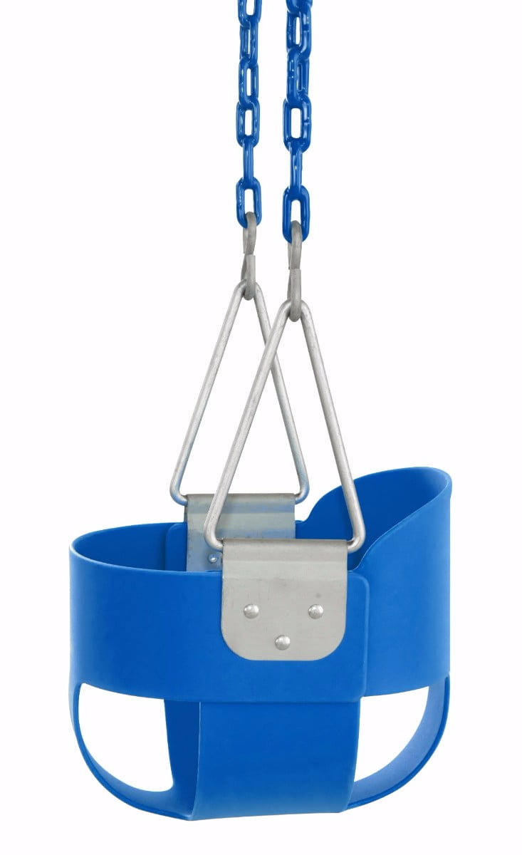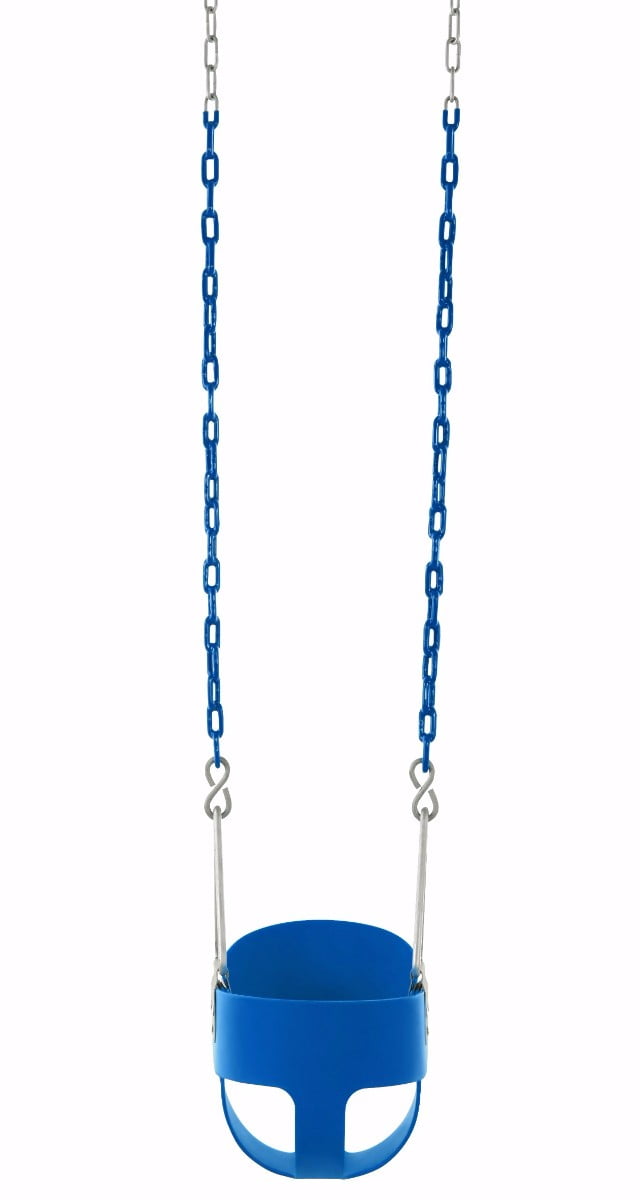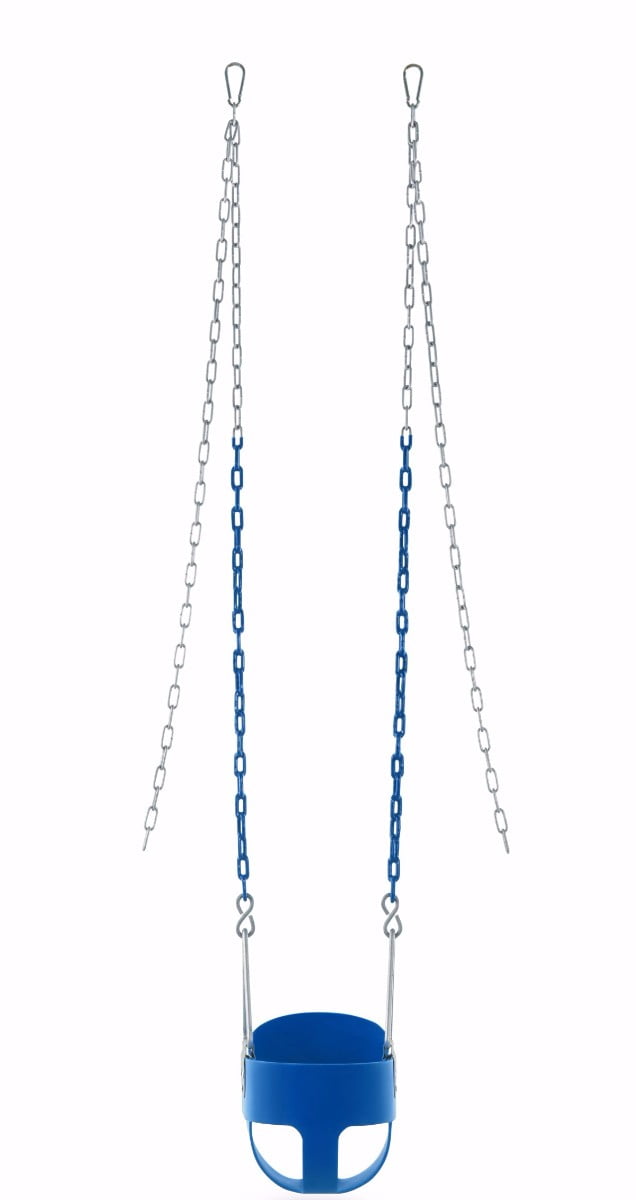 Seat constructed with highly durable copolymer plastic, with dacromet coated hardware designed to be rust-free. The extra high seat-back provides extra support and comfort for the child, making it a swing your child will be reluctant to leave. Extra-long 102” adjustable dacromet chains – corrosion resistant; with vinyl coating on 32” for pinch-free fun and a more comfortable ride. This bucket swing is the perfect size for infants, toddlers, or a baby. Add to an existing swing set.